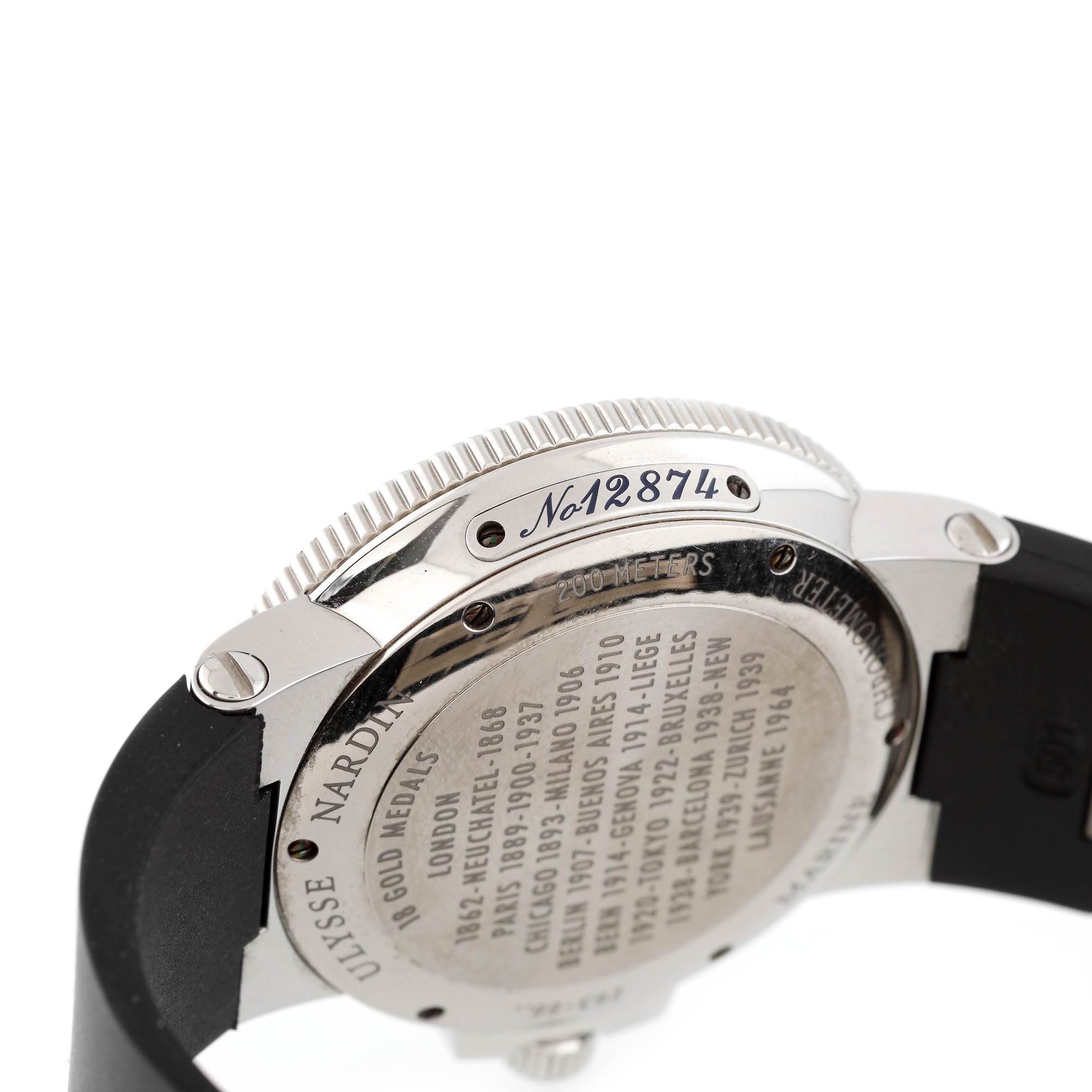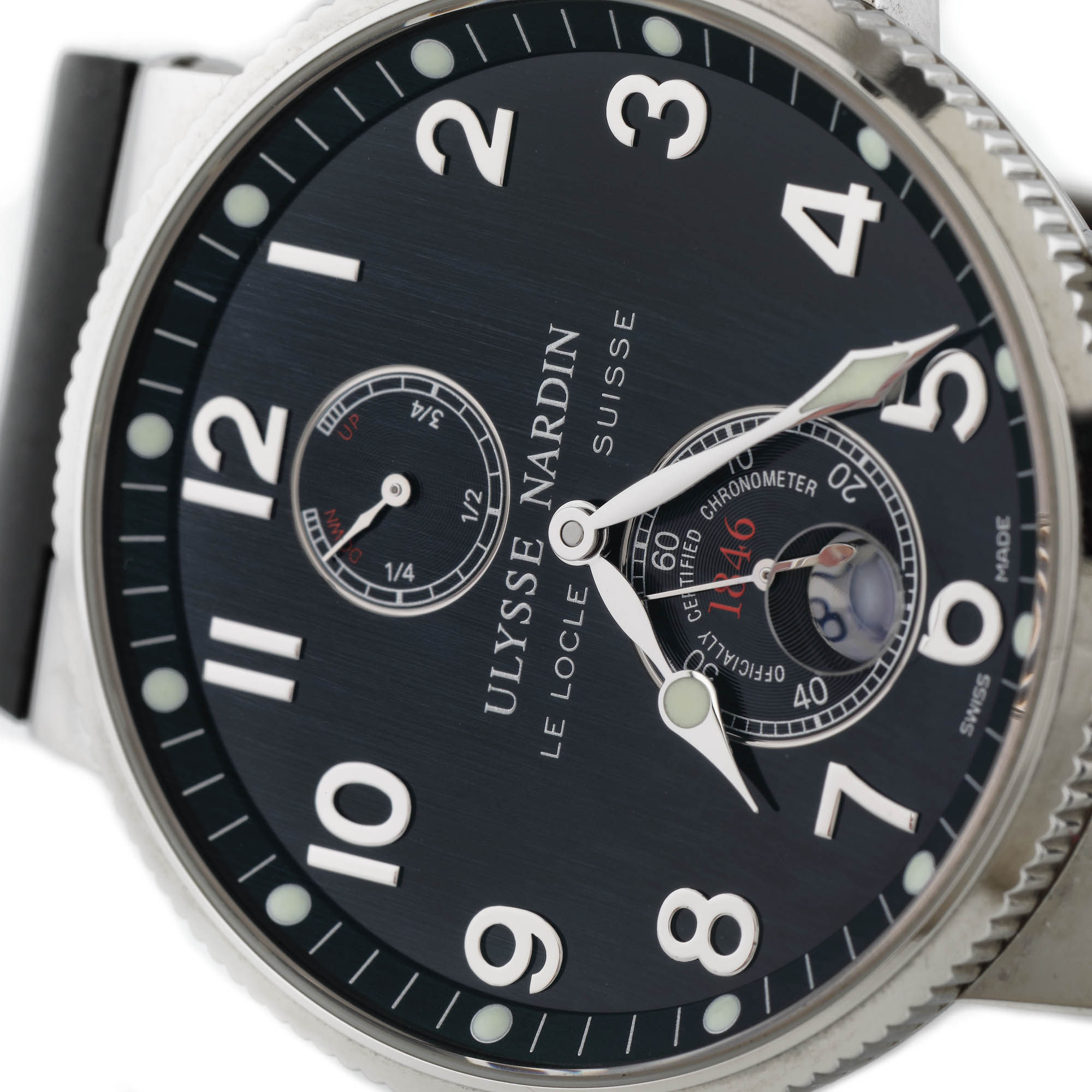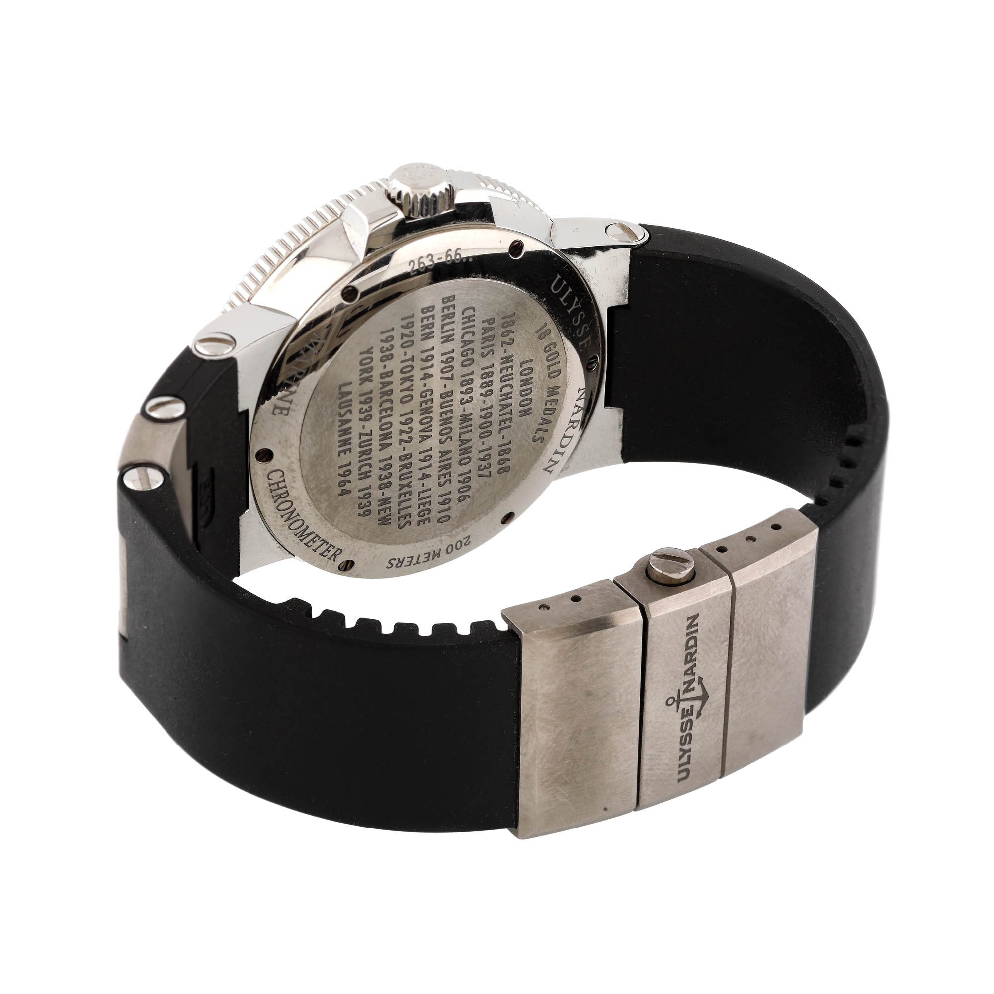 Ceas Ulysse Nardin Maxi Marine Chronometer, de mână, bărbătesc, referință 263-66, mecanism automatic. Cadran de culoare negru, cu numerale arabe, două registre și dată cu lupă în dreptul orei 6. Curea din cauciuc, de culoare neagră și închizătoare tip deployant, originale.