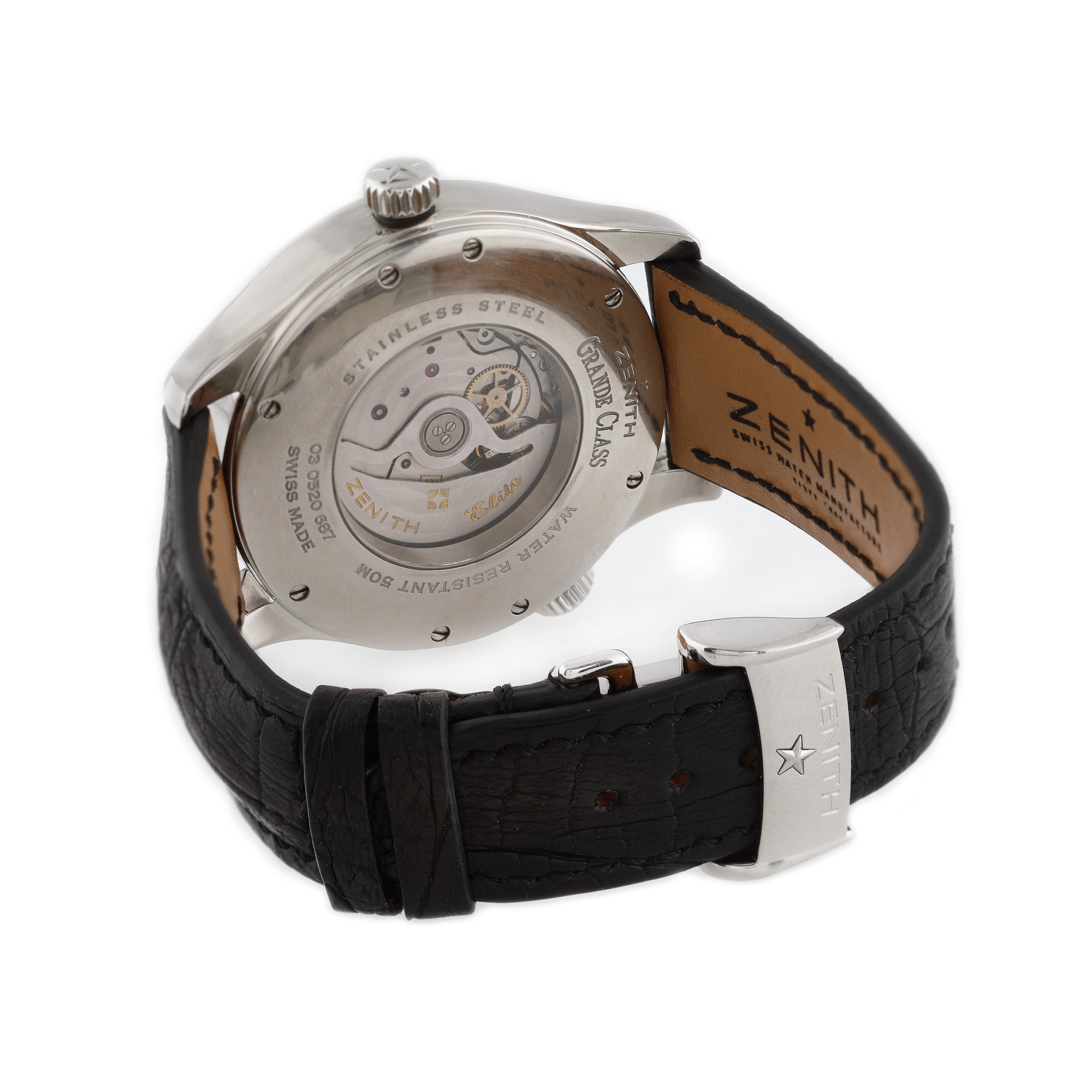 Ceas Zenith Class Traveller Multicity, de mână, bărbătesc, referință 03.0520.687, mecanism automatic, anterior vitrat. Cadran de culoare silver, decorat în tehnica guilloché, cu numerale arabe, registru pentru rezervă de timp între orele 1-2, dată între orele 4-5 și registru în dreptul orei 9. Curea din piele, de culoare neagră și închizătoare tip deployant, originale.