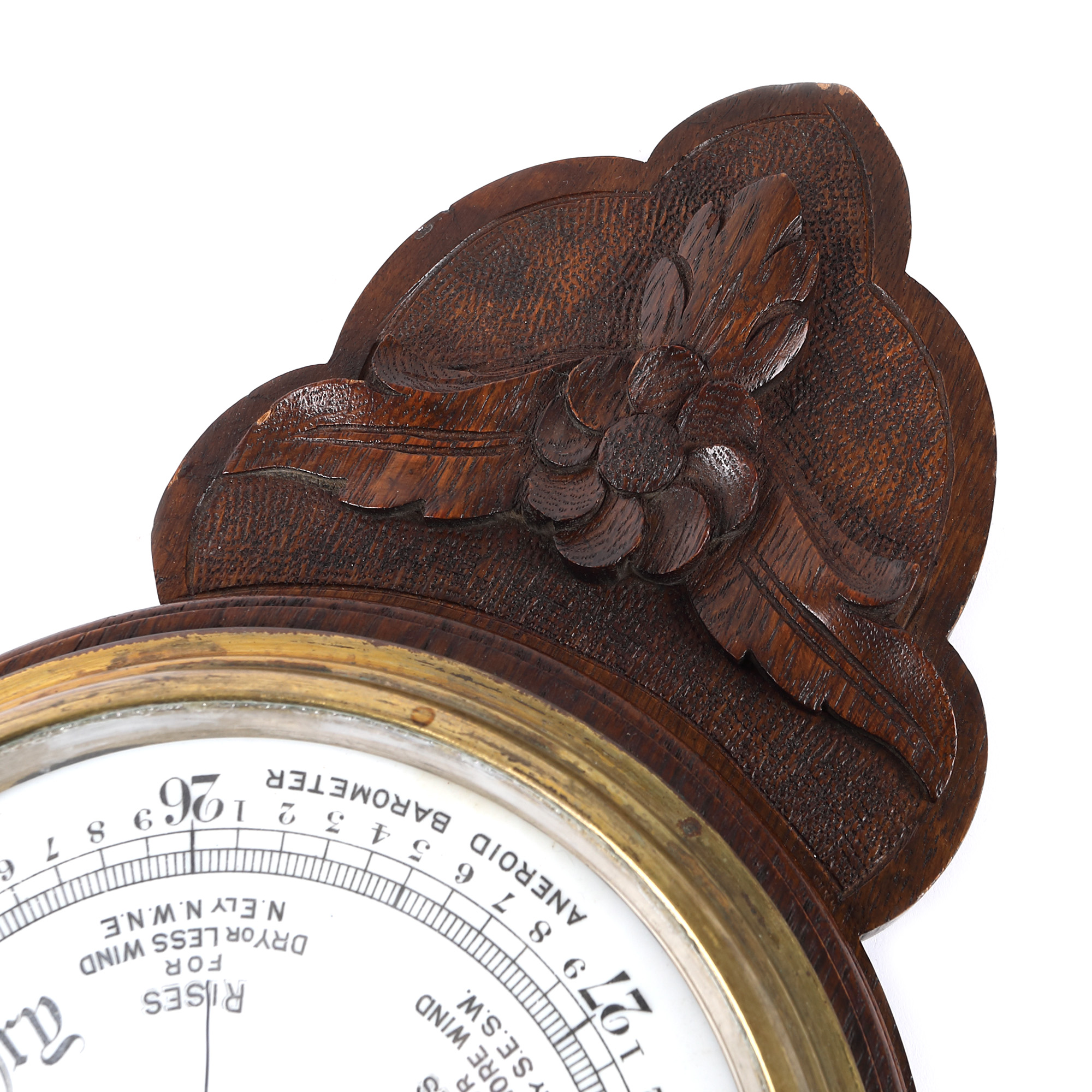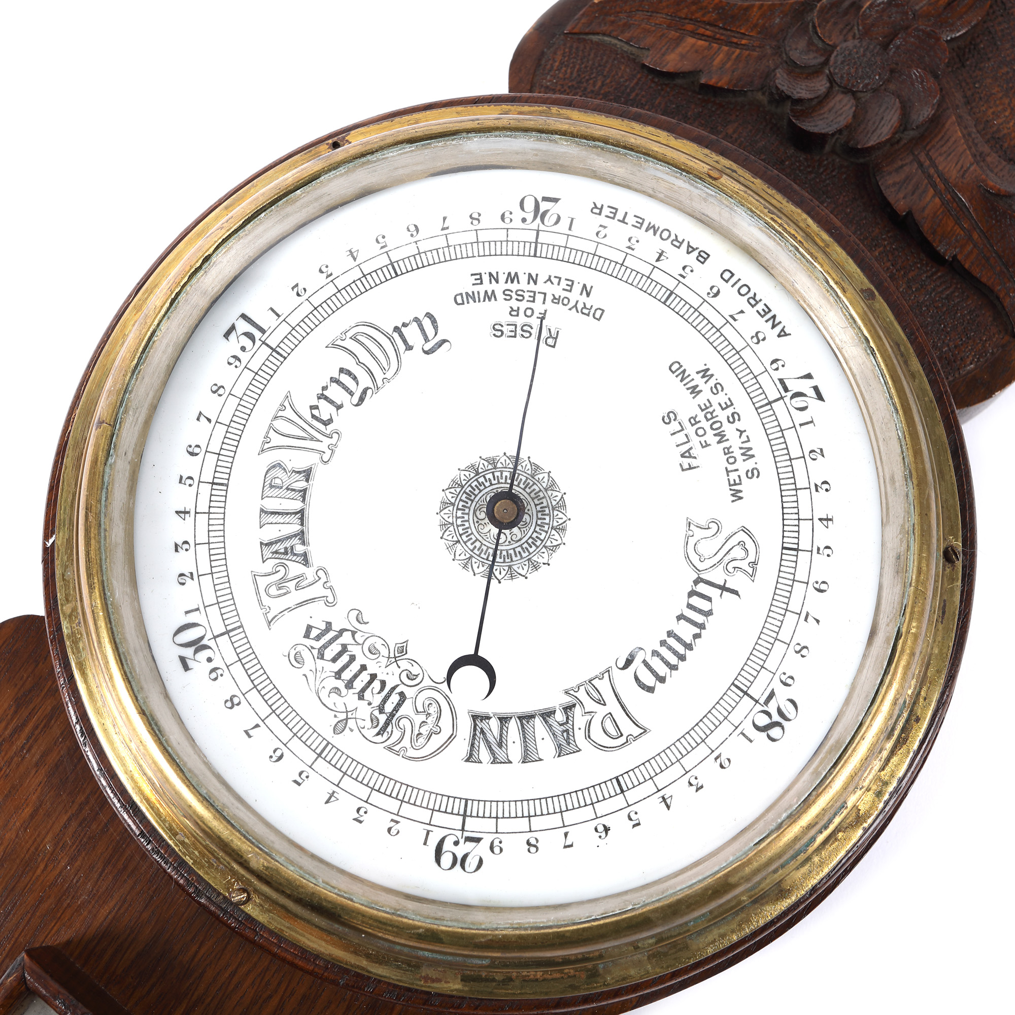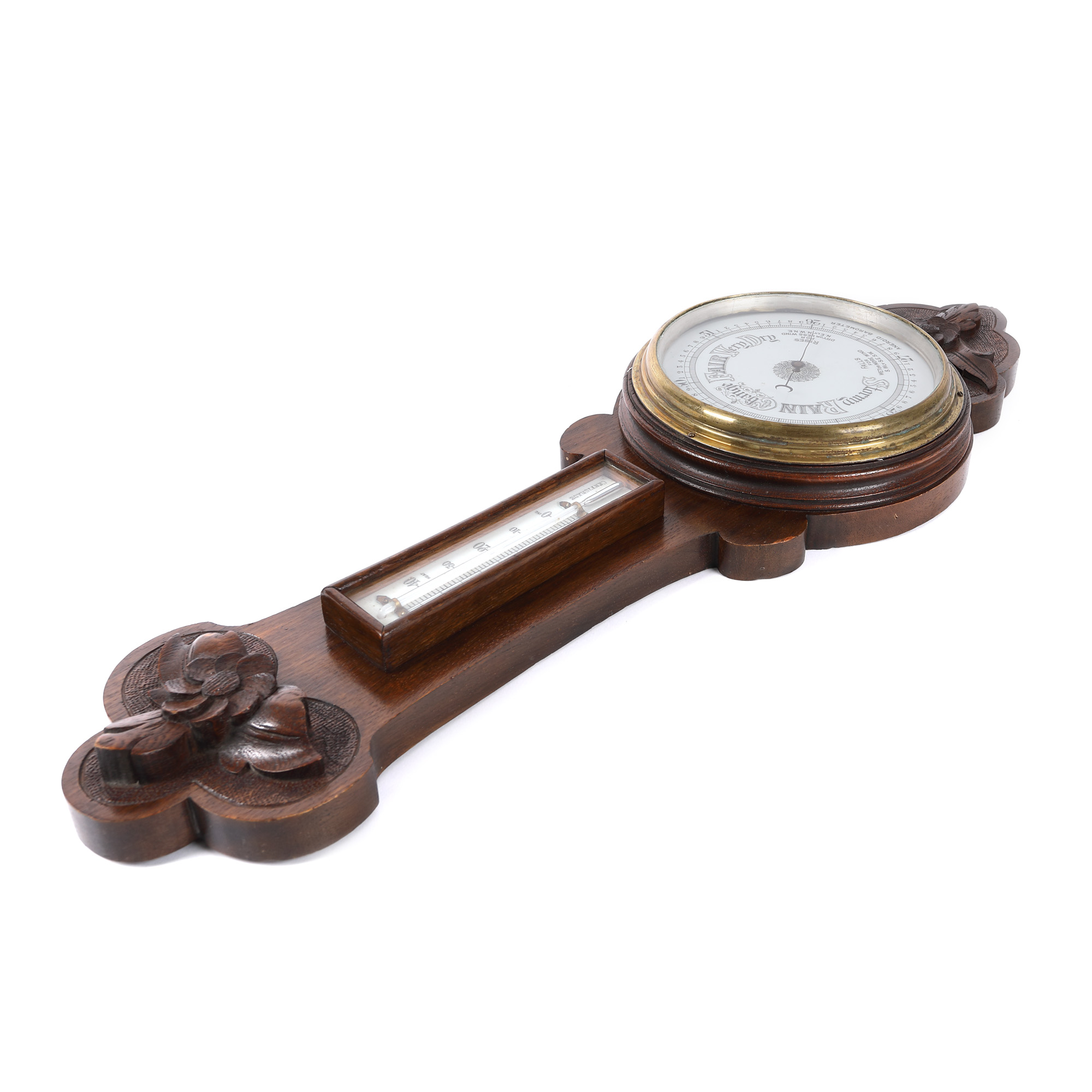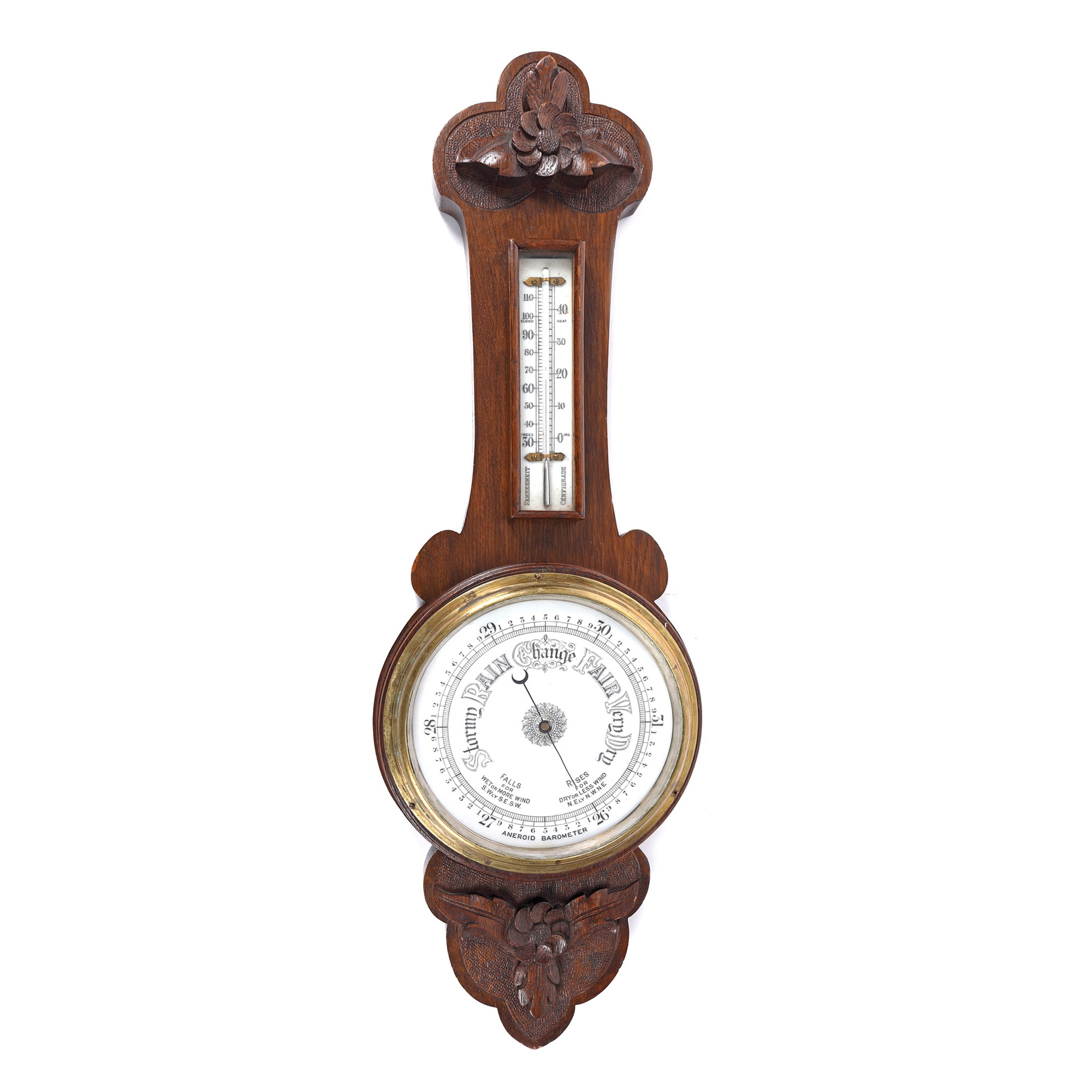 Barometru din lemn fabricat în Anglia, însoțit de termometru și decorat cu motive vegetale. Cadranul este inscripționat cu tipuri de vreme ce pot fi întâlnite "Storm, rain, bange, fair, very dry". Acul barometrului este stilizat cu o semilună, plasată la extremitatea acestuia.