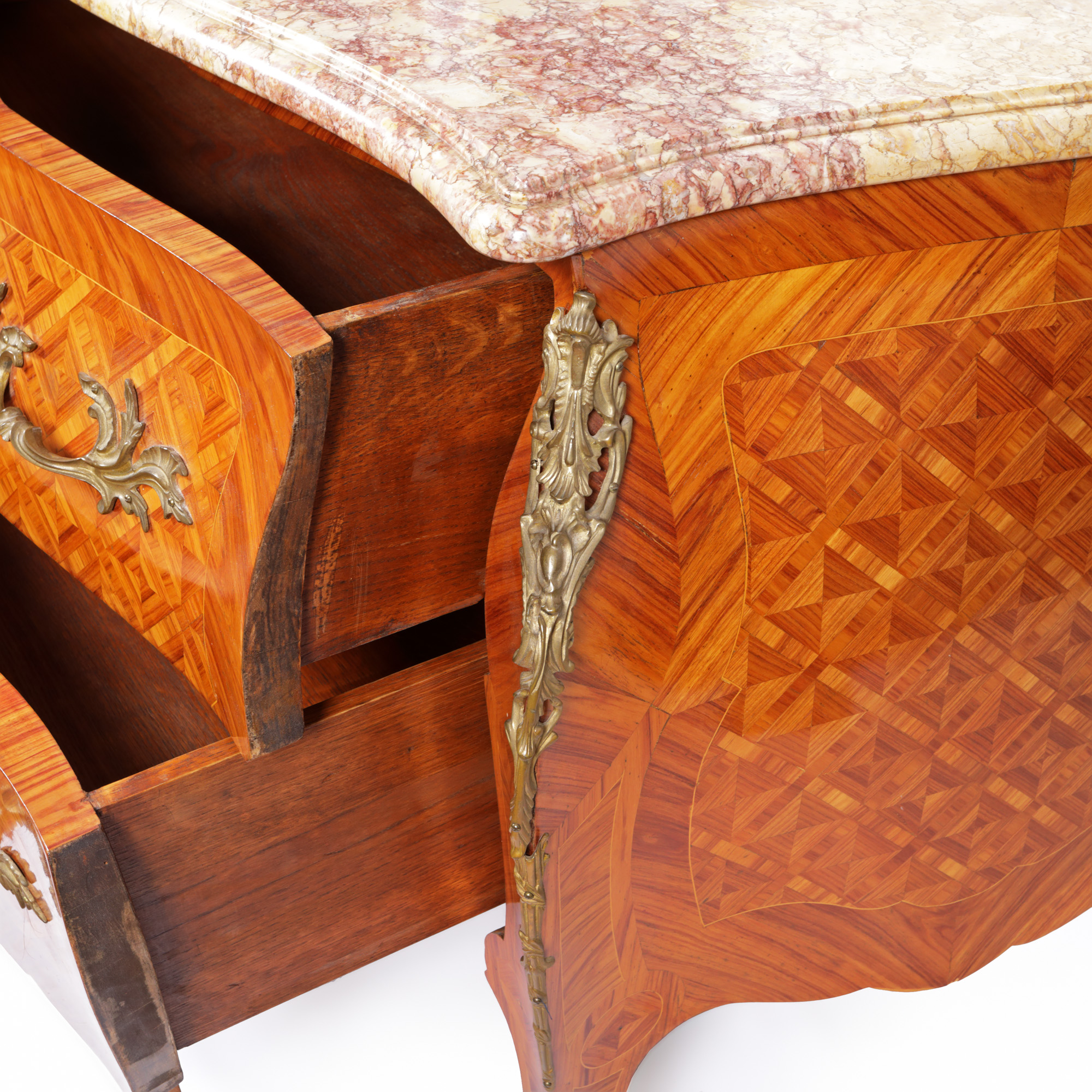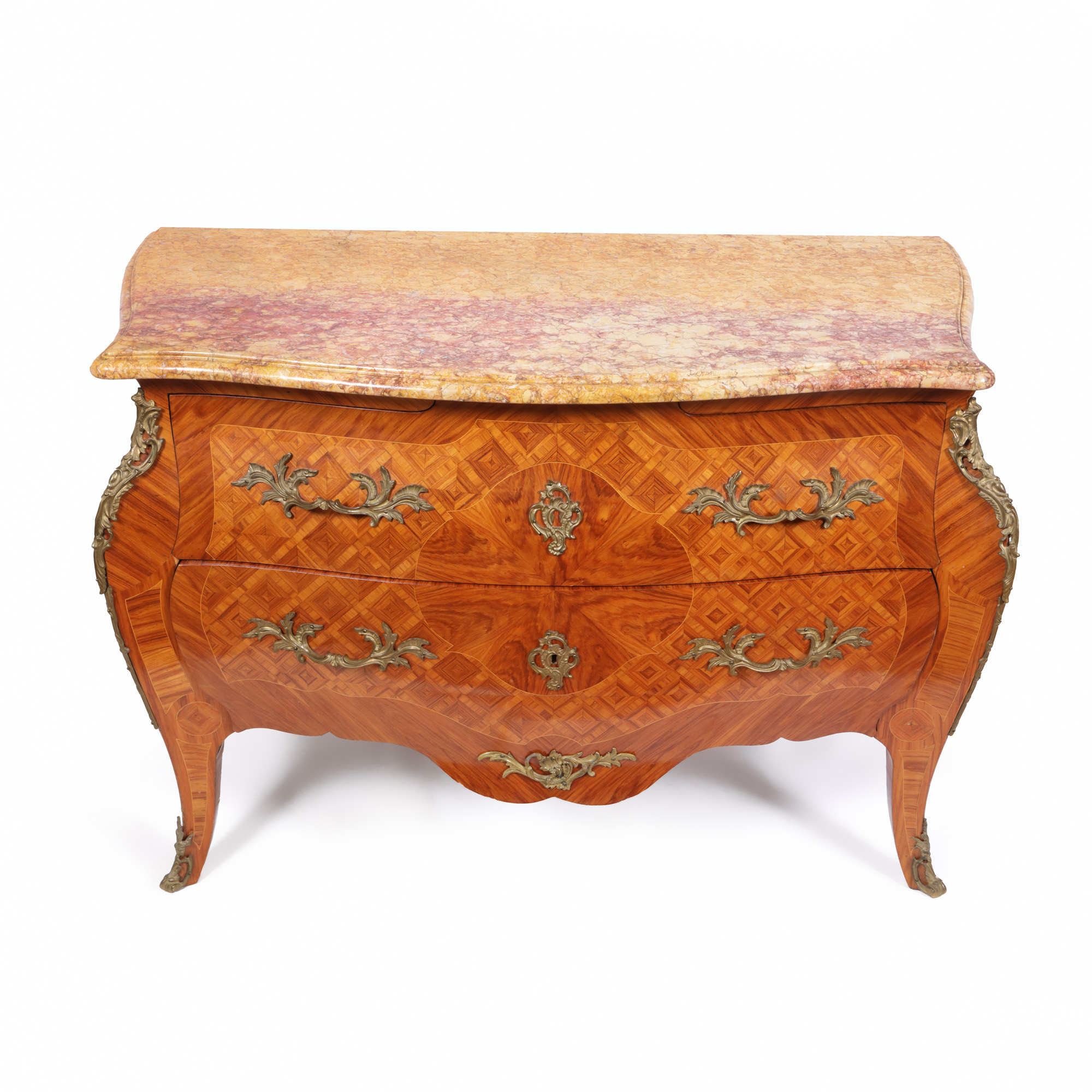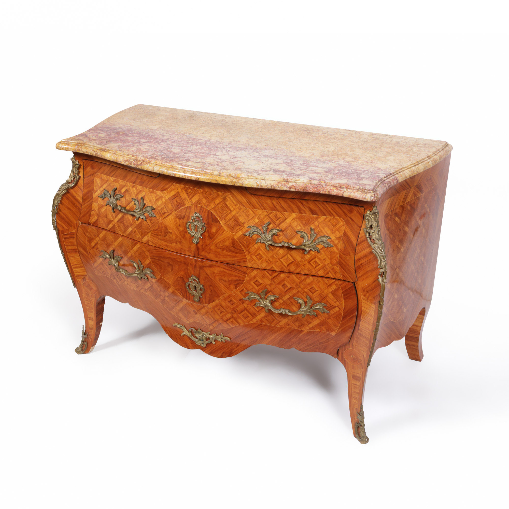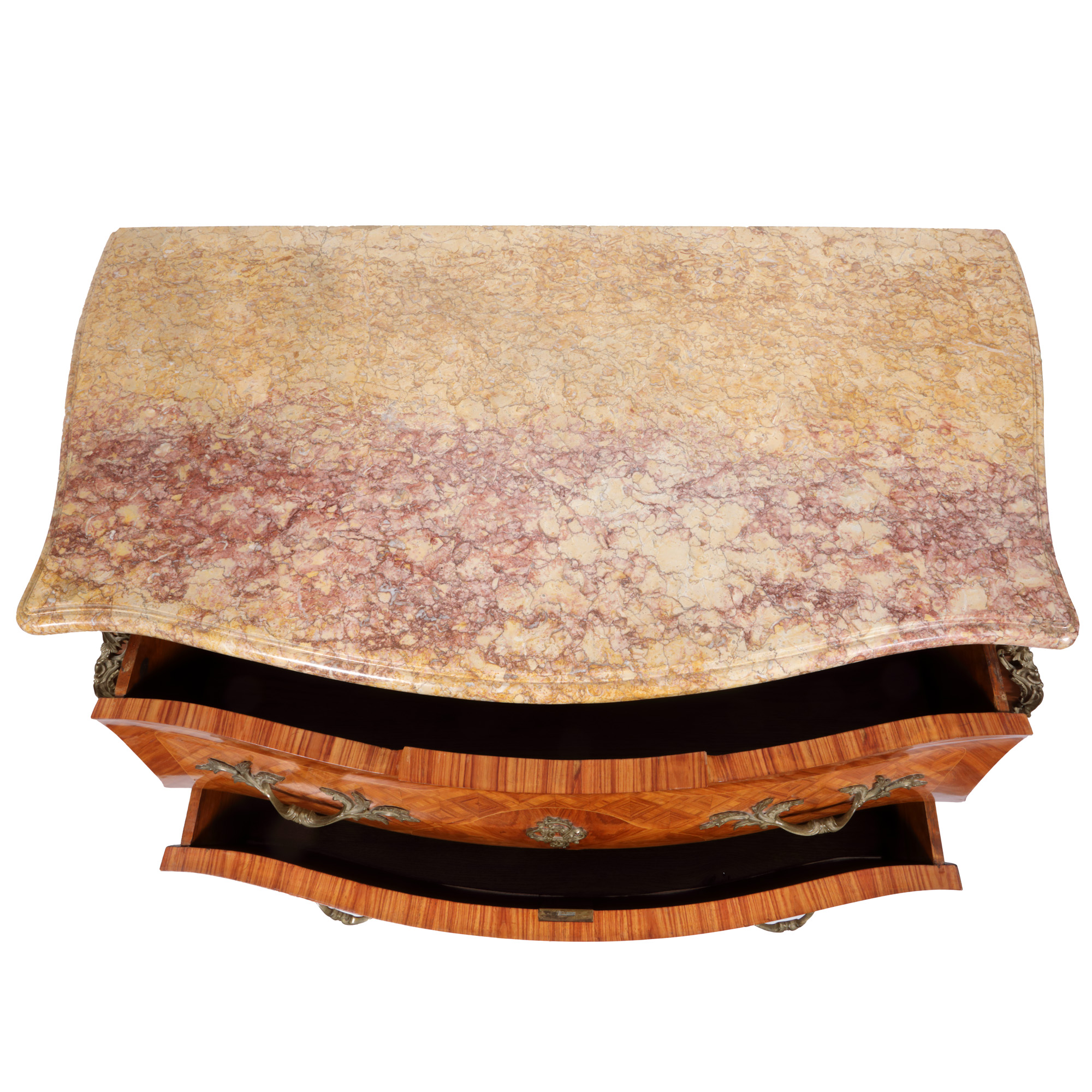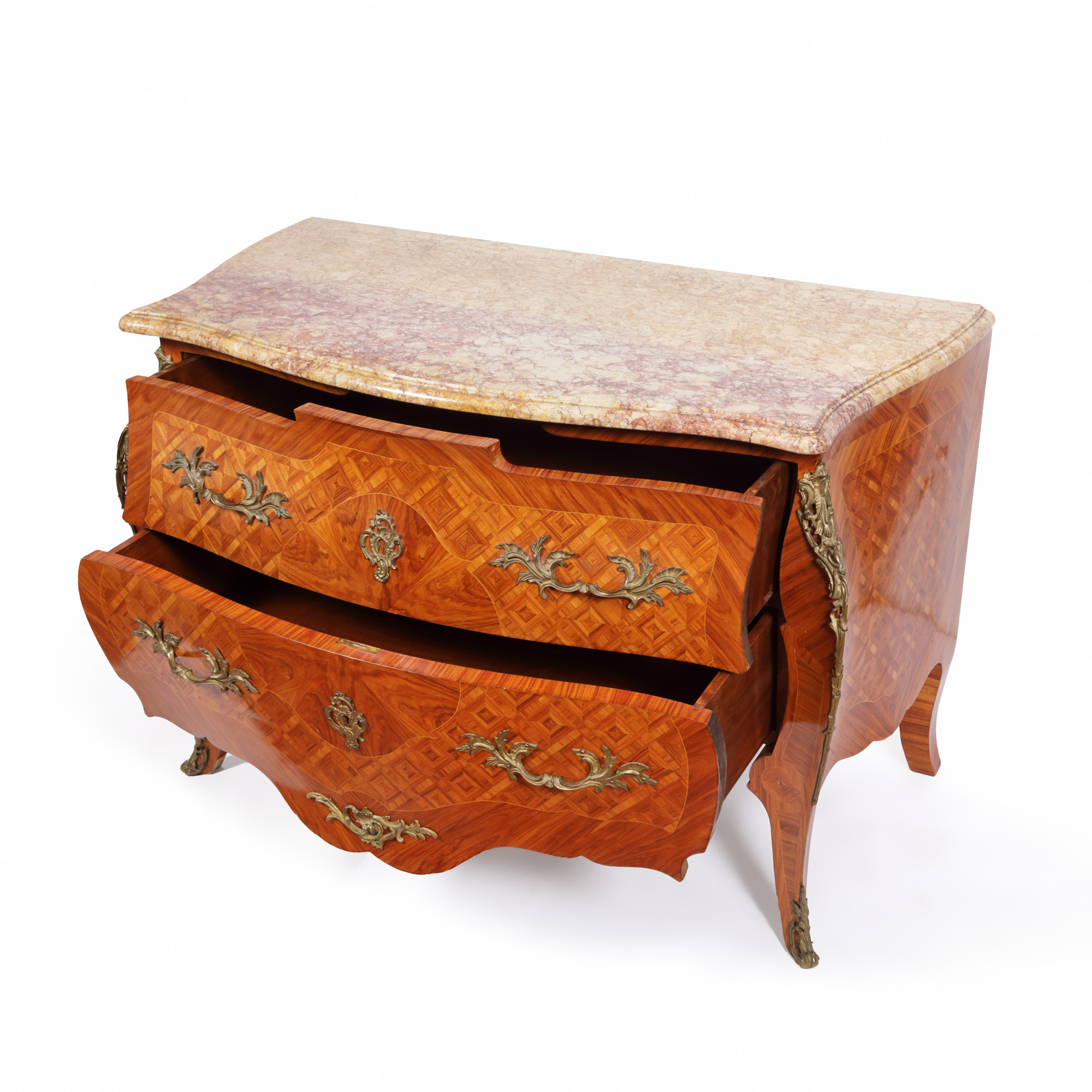 57. Comodă Régence din lemn parchetat, decorată cu elemente din bronz aurit și blat din marmură, sfârșitul sec. XIX