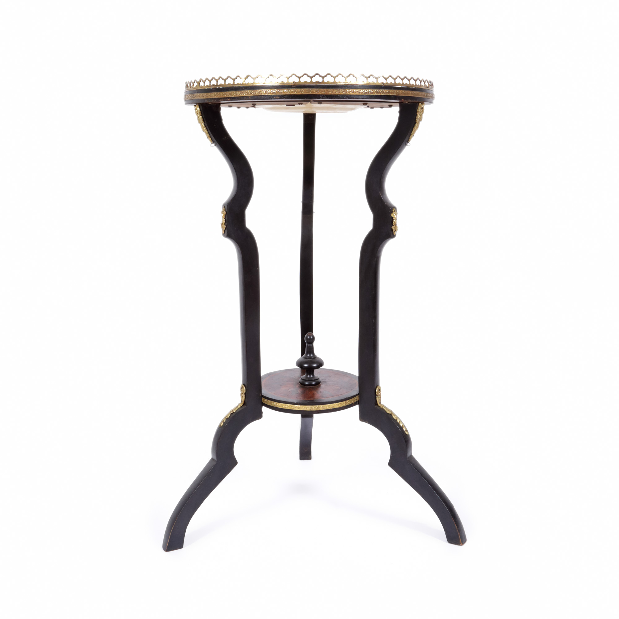 lemn marchetat, ramă din bronz festonată, faianță