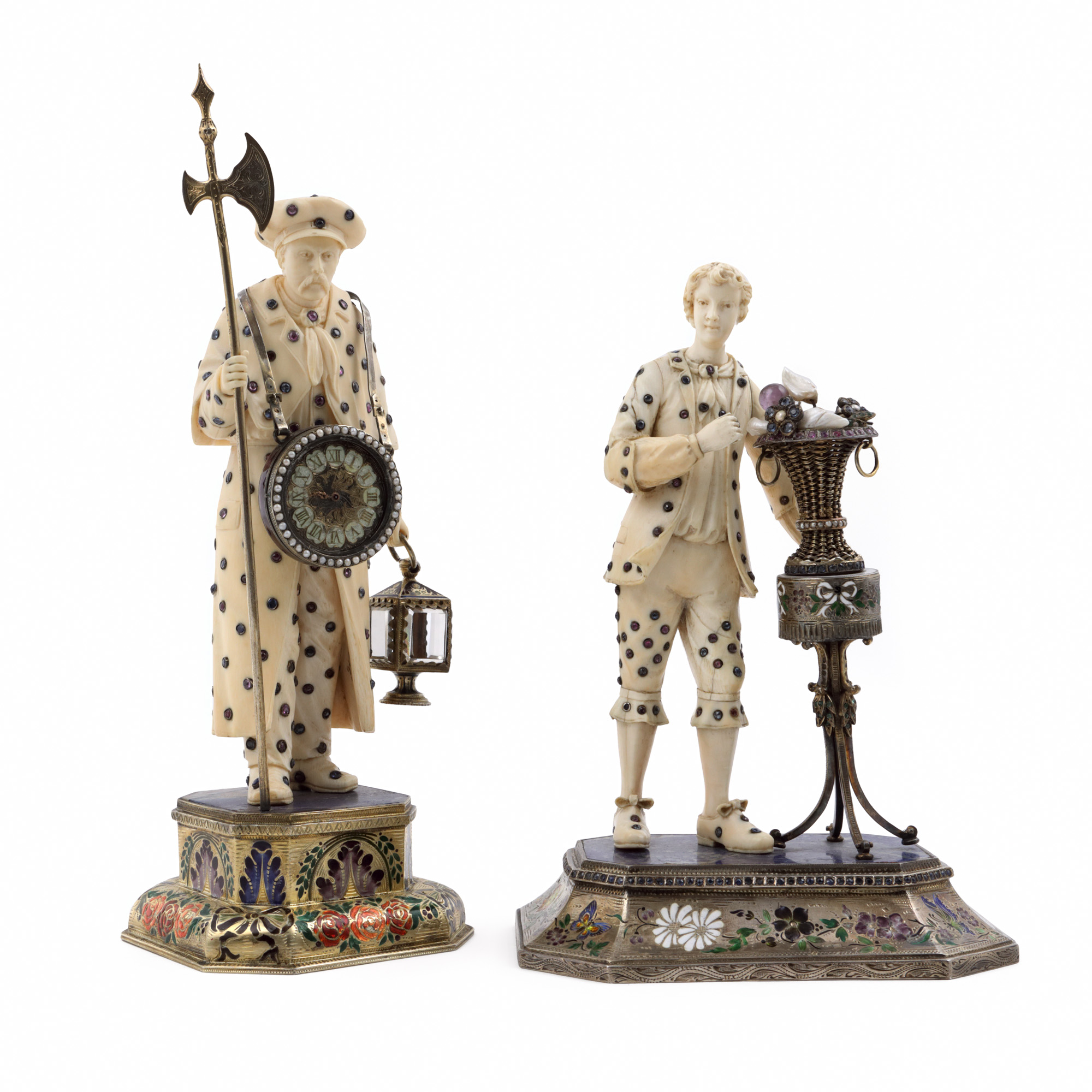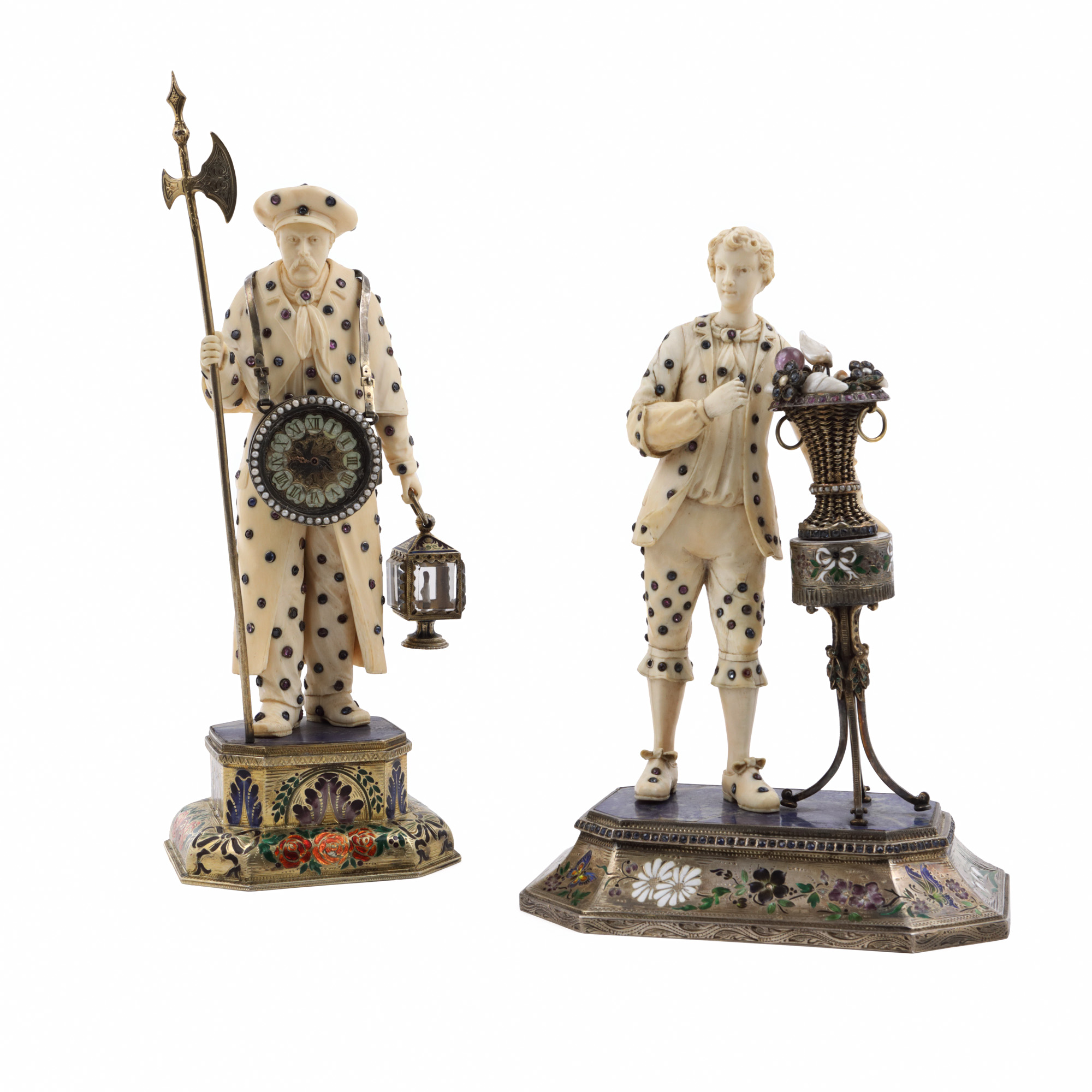 63. Excepționale statuete din fildeș, ornate cu safire, rubine, smaralde, ametiste și perle, sfârșitul sec. XIX, probabil realizate pentru familia imperială Habsburgică, piese de colecție