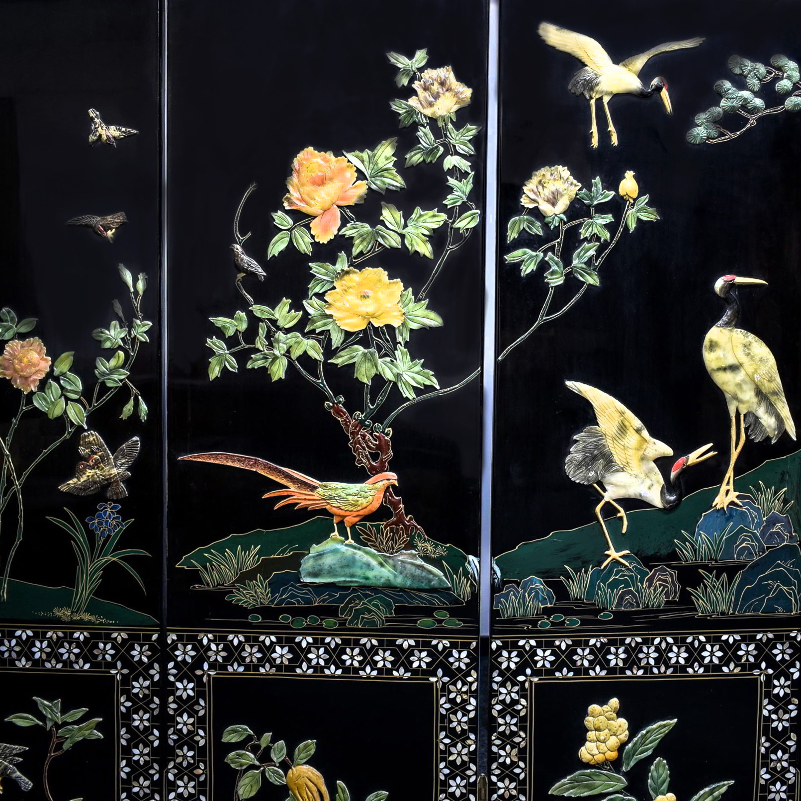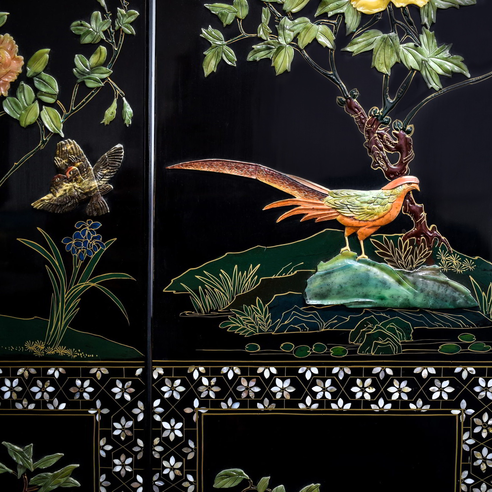 44. Impresionant paravan tip Coromandel, din laque de Chine, decorat cu pietre semi-prețioase și intarsii cu sidef, China, sfârșitul sec. XIX