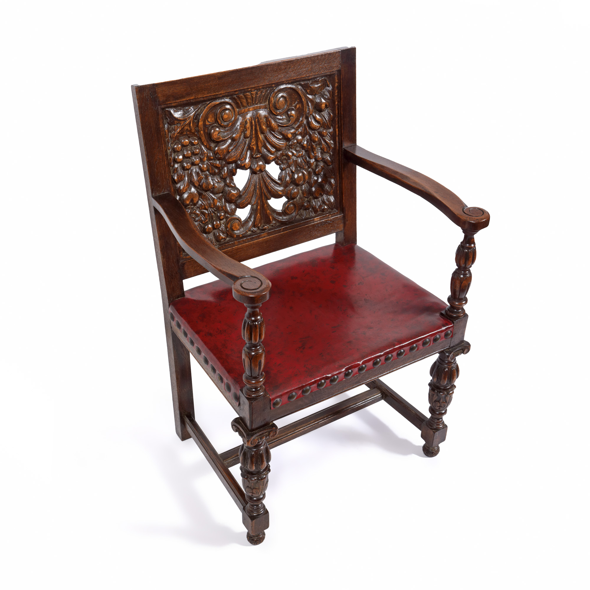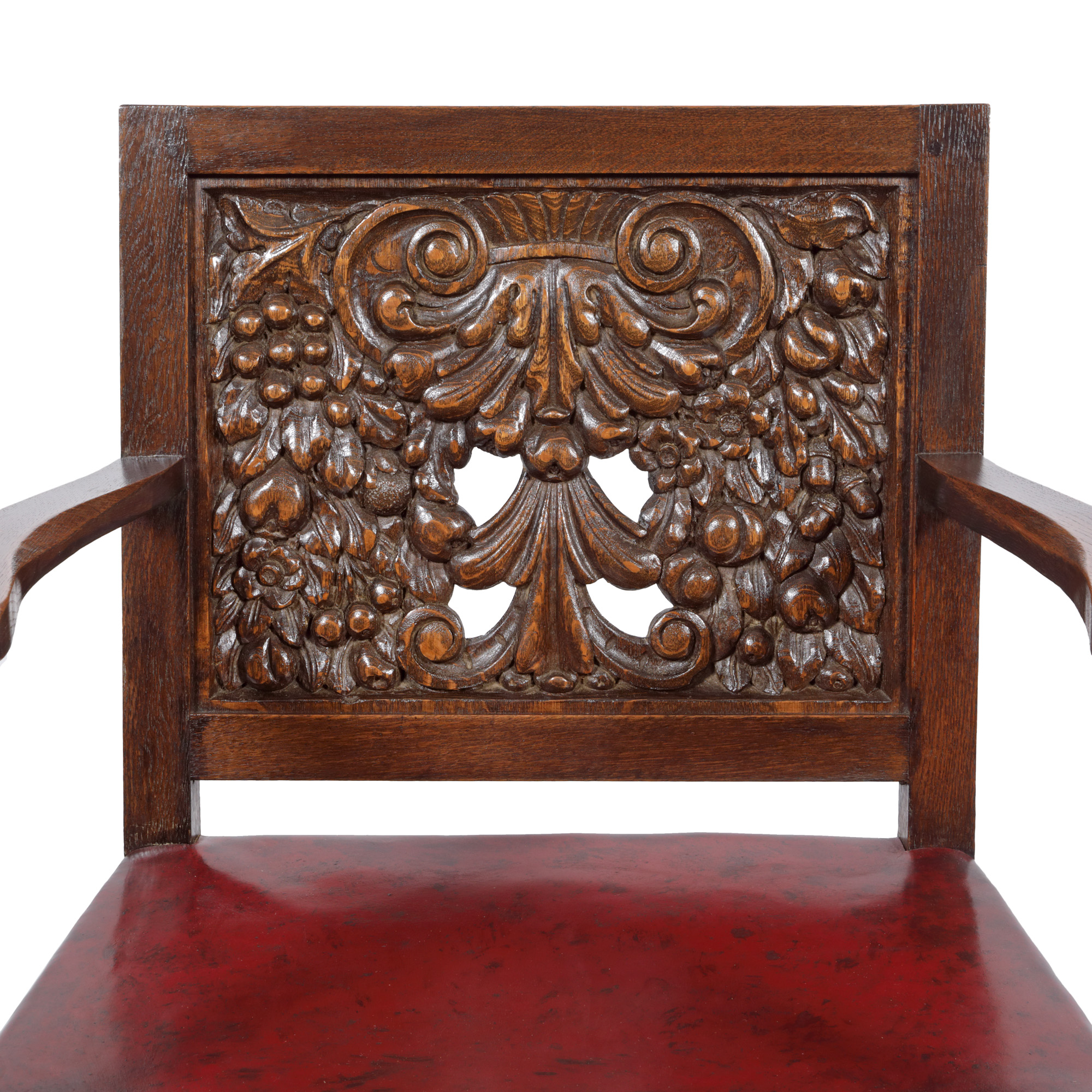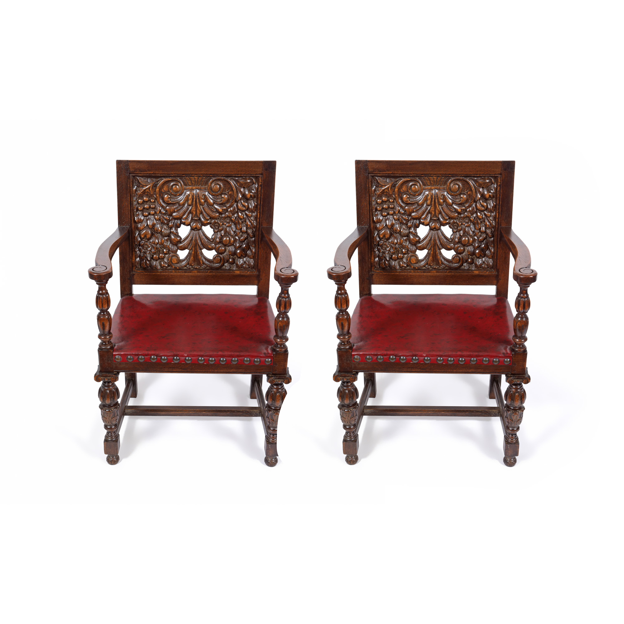 42. Pereche de fotolii în stil Historist, din lemn de nuc, cu șezut de piele, sfârșitul sec. XIX