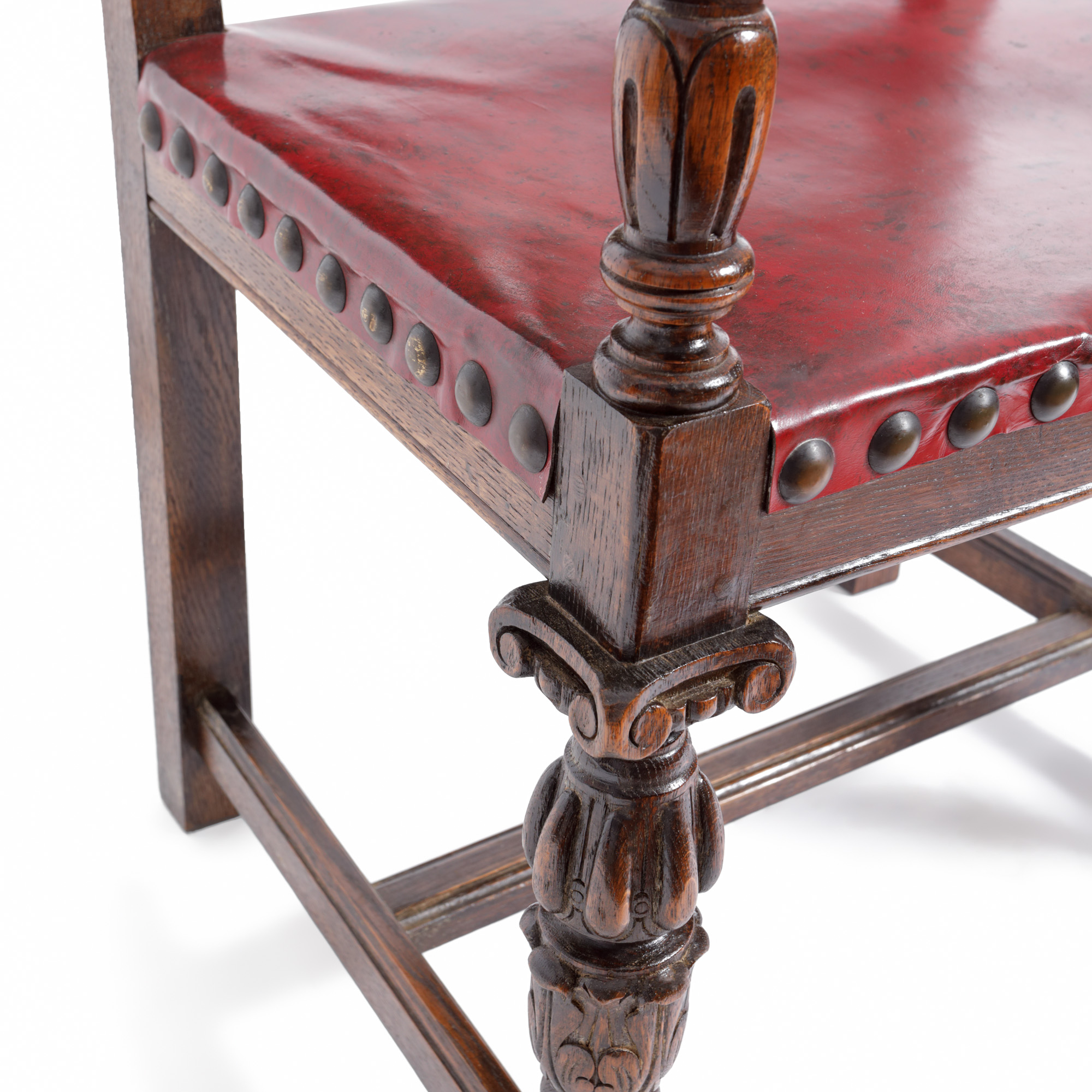 lemn de nuc, sculptat, strunjit, lustruit, piele, alamă