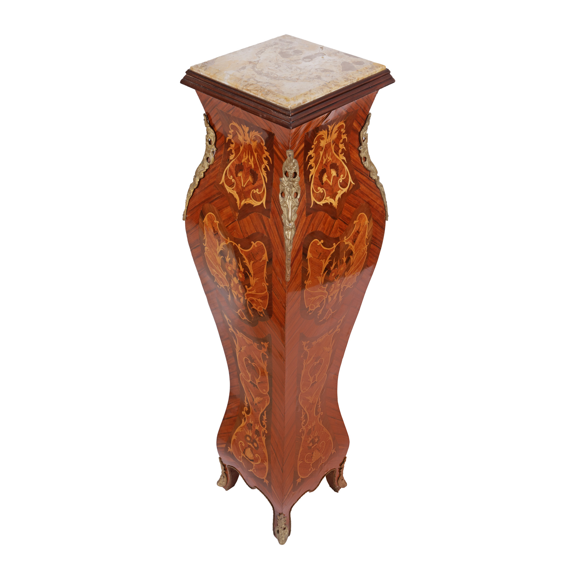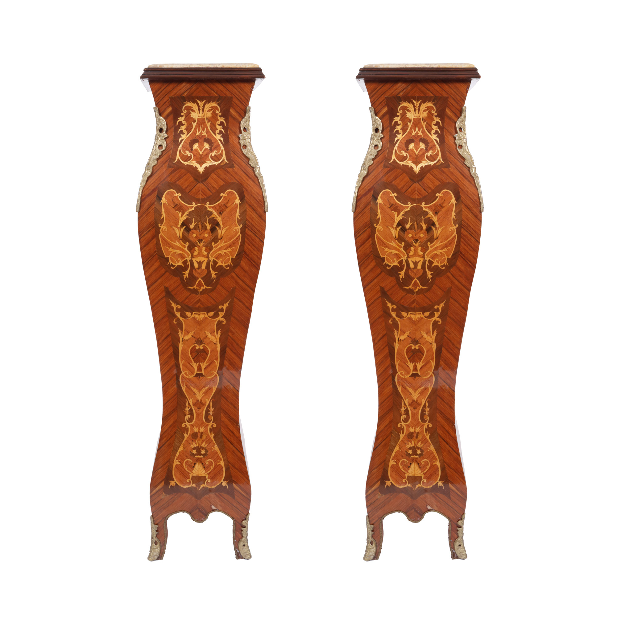 56. Pereche de piedestaluri bombé în manieră Barocă, cu marchetărie din lemn și bronz aurit, a doua jumătate a sec. XIX