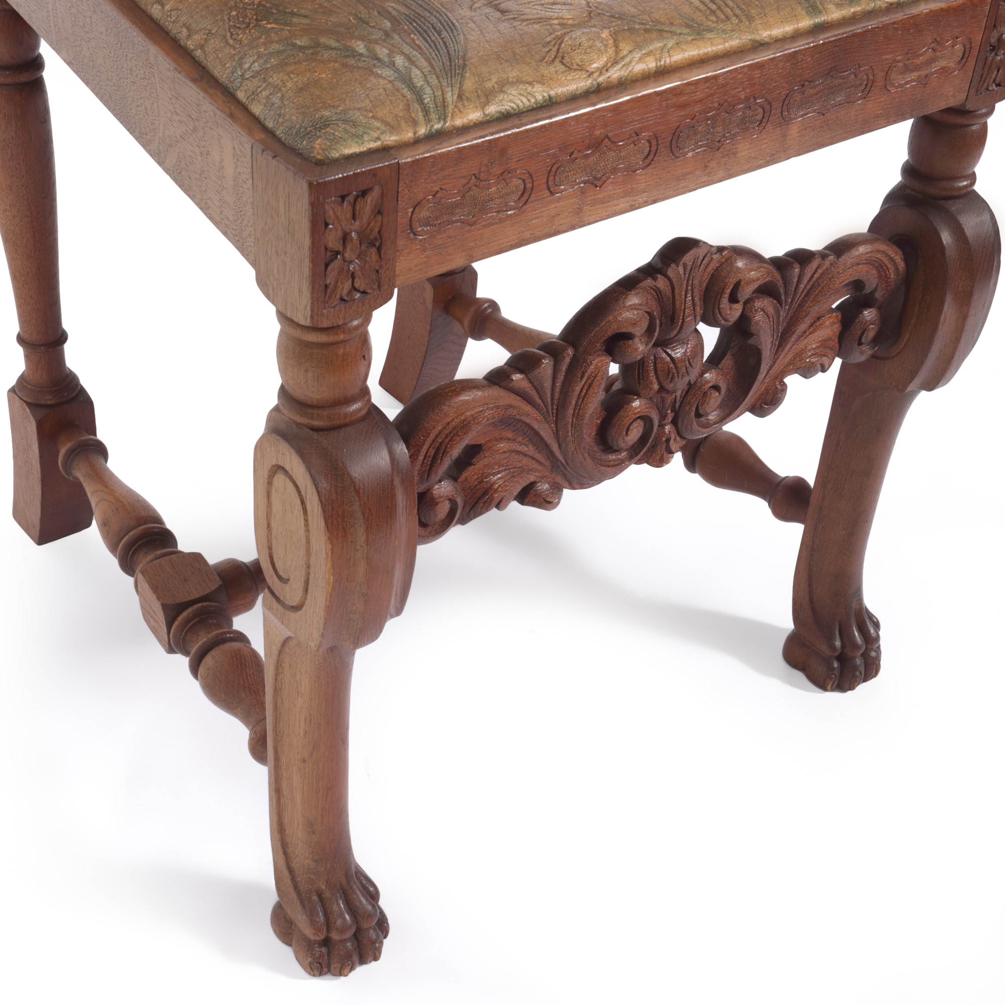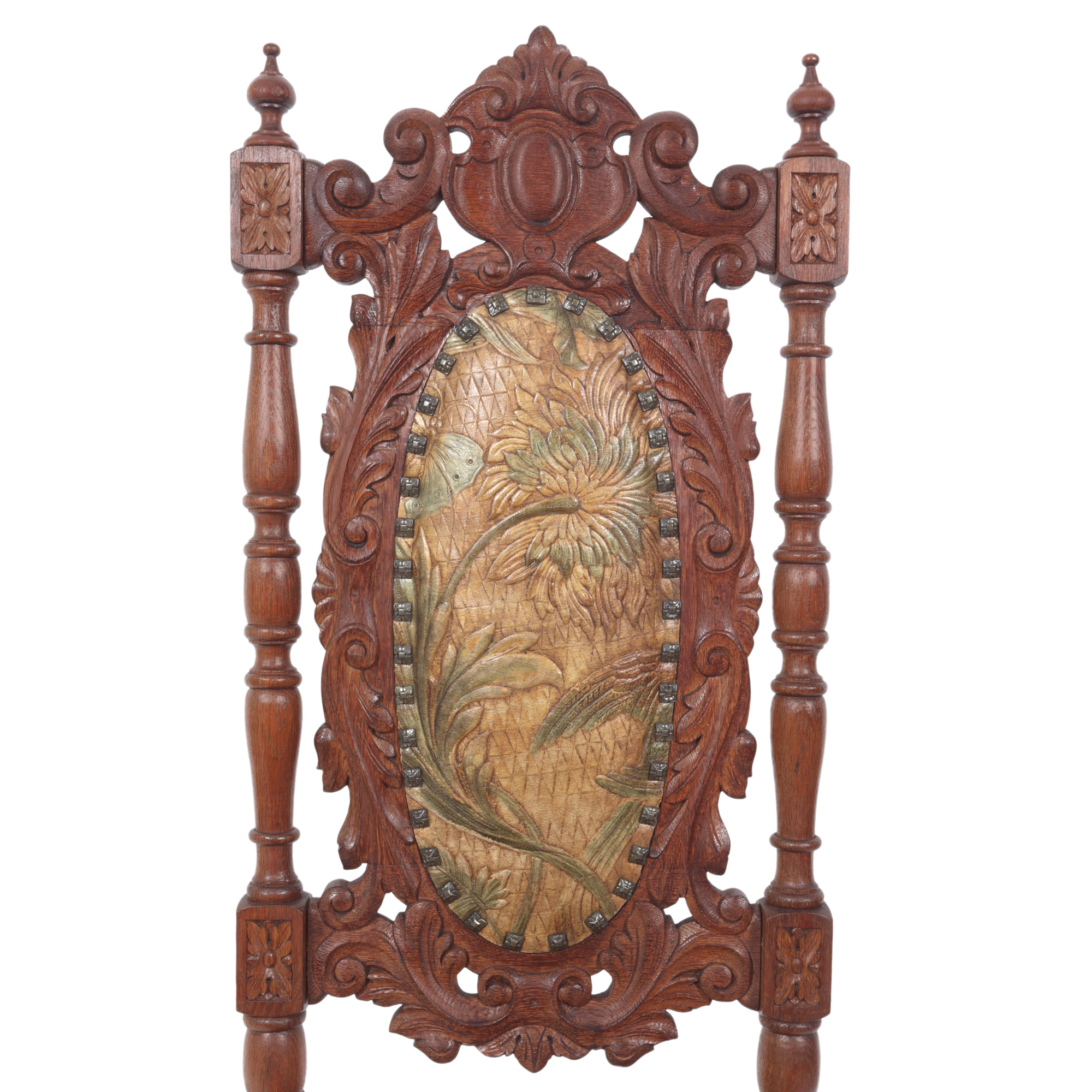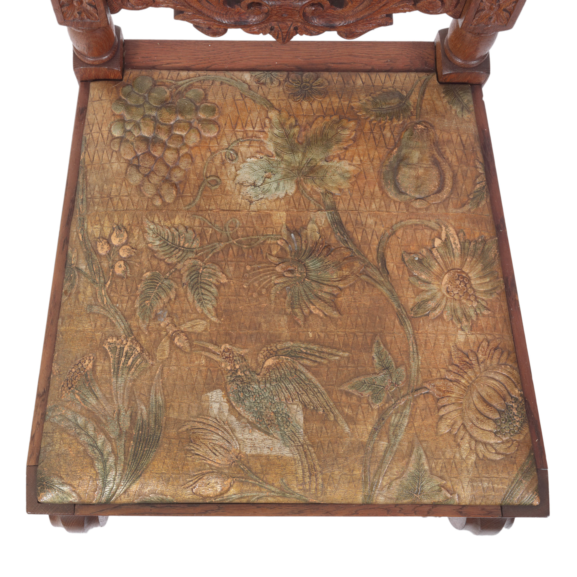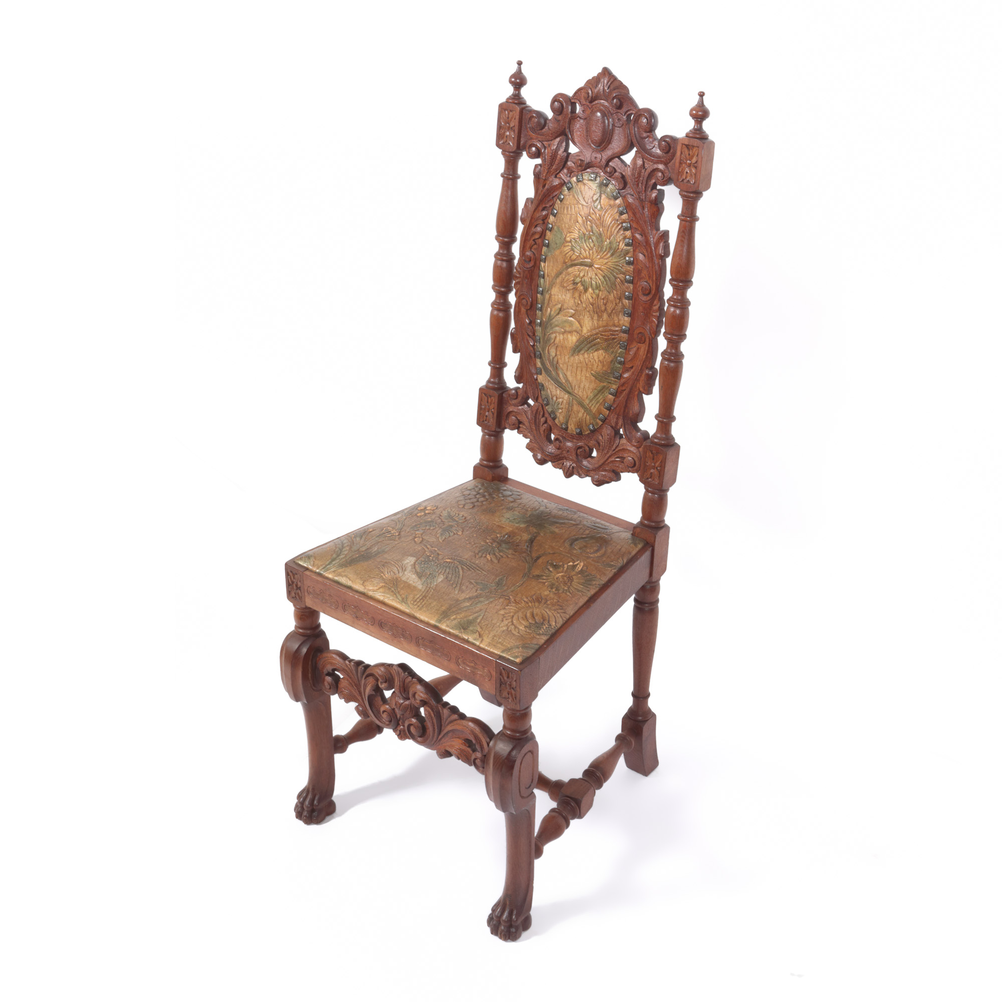 27. Pereche de scaune în stil Historist, din lemn și tapițerie din piele embosată și pictată cu crizanteme și pasărea paradisului, sfârșitul sec. XIX