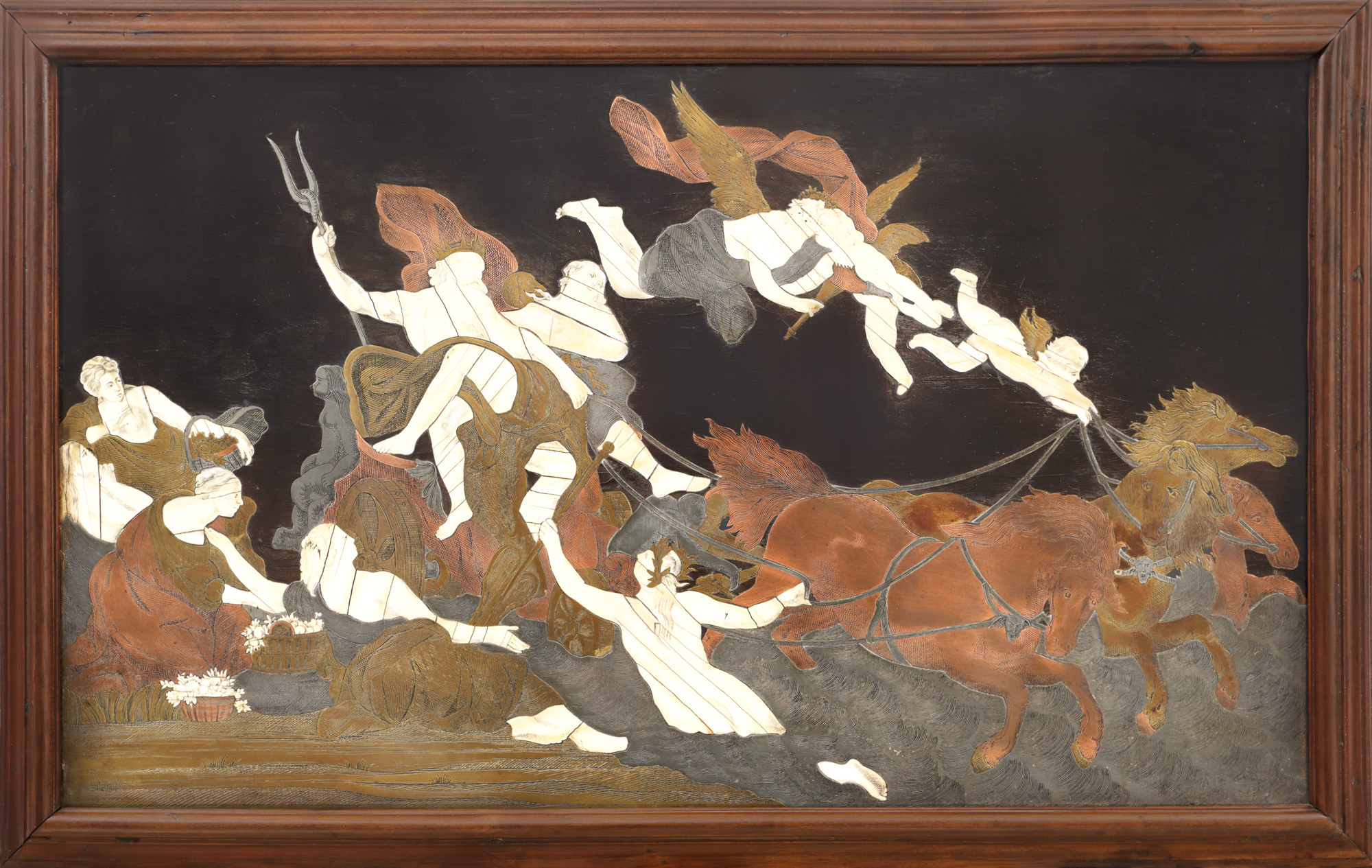 45. “Răpirea Proserpinei” - rar panou decorativ din lemn ebenizat, intarsiat cu fildeș, cca. 1850