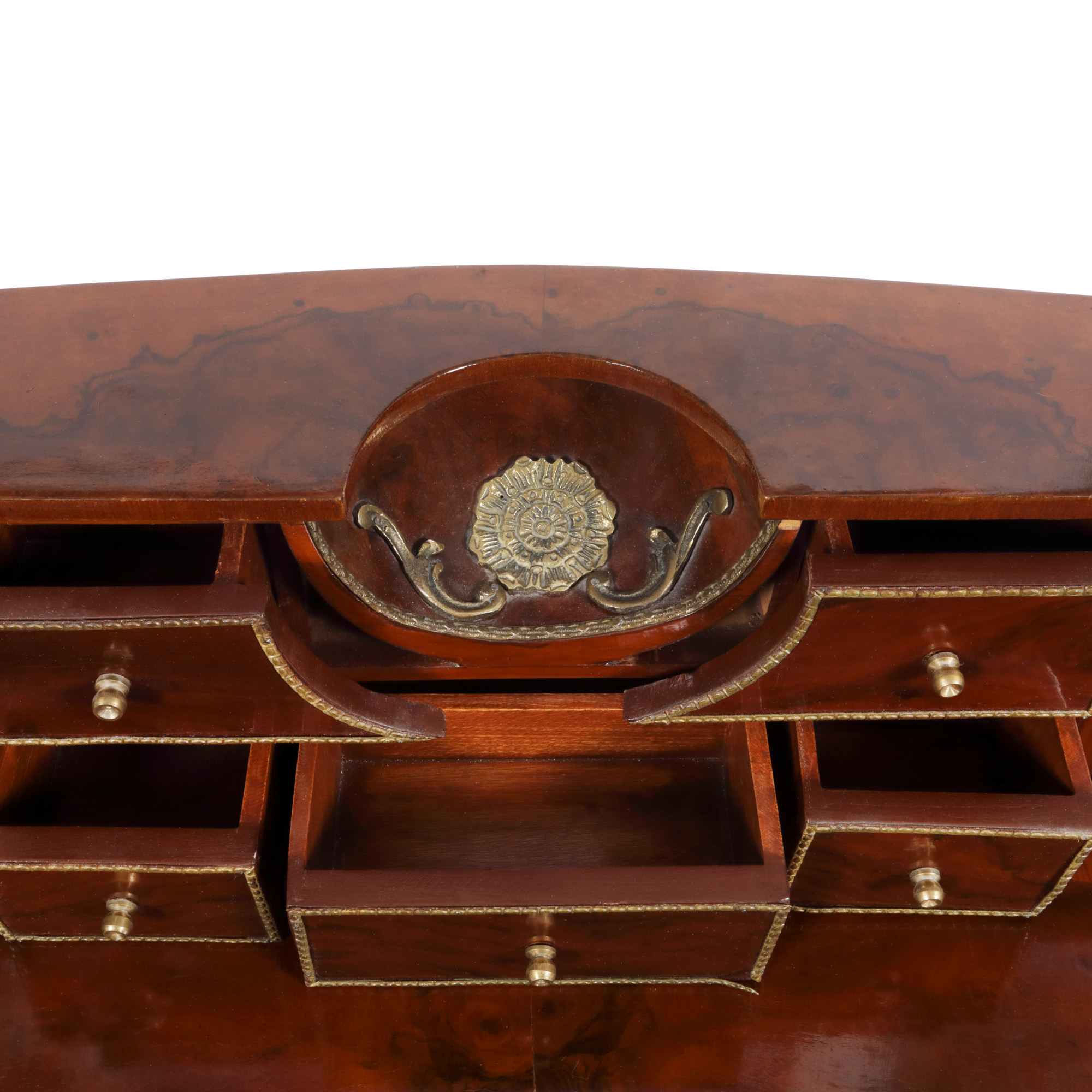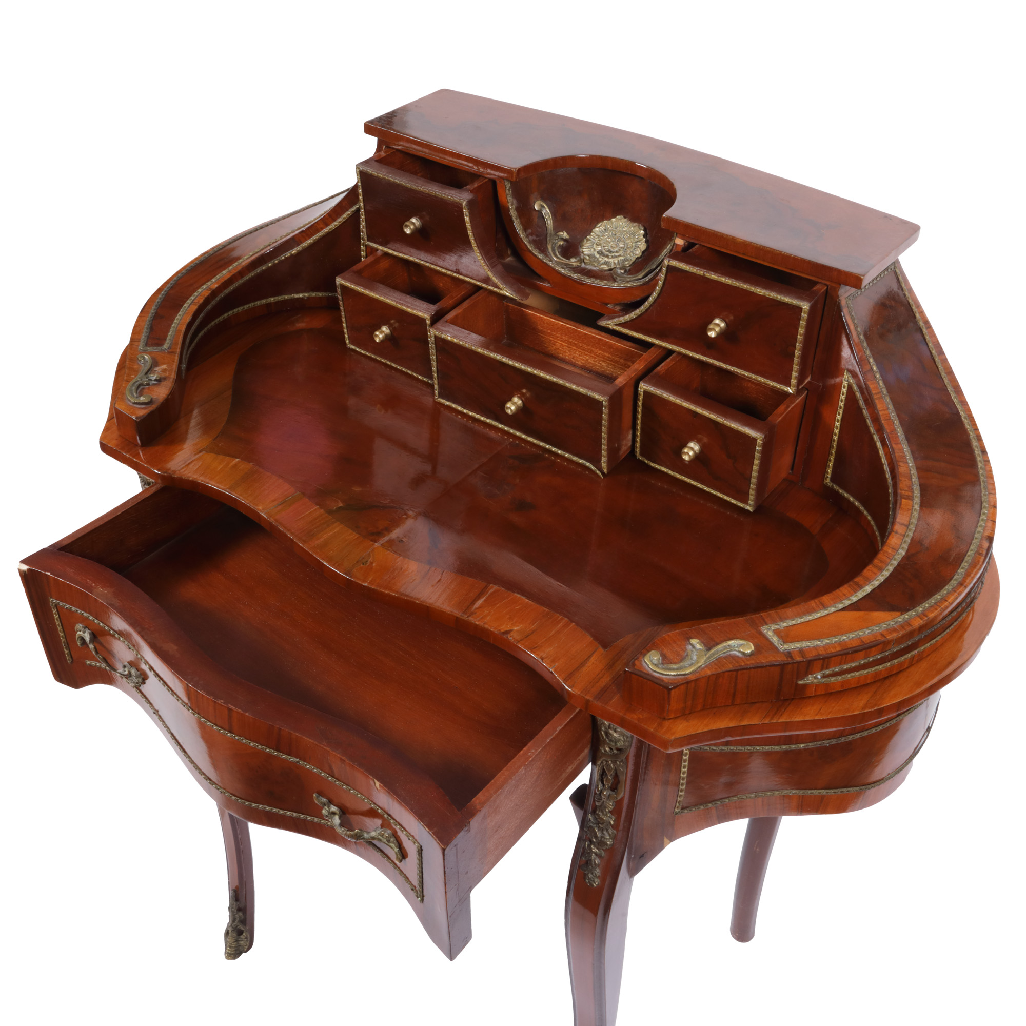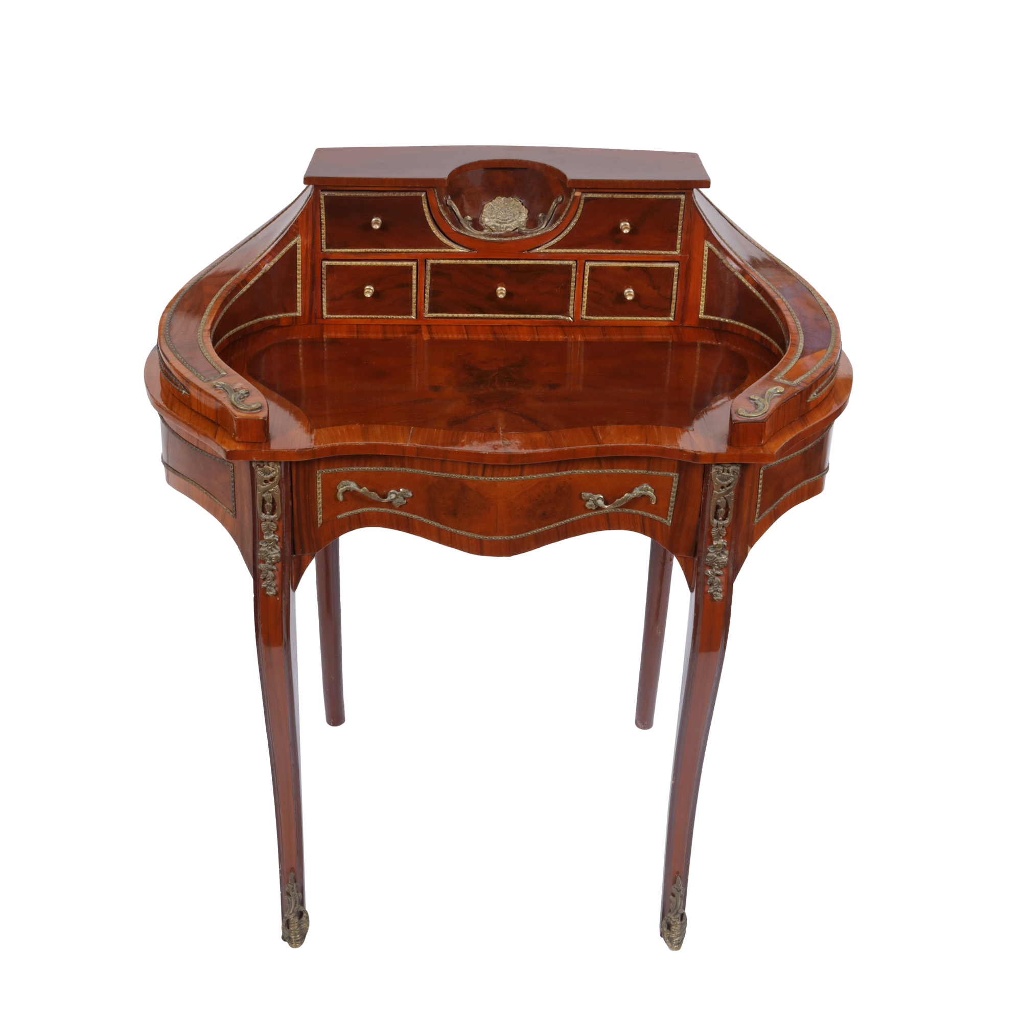 Secretaire de damă, lemn de acaju cu blatul festonat, surmontat de porțiune cu casete dezvoltând două brațe curbate, prinse de blat, central alveolă concavă din bronz, motiv floral, la nivelul centurii sertar cu mânere din bronz.
