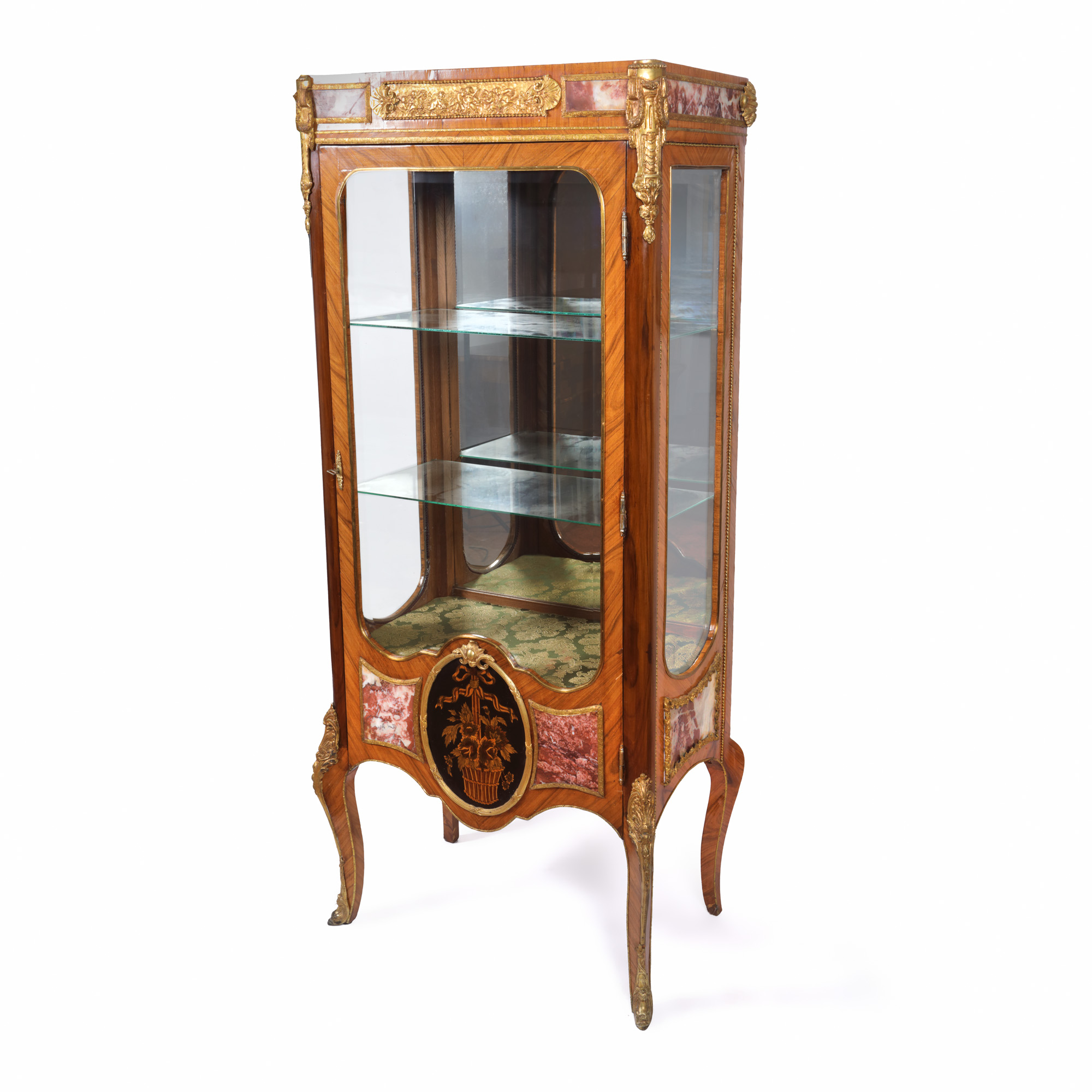 39. Vitrină în manieră Louis XV, din lemn de mahon cu marchetărie din lemn exotic, a doua jumătate a sec. XIX