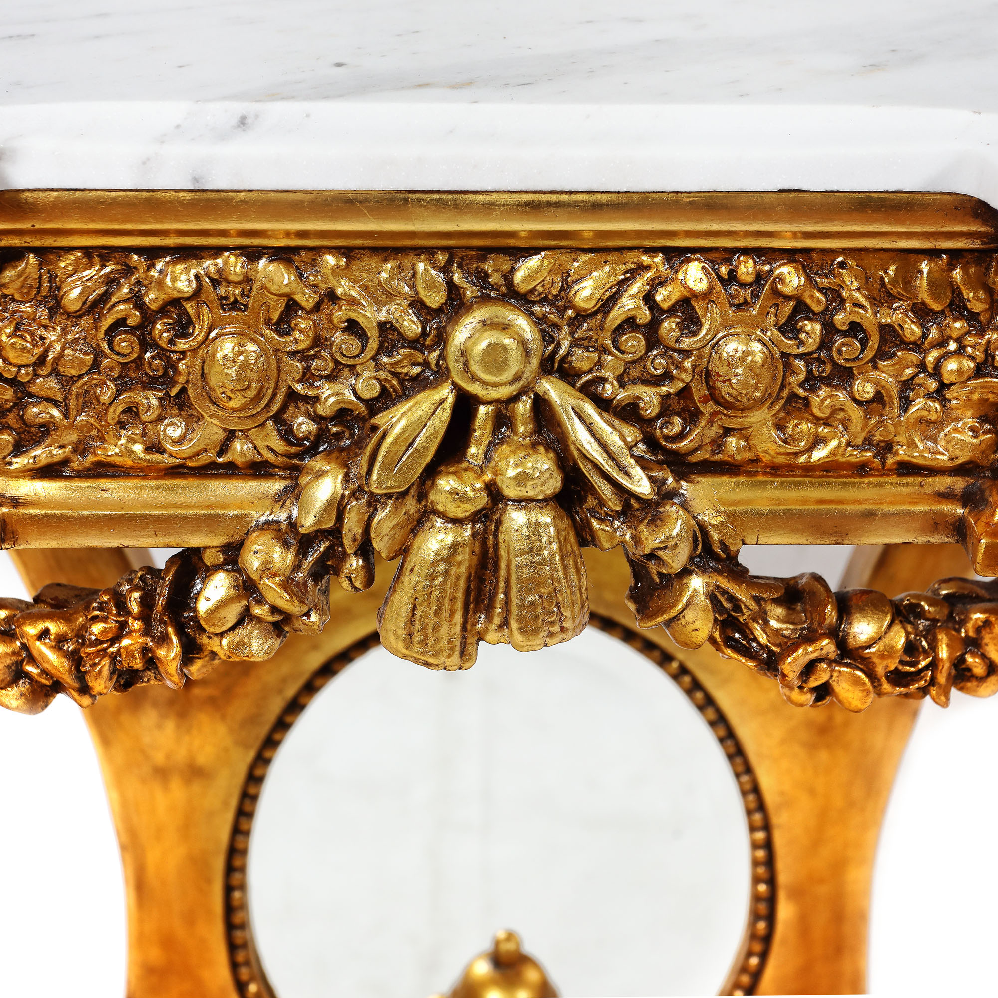 Masă consolă pe picioare colonete, unite la bază prin traverse, ghirlande și panou oglindă.