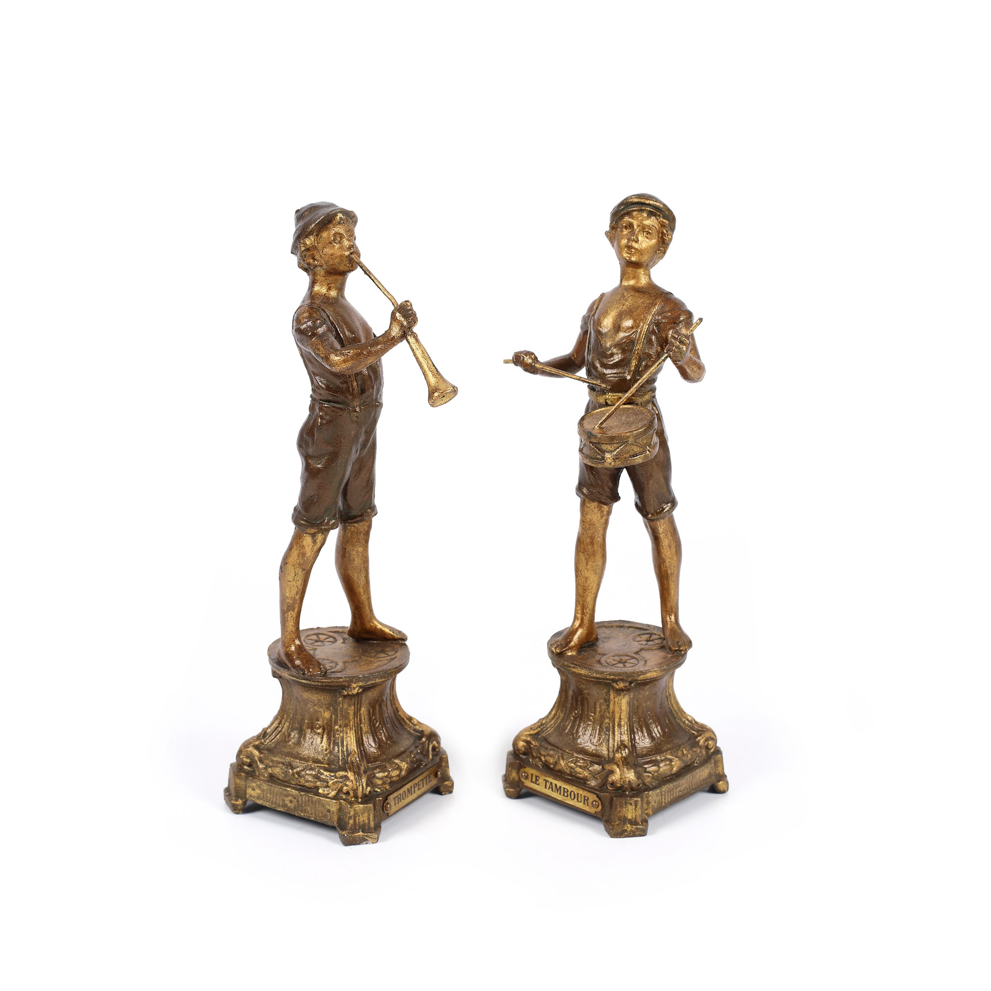 Pereche de tineri, „Le tambour” și „Trompette”, cu instrumente muzicale, pe socluri, cu decor convențional Louis XVI.