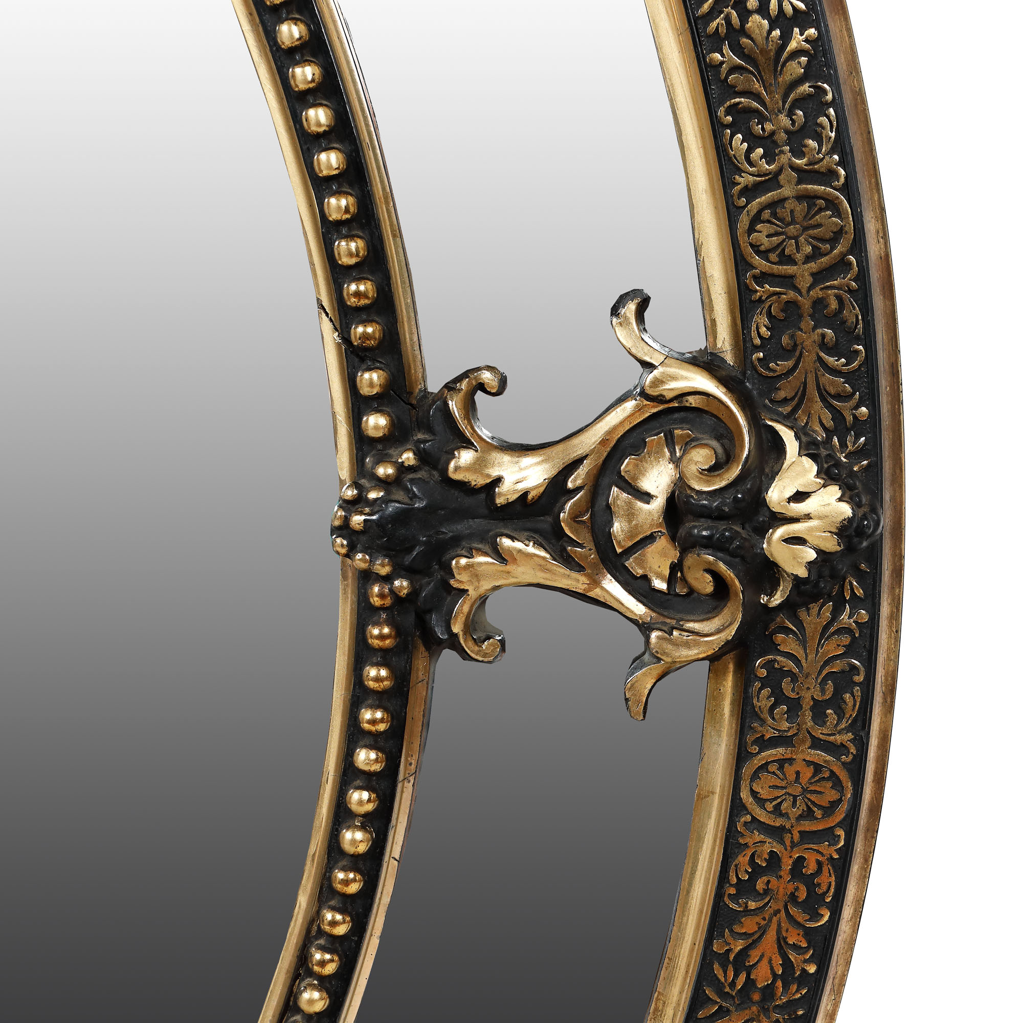 Oglindă monumentală, cu rama ovală, dublă, subliniată cu motiv perlat si ramuri vegetale, surmontată de medalion decorativ cu mascheron încadrat de volute vegetale.