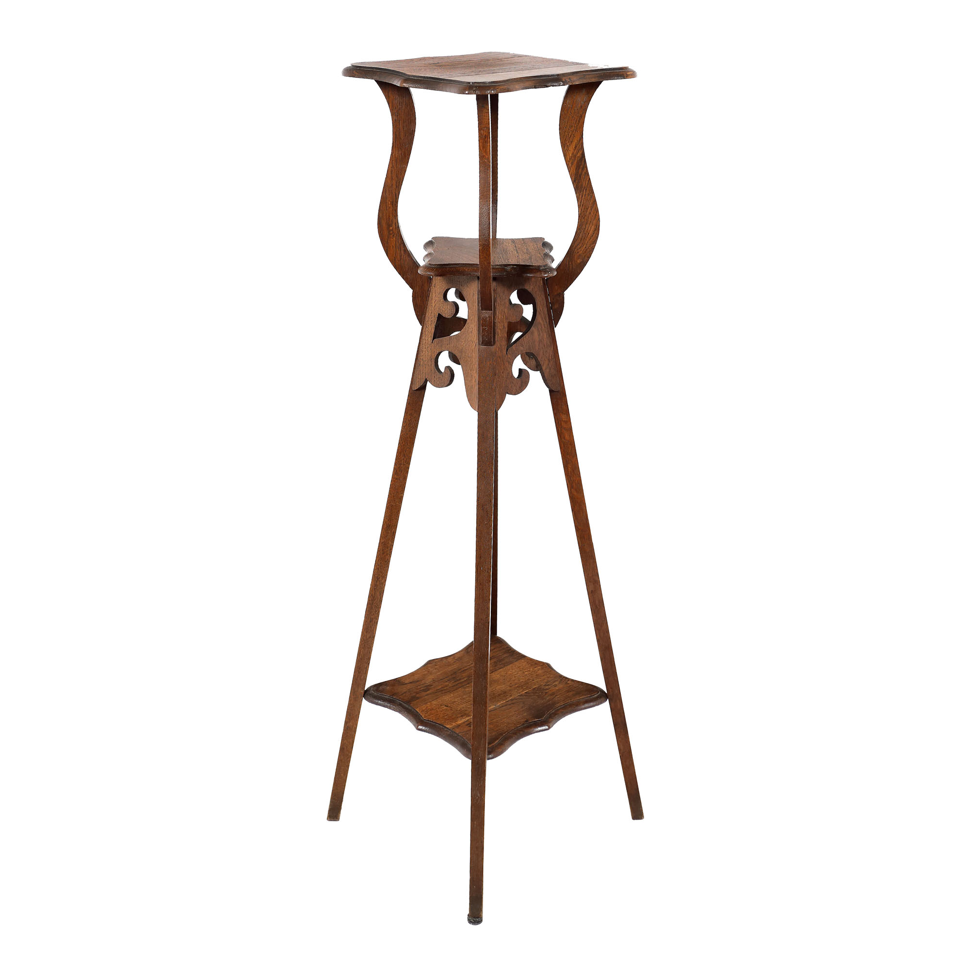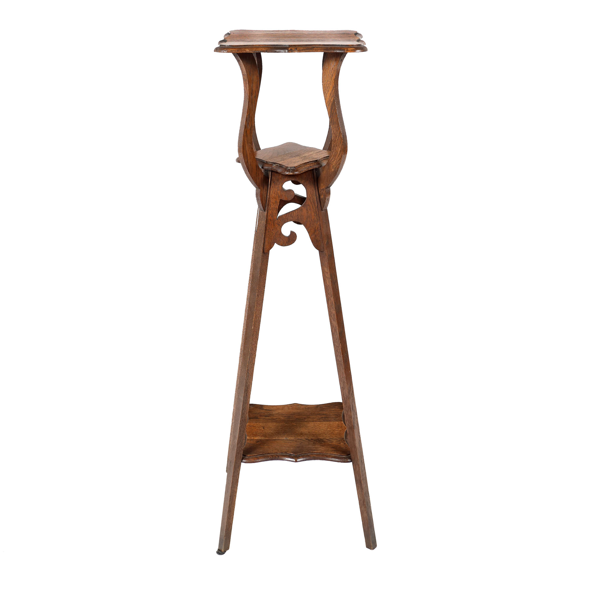 Postament pe picioare oblice, cu două etajere intermediare și blat cu borduri festonate.