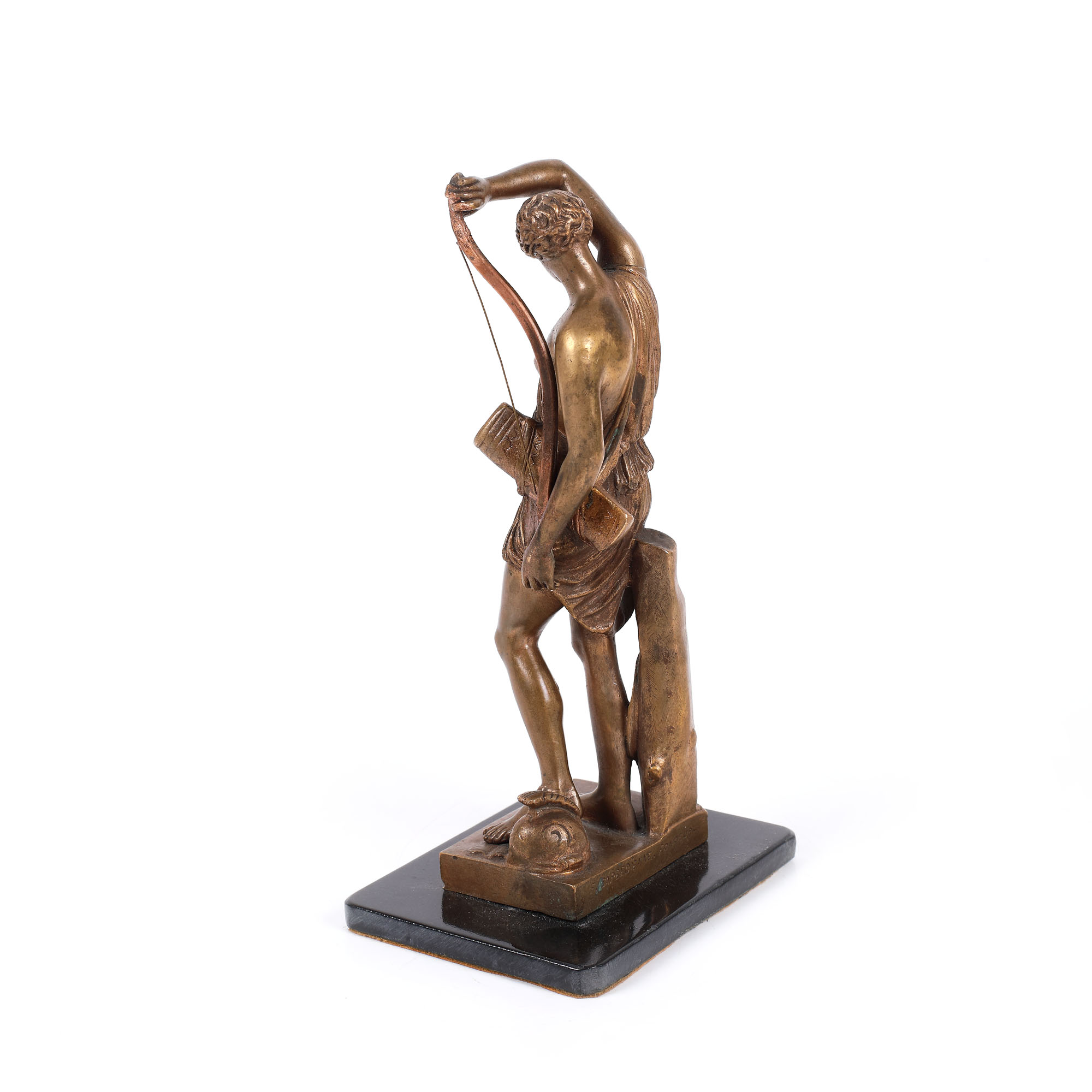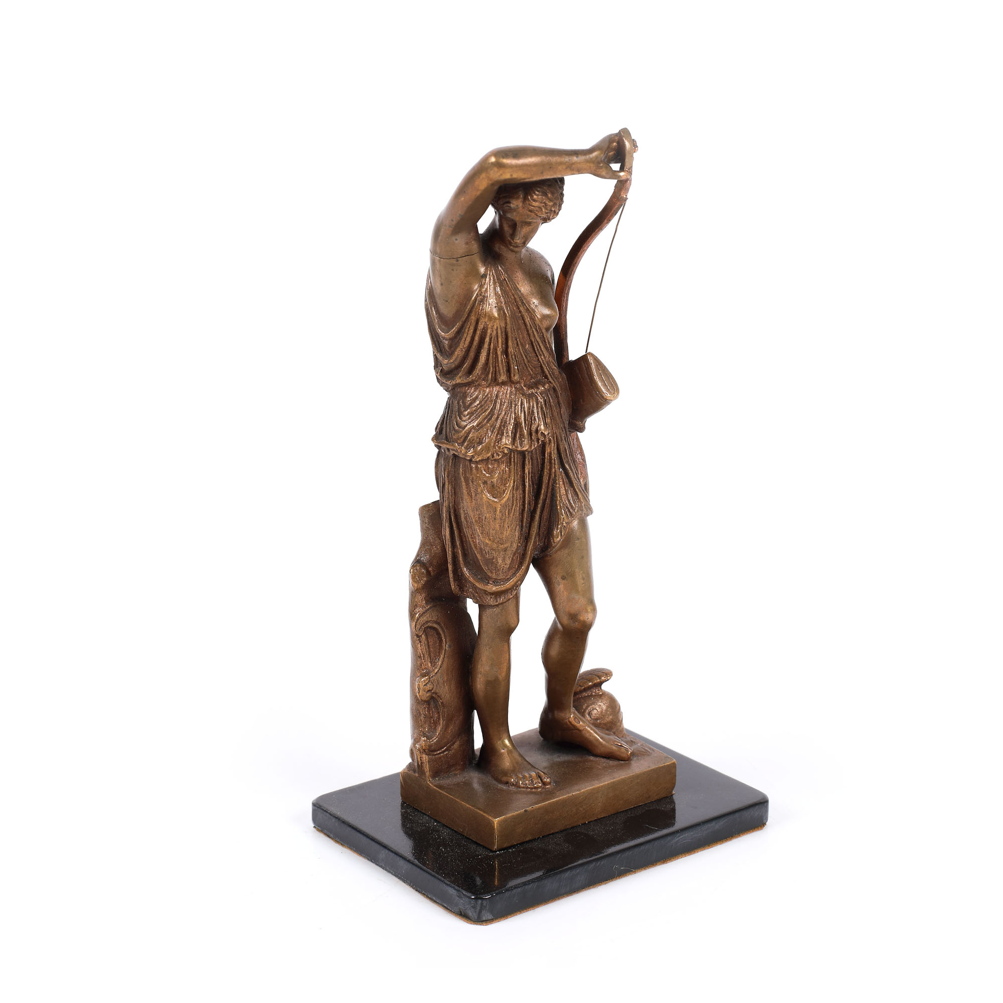 Sculptură mică, reprezentând-o pe zeița vânătorii, Diana, cu arc, tolbă și coif la picioare.