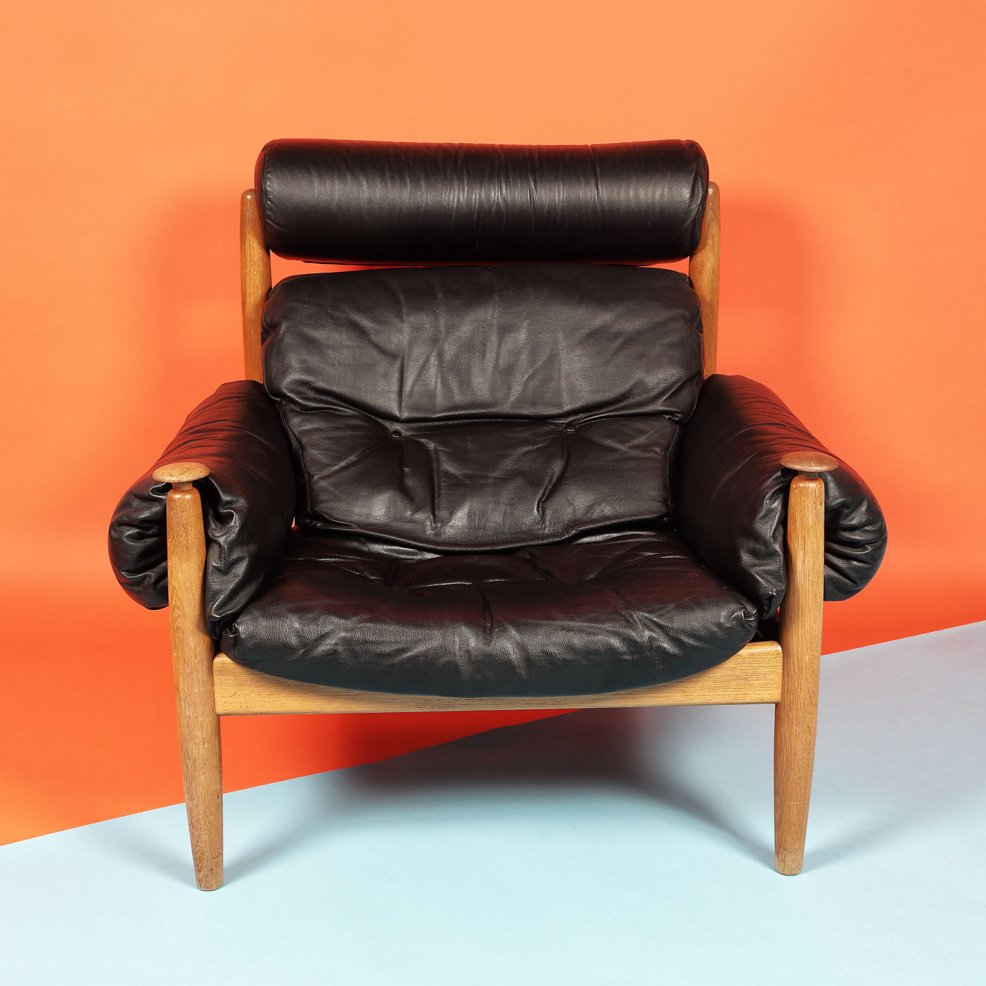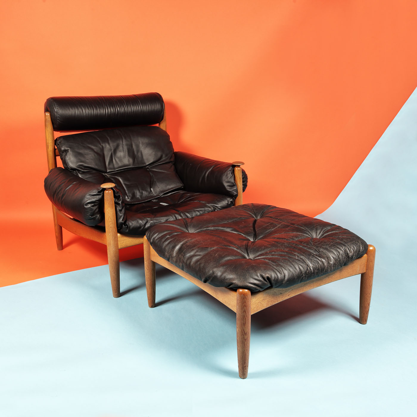 39. Fotoliu și taburet pentru lounge, din lemn de stejar, în manieră Sergio Rodrigues