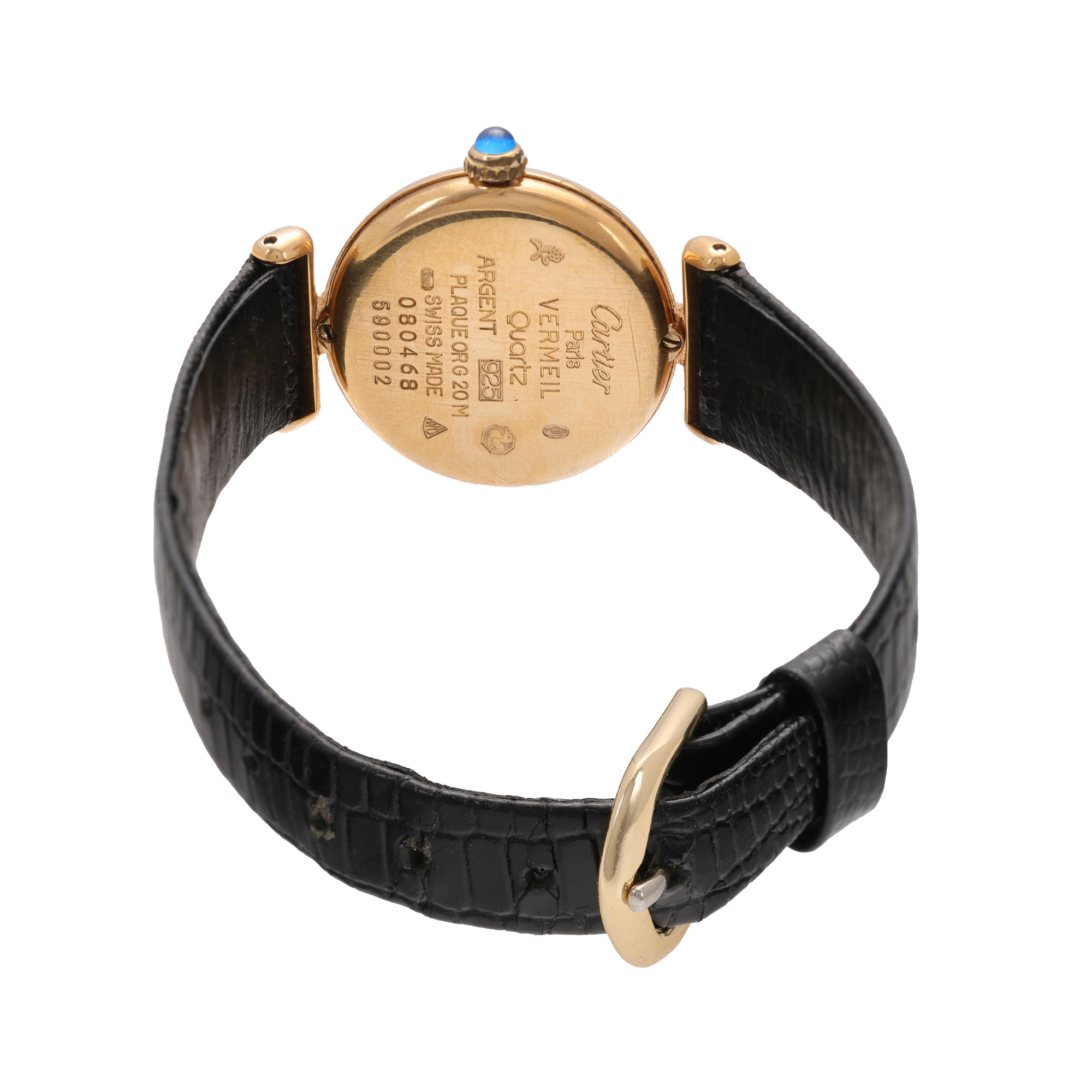 Ceas Cartier Colisee Vermeil, din argint placat cu aur, de mână, de damă, referință 590002. Mecanism quartz, calibrul 90. Cadran de culoare alb, indici cu numerale romane. Curea adăugată aftermarket, din piele, de culoare neagră, cu sistem de tip clasic. Accesorii: cutia originală.