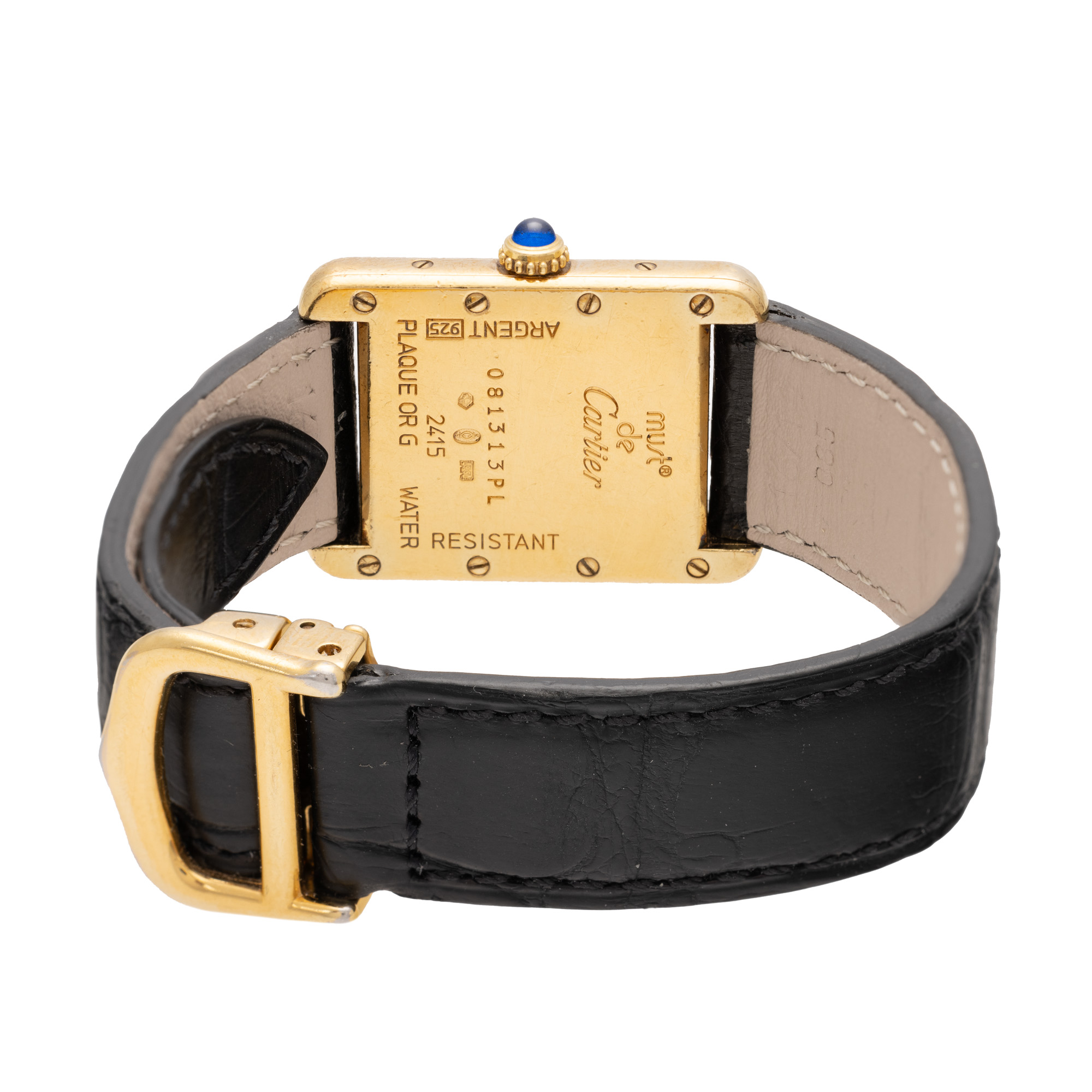 Ceas Cartier Must de Cartier Tank, din argint placat cu aur, de mână, de damă, referință 2415. Mecanism quartz. Cadran de culoare alb, indici numerale romane pentru orele pare. Curea adăugată aftermarket, din piele, de culoare neagră, cu sistem de închidere original de tip deployant.