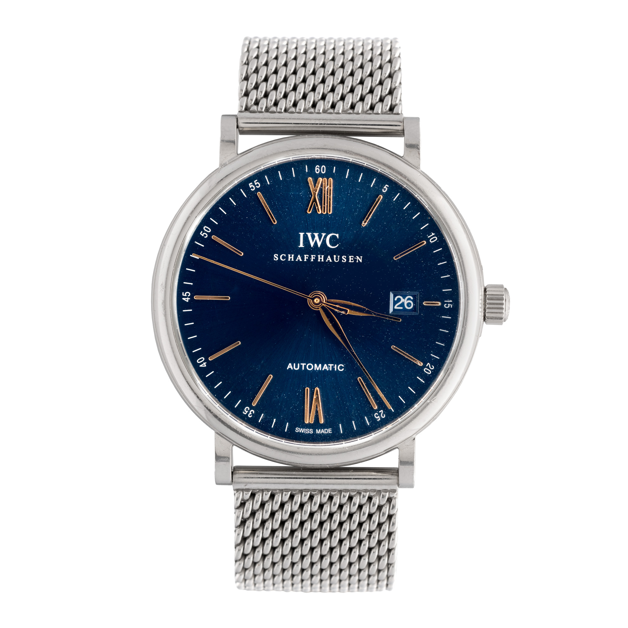 Ceas IWC Portofino, de mână, bărbătesc, referință IW3565. Mecanism automatic, calibrul 35111. Cadran de culoare albastru, indici numerale romane pentru orele 6 și 12 și baghete pentru restul orelor, registru pentru dată în dreptul orei 3. Brățară originală, din oțel, cu sistem de închidere de tip deployant.