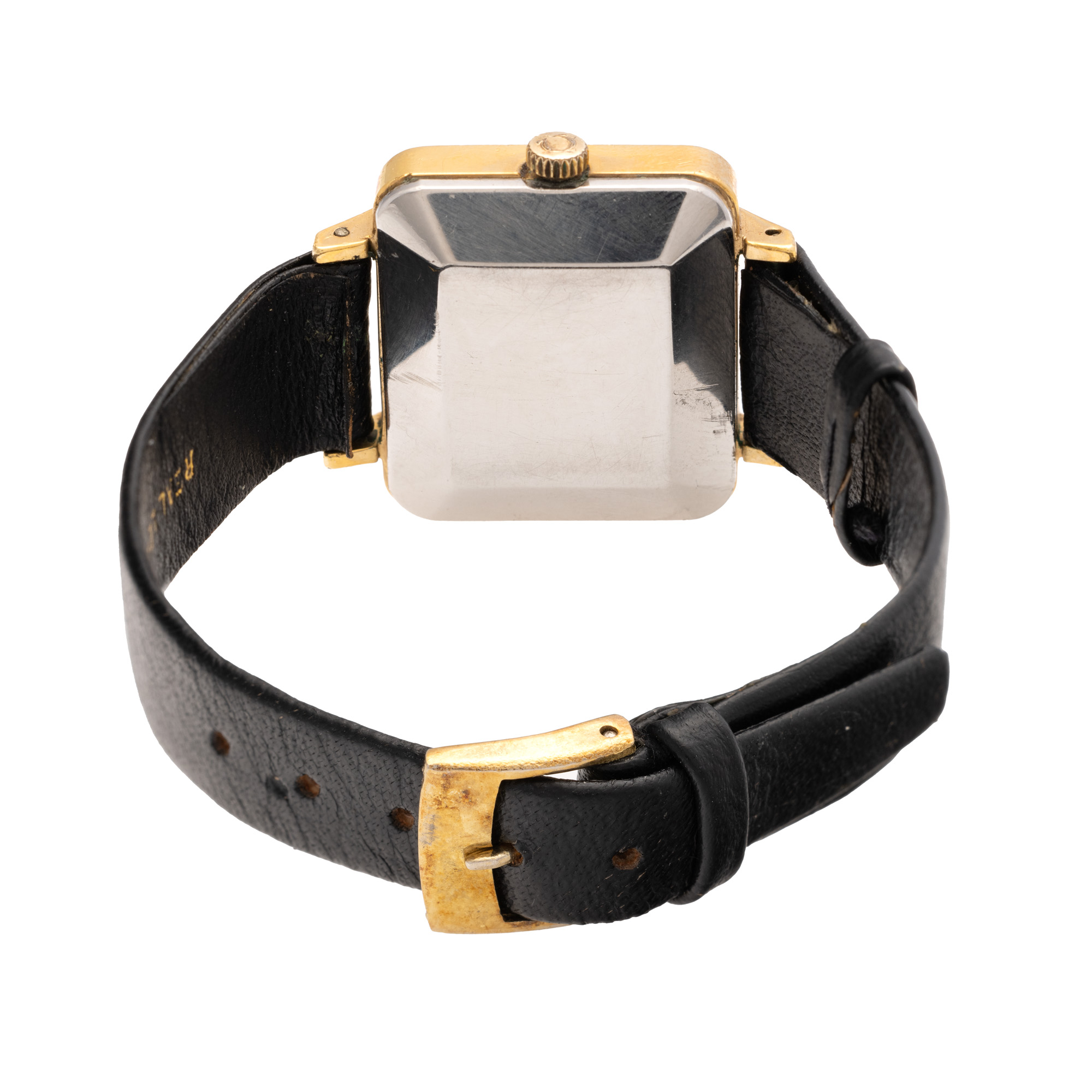 Ceas Omega De Ville Andrew Grima, din oțel placat cu aur, de mână, de damă. Mecanism automatic, calibrul 661. Cadran de culoare auriu, indici baghete pentru orele cardinale. Curea adăugată aftermarket, din piele, de culoare neagră, cu sistem de închidere clasic cu cataramă.