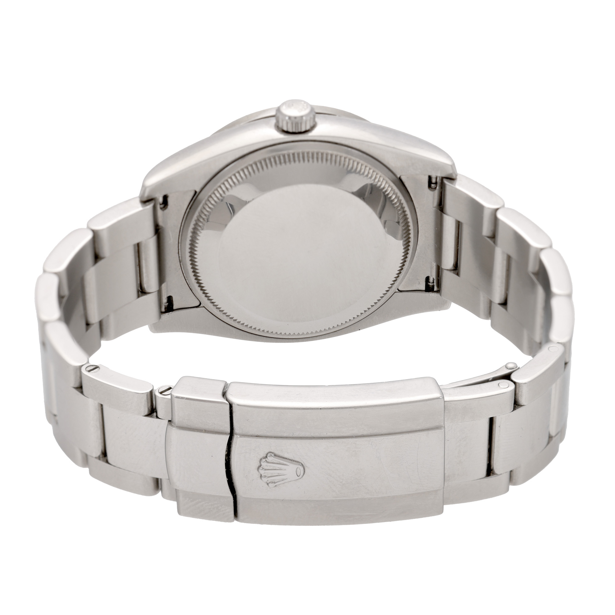 Ceas Rolex Datejust, din oțel cu diamante, de mână, de damă, referință 115234. Mecanism automatic, calibrul 3135. Cadran de culoare argintiu, indici numerale romane, registru cu lupă pentru dată în dreptul orei 3. Brățară originală, din oțel, cu sistem de închidere de tip deployant. Accesorii: cutia originală. Observații: bezel decorat cu diamante adăugat aftermarket.