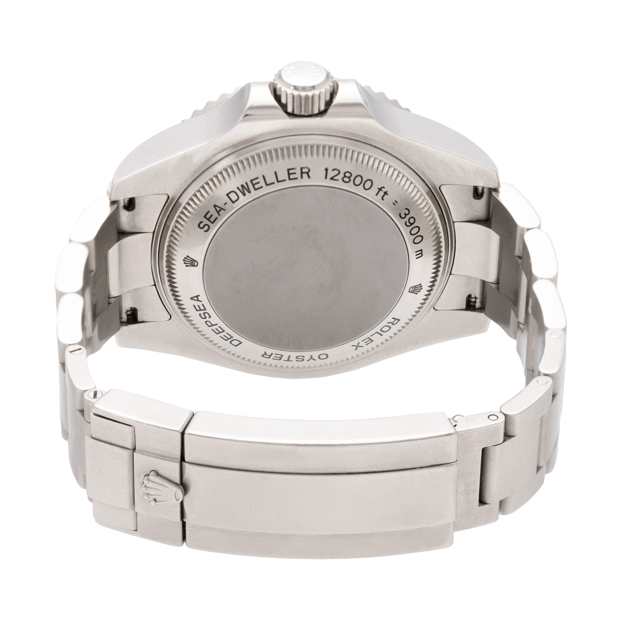 Ceas Rolex Sea-Dweller Deepsea, de mână, bărbătesc, referință 116660. Mecanism automatic, calibrul 3135. Cadran de culoare negru, indici puncte, cu un registru pentru dată în dreptul orei 3. Brățară originală, din oțel inoxidabil, cu sistem de închidere de tip deployant. Observații: geamul prezintă o zgârietură superficială în dreptul orei 6.