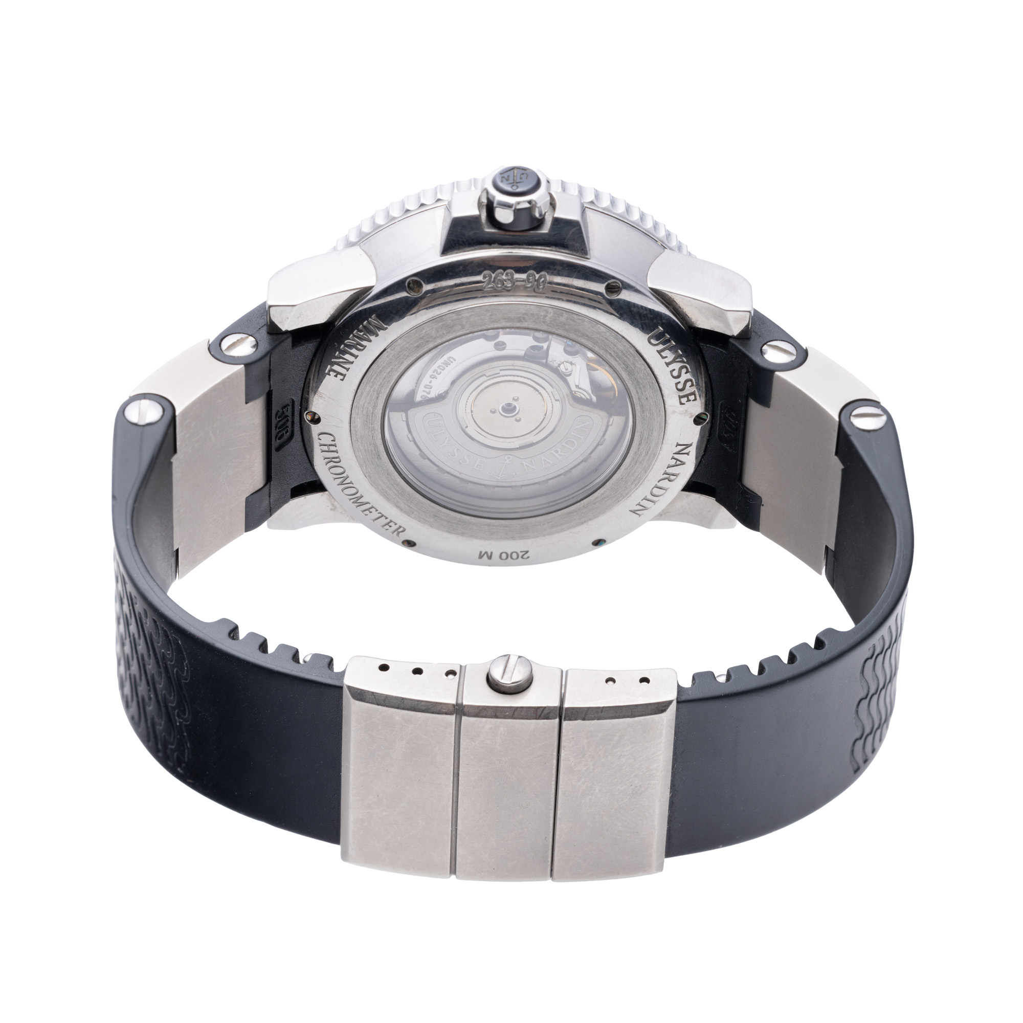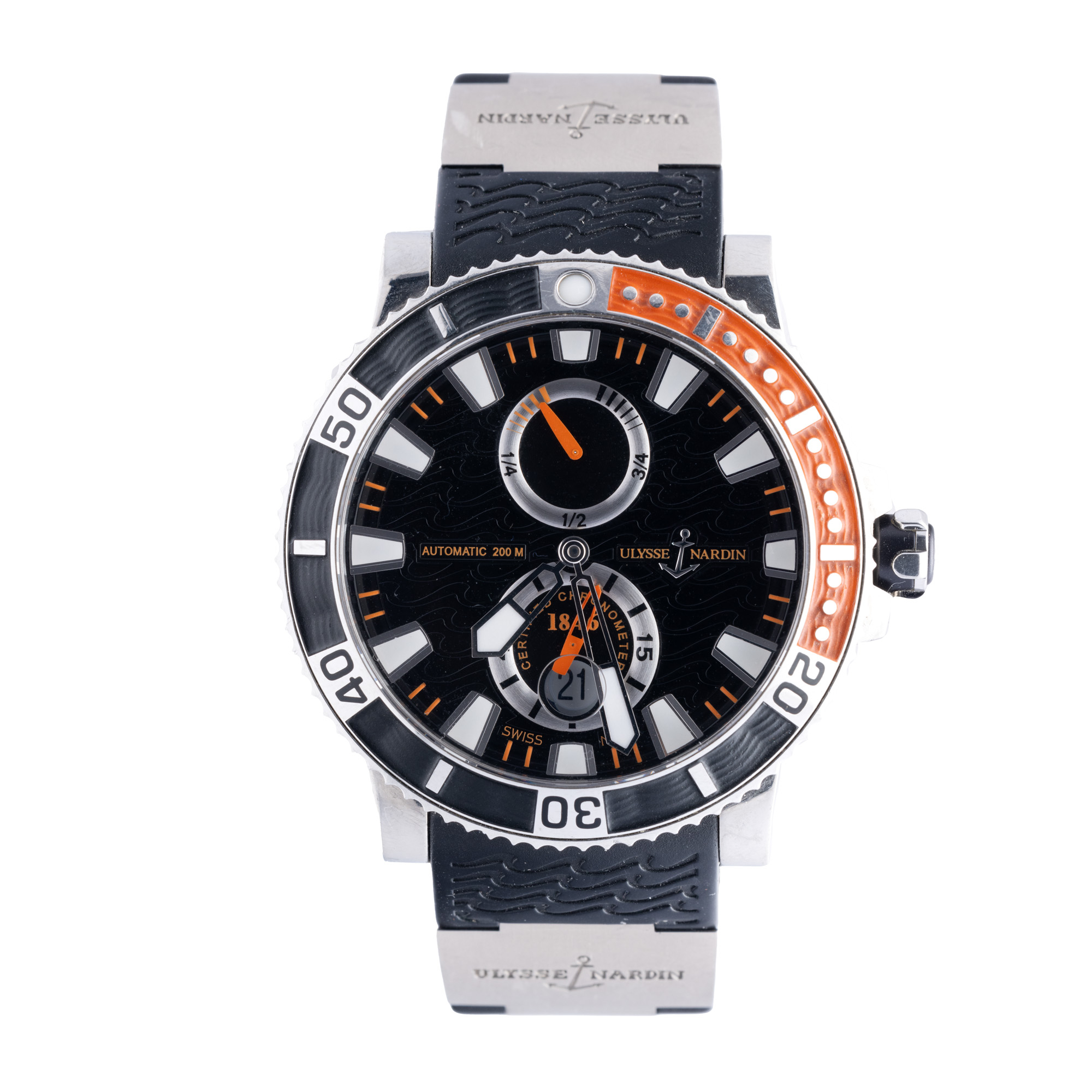 Ceas Ulysse Nardin Marine Diver, de mână, bărbătesc, referință 263-90, mecanism automatic. Cadranul negru cu "wave pattern" prezintă orar, minutar și indecși orari luminiscenți, două registre și dată cu lupă la ora 6. Ceasul are o rezervă de timp de 42 h. Bezel rotativ unidirecțional, curea de culoare neagră din cauciuc, cu "wave pattern" și închizătoare tip deployant, originale.