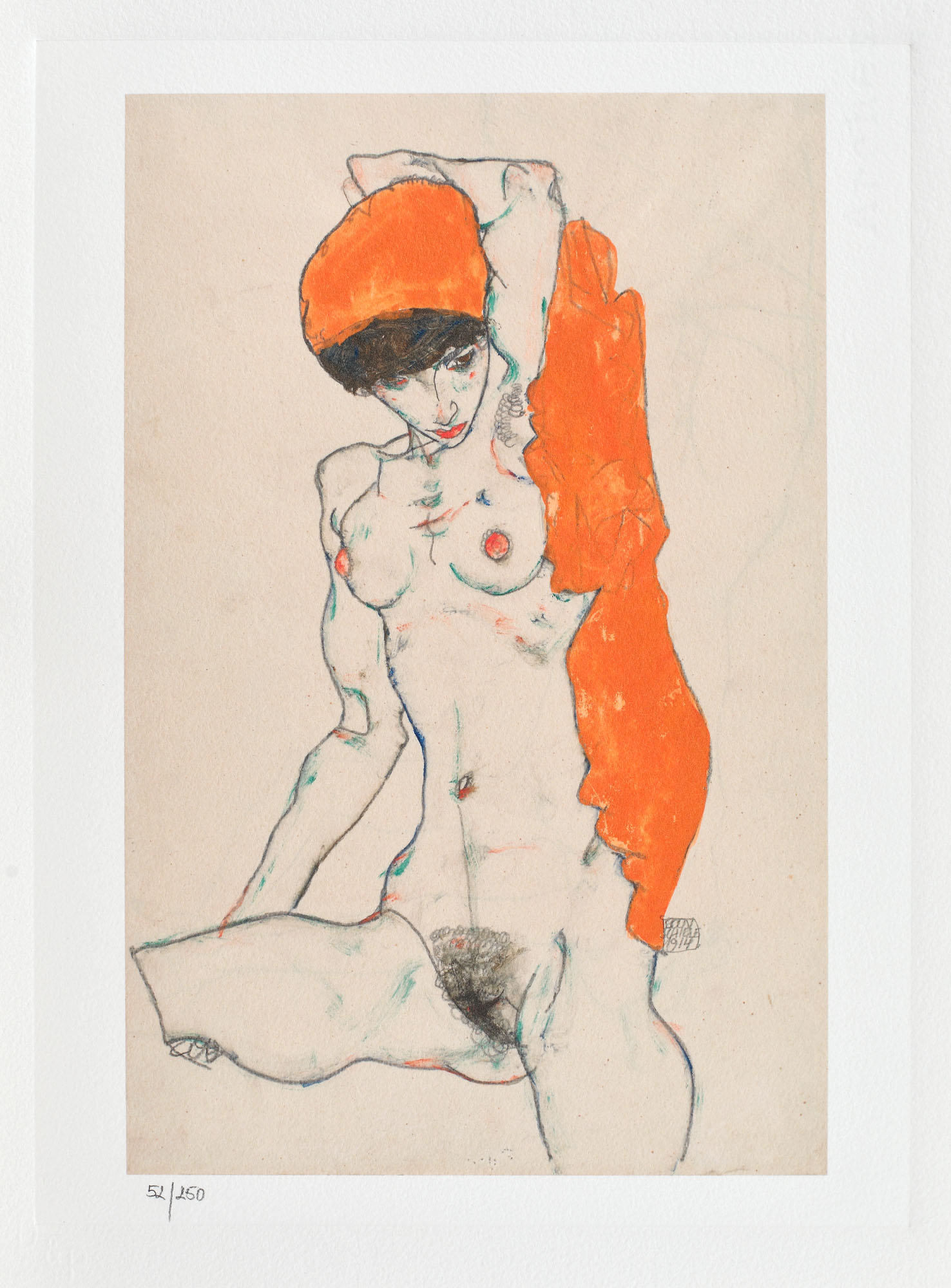 semnat și datat lateral dreapta jos, în placă, ”EGON SCHIELE, 1914”; numerotat stânga jos, sub cadru, în creion, ”52/250”; stânga jos, ștampila editurii, ”D&P CERTIFIED ARTS USA EUROPE SINCE 1997”