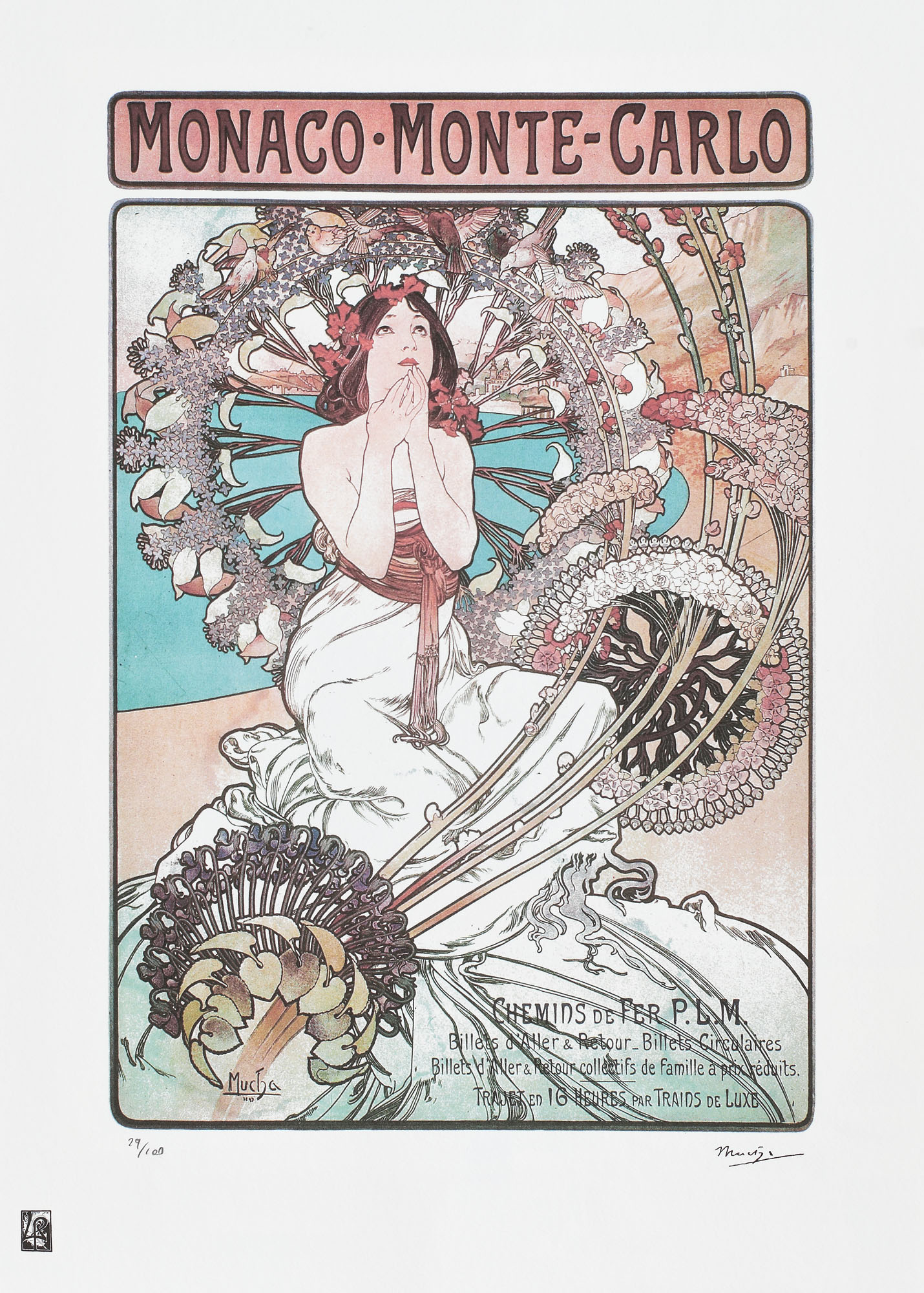semnat și datat stânga jos, în placă, ”Mucha, 1897”; semnat dreapta jos, sub cadru, ”Mucha”; numerotat stânga jos, în creion, ”29/100”