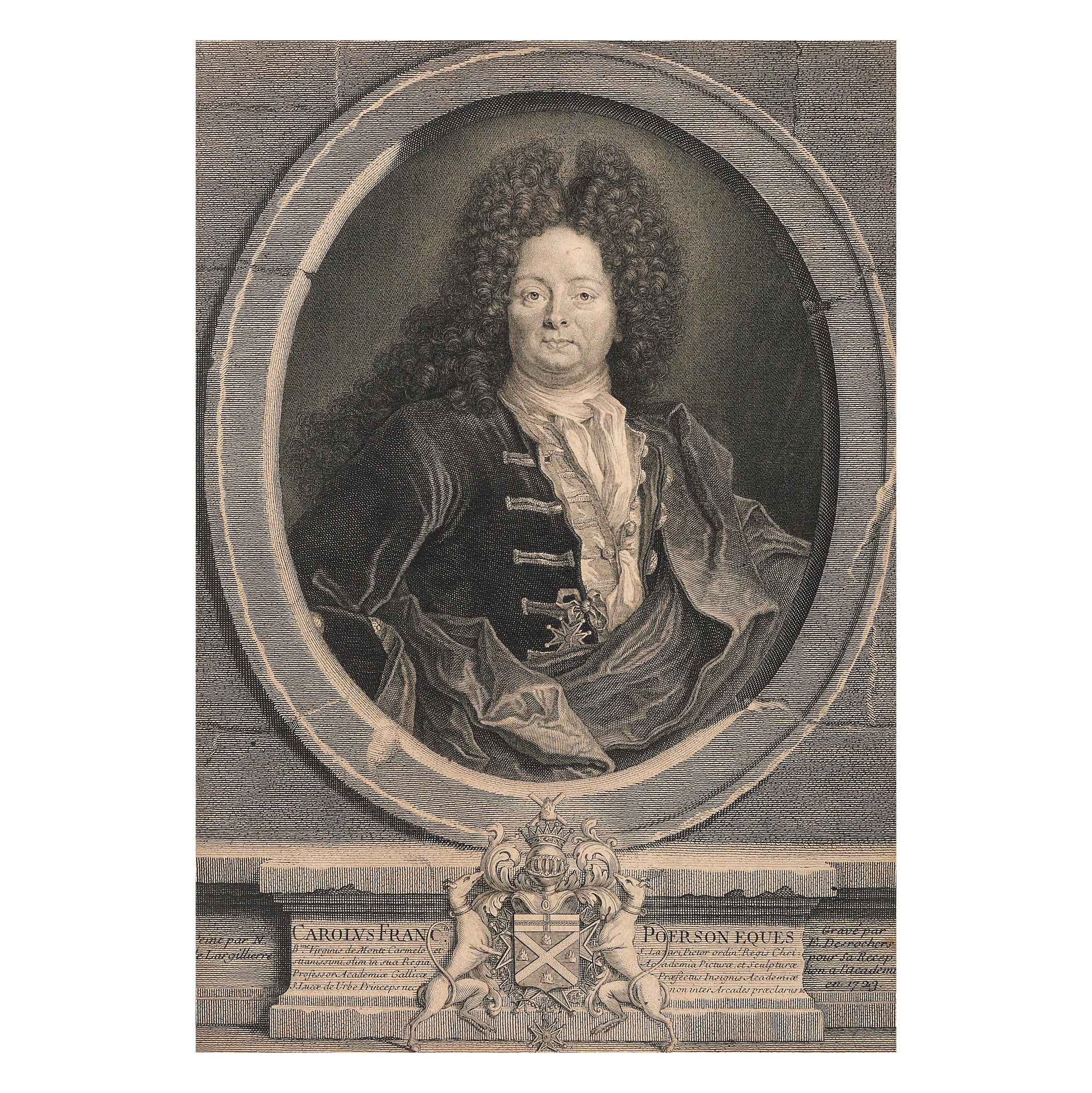 Gravura reprezintă portretul pictorului Charles-François Poerson (1653-1725) realizat cu ocazia primirii lui la Academia Franceză în 1723. Desenul era compus de Nicolas de Largillière (1656-1746) iar cel care l-a imprimat a fost gravorul Etienne-Jehandier Desrochers (1668-1741) la Paris. Piesa se prezintă într-o bună stare de conservare.