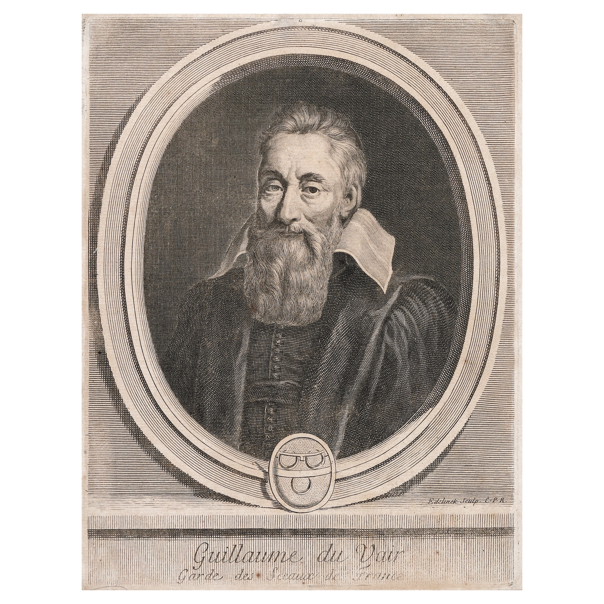Filosoful și juristul francez Quillaume du Vair (1556-1621) era numit în 1616 în demnitatea de "păstrător al sigiliilor", cea mai înaltă funcție a lumii juriștilor din Franța în epocă. Portretul de față era realizat de gravorul flamand naturalizat francez Gerard Edelinck (1640-1707). Gravură pe cupru.