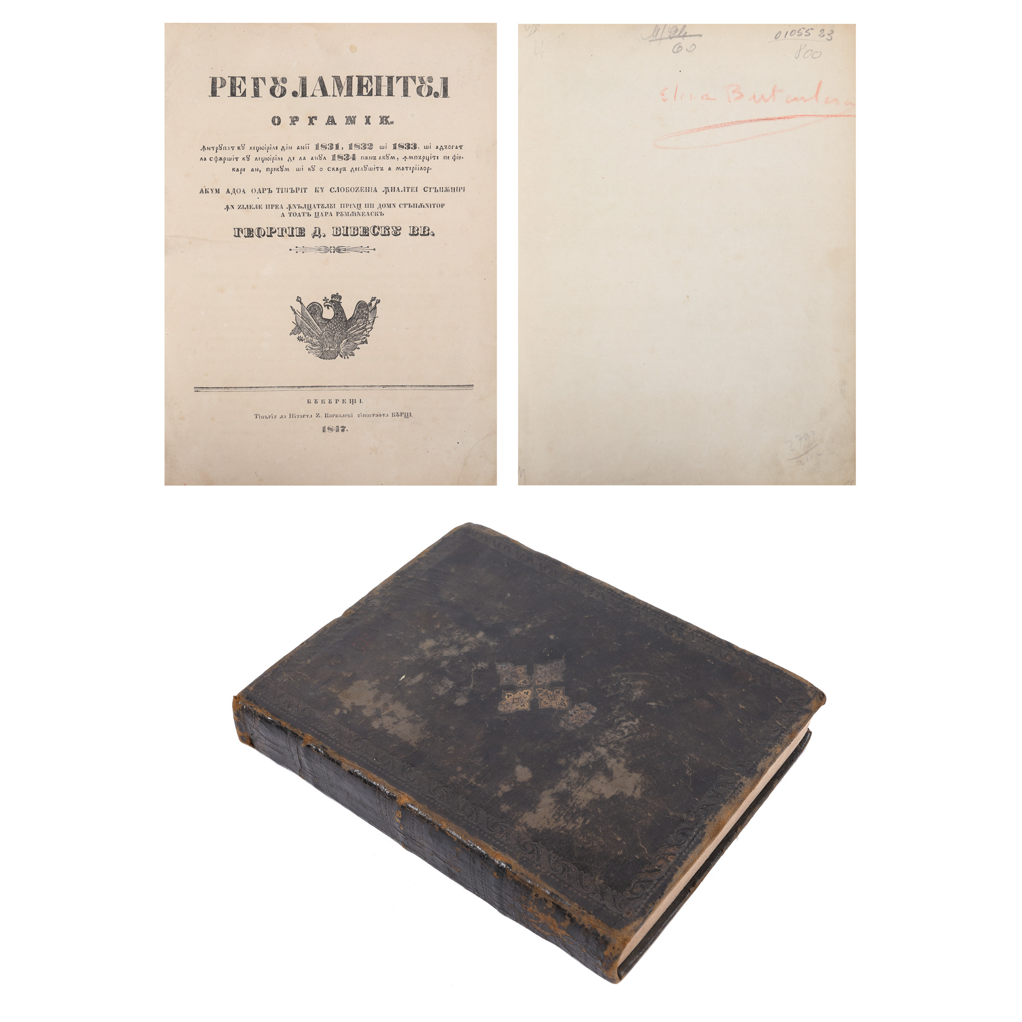 43. Regulamentul Organic al Ţării Româneşti, ediția tipărită în timpul domniei lui George Bibescu, de Zaharia Carcalechi, Tipograful Curţii, Bucureşti, 1847, provine din colecția scriitorului Vania Gherghinescu