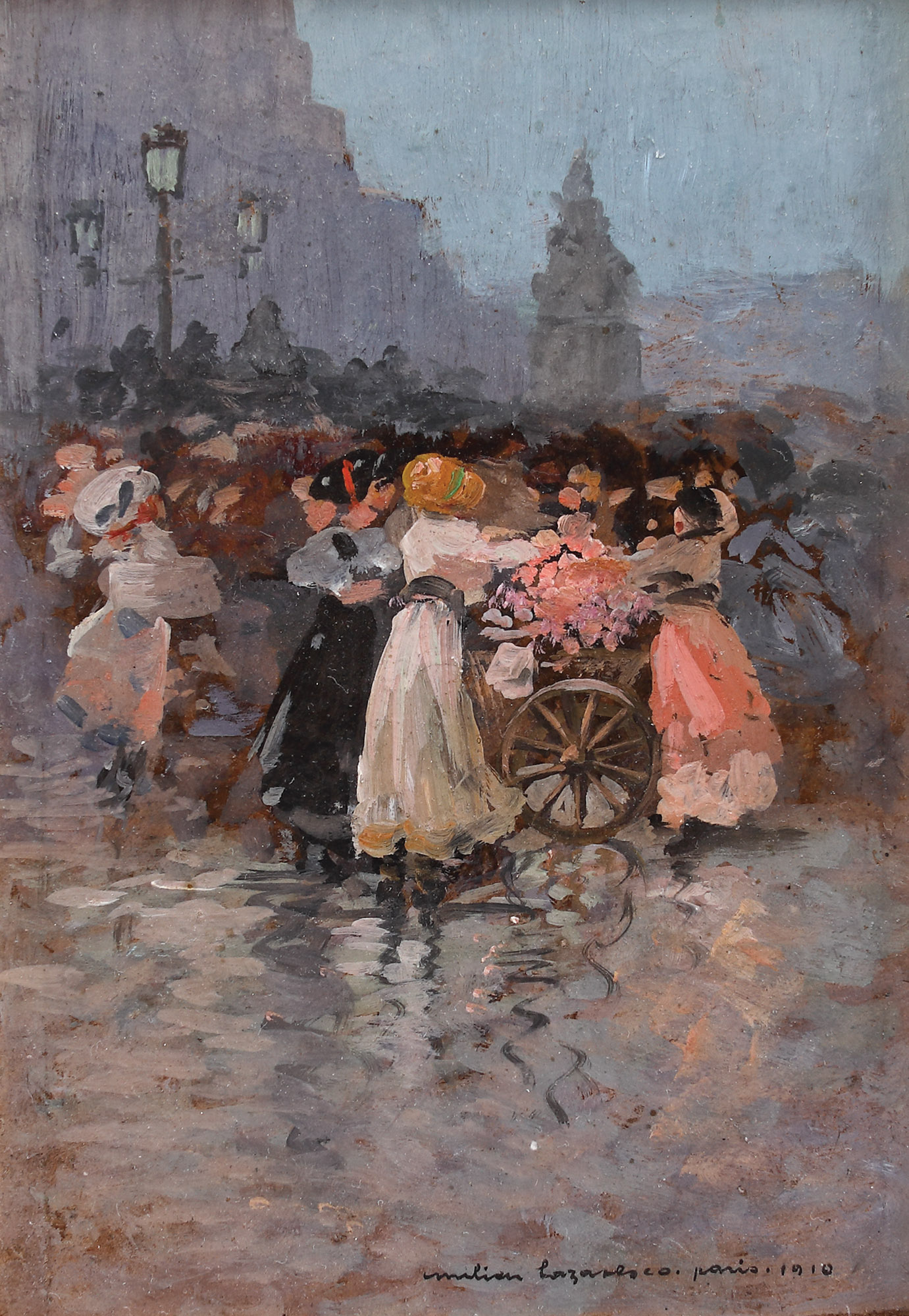 semnat, datat și localizat dreapta jos, cu negru, "Emilian Lăzăresco, 1910, Paris"