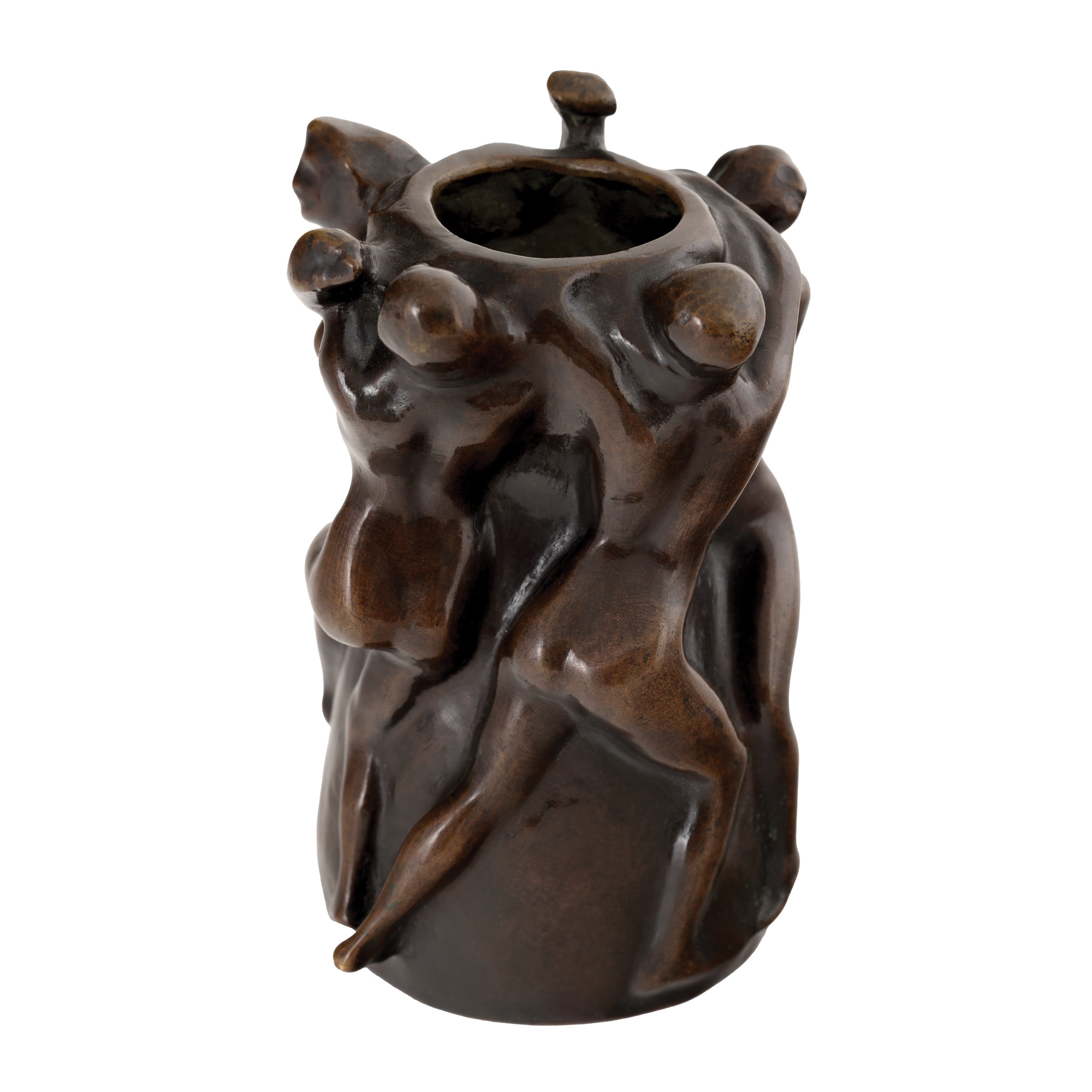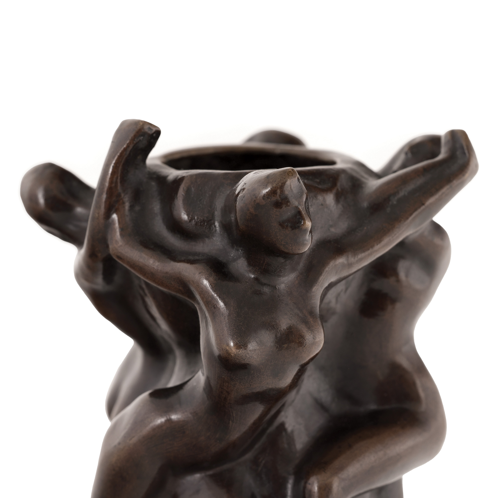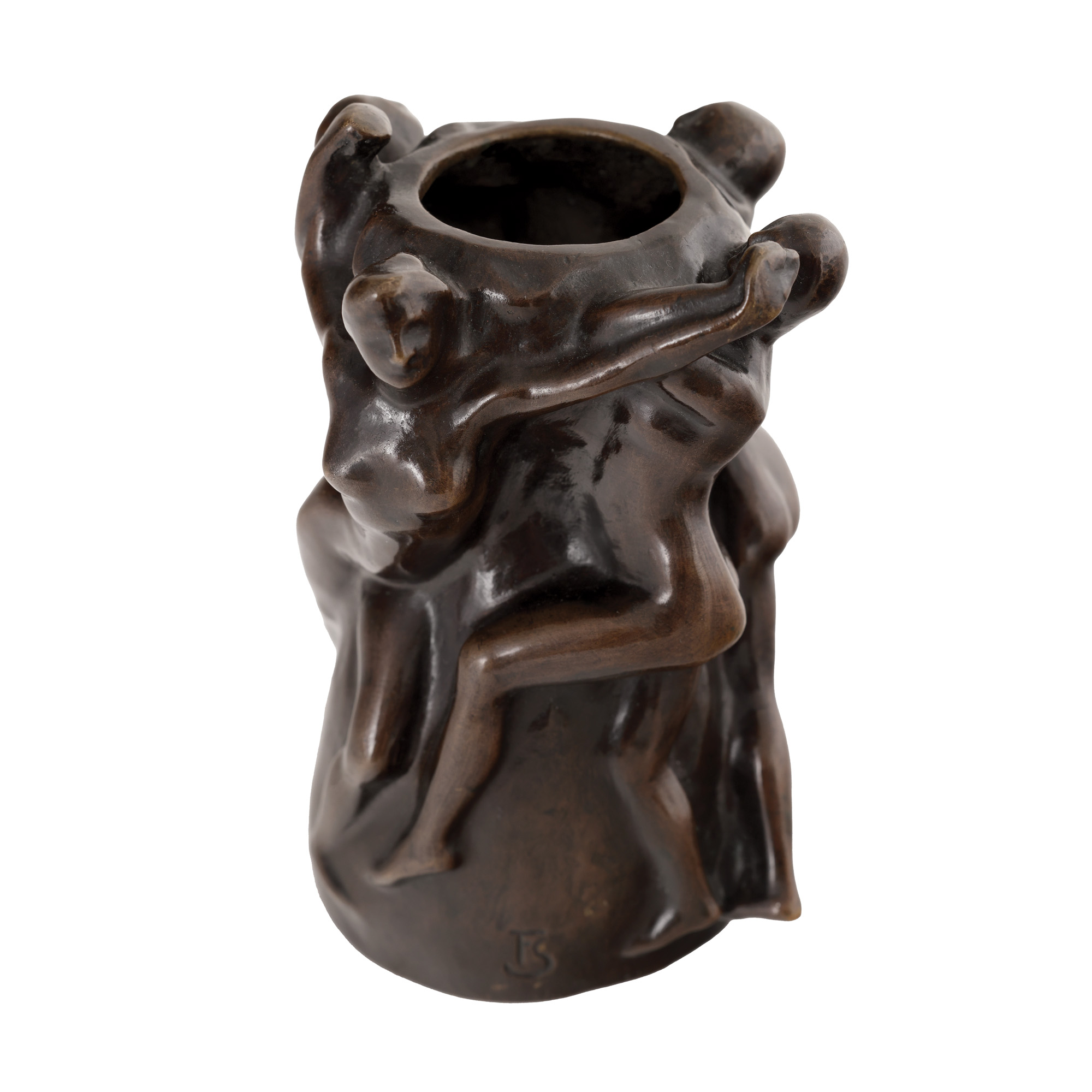 Artistul posedă o deosebită înțelegere a materialului cu care lucrează, astfel că experimentul în diverse medii nu îi va fi străin. Frederic Storck provine dintr-o familie care se dedică artei; tatăl (Karl Storck) și fratele său (Carol Storck) au fost, de asemenea, sculptori. Crește așadar printre doi artiști consacrați și pornește călătoria pe drumul artei elucidând tainele desenului. Va urma cursurile Școlii de Arte Frumoase din București, acolo unde va fi coleg cu Ștefan Luchian. Călătoria sa spre primul centru de studii din afara țării (în Italia) se va produce, ”conform tradiției medievale”, pe jos, exact așa cum urmase și tatăl său drumul Parisului cu câteva decenii în urmă. Inițial, vocația sa se va divide între pasiunea pentru arta plastică și modelaj; și muzică. În drumul său către Italia, își va petrece zilele cântând arii din ”Nibelungen” ori arii din ”Olandezul zburător”. Însă moștenirea familială ce-i ridica probleme la nivelul corzilor vocale nu l-a lăsat să se bucure cu adevărat de pasiunea muzicală. Ulterior ajunge în mediul academic münchenez și participă la expoziția de la Glaspalast, unde îi va fi conferit un premiu. În Bavaria conștientizează importanța studiului anatomic și a studiului după modelul viu, astfel că se vor distinge, din această perioadă, o serie de sculpturi menite să îl ajute pe artist să experimenteze reproducerea întocmai a detaliilor trupurilor. Interesat de proprietățile materialului cu care lucrează, va tăia singur piatra sau marmura, apropiindu-se astfel mai mult de material. Din 1906 devine profesor la Școala de Arte Frumoase și va avea misiunea de a introduce elevii în universul desenului și al modelajului. Își va asuma o abordare clasică, ce se distanțează însă de academism și va dedica o întreagă serie operelor de mici dimensiuni în care își concentrează atenția asupra subiectului uman. O primă variantă din seria de față lua naștere în anul 1916 și era intitulată sugestiv ”Dănțuitoarele”. Motivul avea să fie reluat atât în ghips patinat, cât și în bronz, semn că artistului îi era necesar experimentul și interacțiunea îndeaproape cu diversele tipuri de materiale utilizate. Remarcăm așadar un impunător vas în pereții căruia rezidă nimfele, cariatide ale universului său artistic, într-un fascinant dans feeric.