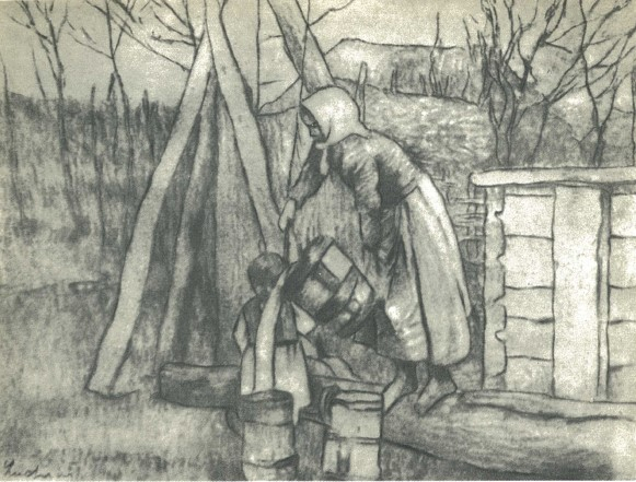 Alături de cei doi frați mai mici și de copiii din vecini, Ștefan Luchian se va găsi adesea jucându-se pe străzile învecinate casei sale și va porni, deseori, în așa-zise expediții către Podul Vergului, Obor sau mahalaua Negustorilor. Duminica se aventura pe drumul bisericii, acolo unde i se îngăduia, uneori, să tragă clopotul cel mare. Deși este fiul unui fost maior-comandor al garnizoanei din Ștefănești, Luchian nu va urma cursurile Școlii de Infanterie, ci va studia simultan Belle Artele și Conservatorul. Din perioada de început a creației sale datează o serie de portrete dedicată membrilor familiei sale, executate fie după model, fie după fotografii. Amintim aici lucrările dedicate mamei, pe care o transpune în mijlocul peisajelor câmpenești, cu trupul întins pe iarbă, sau căreia îi schițează trăsăturile în portrete. Redă cu același interes chipuri pe care le întâlnește în existența sa cotidiană, dar și oameni de la sat, florărese sau nomazi. Însă muzicalitatea operei sale plastice se transpune mai cu seamă în fizionomiile și chipurile feminine. Surprinde, de cele mai multe ori, femei elegante, misterioase, pline de grație, care par să ”stea la pozat”, cu vădite influențe ale impresionismului francez. Artistul se remarcă și în autoportrete, acolo unde adoptă o paletă mai sobră și mizează pe redarea umbrelor grave. Deși portretele realizate de Luchian sunt adesea individualizate, ele devin exponențiale pentru o întreagă categorie socială. În bogata sa operă portretistică, artistul surprinde drama umană, chipurile apăsate de gânduri și privirile măcinate de drame sufletești ale personajelor sale. De la mamele care își țin nou-născuții la piept și până la ipostazele de iubire profundă pe care le relevă îmbrățișările strânse dintre mamă și copil, maternitatea a fost adesea interpretată drept simbol în artă. Cele mai vechi cartografieri ale temei datează de secole, iar printre primele reprezentări identificate se numără Fecioara Maria cu pruncul în catacombele Priscillei din Roma. Regăsim subiectul reluat de artiști consacrați la nivel mondial precum Michelangelo, Renoir, Dorothea Lange, Paul Cézanne, Gustav Klimt, Mary Cassatt și nu numai. Însă de la ”Madona cu pruncul” și până la ”Lăutul” lui Luchian, subiectul a evoluat și a luat diverse forme și semnificații. Ștefan Luchian reia, așa cum aminteam, tema maternității în opere precum ”Lăutul”, ”Țărancă cu copil” sau ”La fântână”. Predomină aici simplitatea și apropierea de un gest cât mai uman, momentele de maximă intimate ori sentimentul de dragoste maternă. Opera de față reunește două teme întâlnite adesea în creația artistului: maternitatea și viața satului. Remarcăm așadar figura mamei reprezentată în straie populare, și grija maternă exemplificată prin modul în care își poartă copilul în brațe.