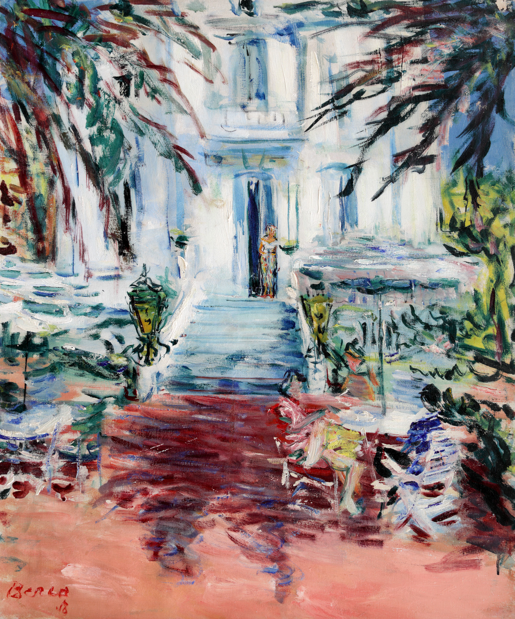 De la interioarele cu fereste mari, larg deschise către superbele peisaje însorite și până la suprinderea clădirilor din planul exterior, învăluite în verdele ierbii și umbrele copacilor, Dimitrie Berea va dedica un amplu studiu cadrului natural. În creația sa, monumentalele construcții arhitecturale, marcate prin albul elegant și scările somptuoase se vor succede într-un ritm antrenant cu palmierii sau grădinile înflorite. Împrumutând din caracteristicile impresionismului și ale fauvismului, artistul va realiza o serie de experimente cromatice în care va pune în valoare lumina și culoarea. Desenul viu, echilibrat și armonizat cu paleta cromatică și tușele scurte, suprapuse grăbit, ni-l relevă pe artist în ipostaza unui veritabil colorist. Depășește preceptele impuse de impresionism și își însușește o mare libertate de creație, astfel că umbrele sale vor căpăta, uneori, accente neașteptate, în nuanțe violet-albăstrui. Dimitrie Berea își va însuși procesul picturii în plein-air ab initio, astfel că profitând de firea sa volubilă va lucra direct în fața subiectului - la Paris, la Londra sau în America - și va profita de aceste momente de creație pentru a interacționa cu publicul curios. În ciclul dedicat peisajelor din sudul Franței, artistul își omagiază maeștrii: pe Renoir, Bonnard sau Matisse. În opera de față, peisajul este încununat de prezența personajelor mai degrabă sugerate. În planul din dreapta jos, la baza scărilor, observăm așezate la masă câteva persoane. Central, în dreptul ușii grandioase, o siluetă feminină își face simțită prezența sub auspiciul cromaticii vii, calde, cu accente clare ale luminii solare. Observăm, așadar, și prin intermediul acestei lucrări faptul că o constantă a operei sale – și anume invazia culorii – îl va urmări în toate etapele carierei sale artistice.