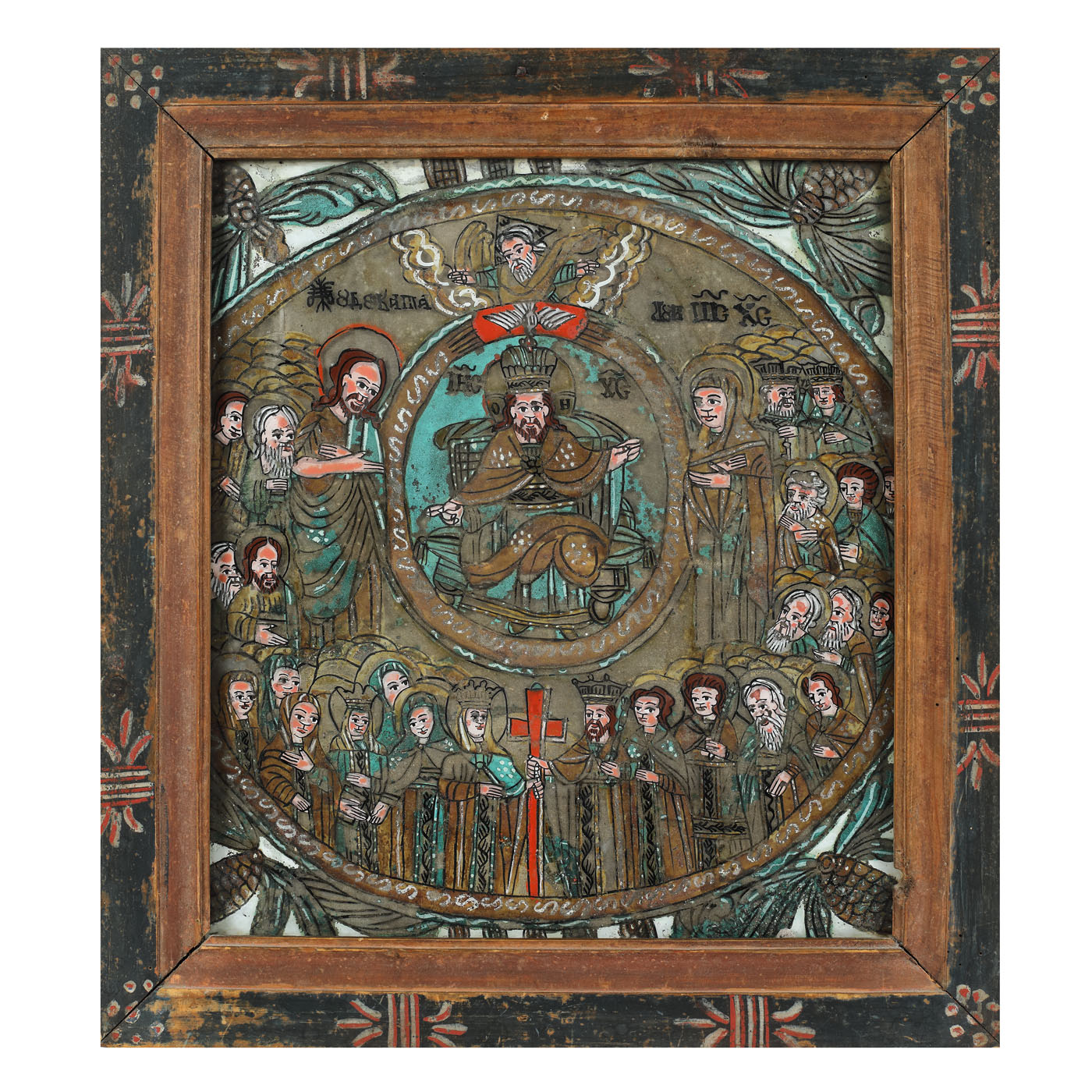44. Icoană pe glajă, ”Judecata de Apoi”, ramă pictată, atelier transilvănean (Laz), începutul sec. XIX, piesă extrem de rară, de colecție, provine din colecția muzeologului Alexandru Marinescu