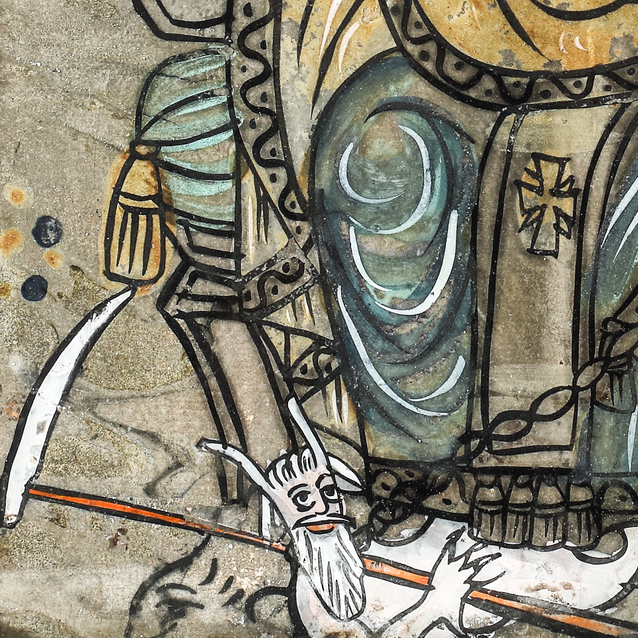 Sfântul Haralambie, pe tron, calcă în picioare personificarea ciumei. Pictura este remarcabilă prin acuratețea desenului și gama cromatică sobră.