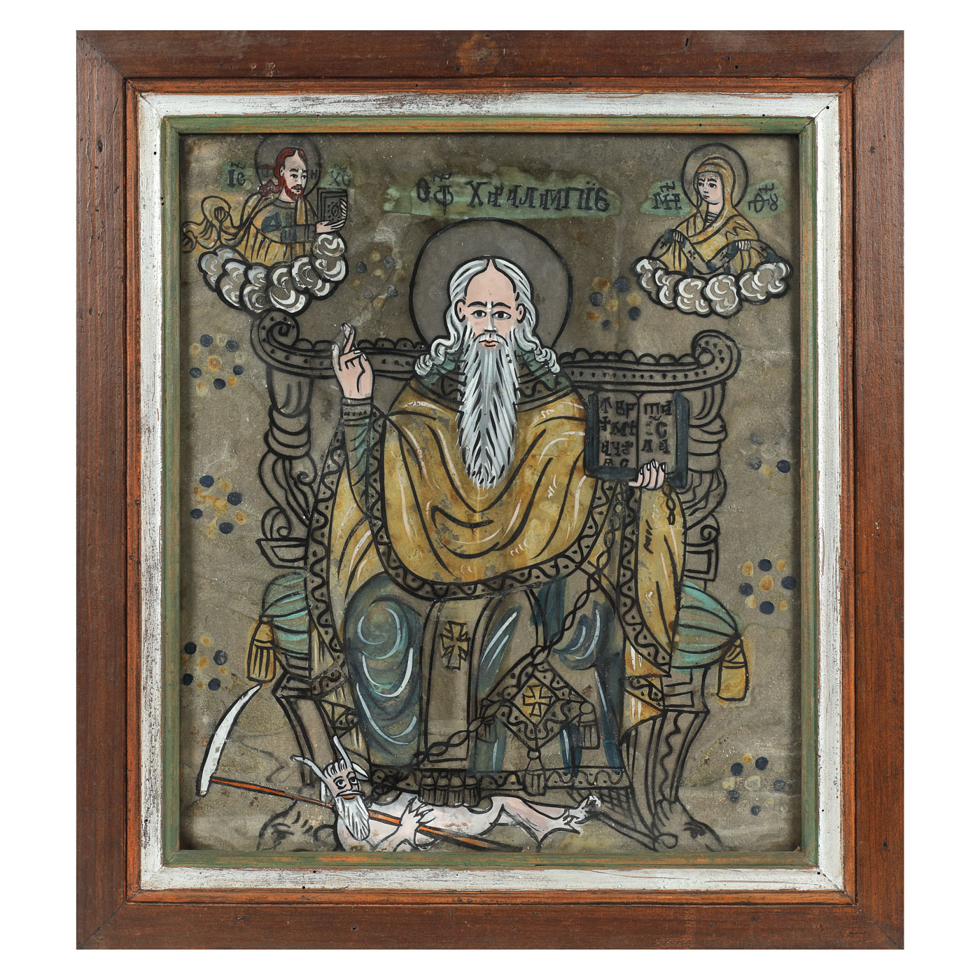 42. Icoană pe glajă, ”Sfântul Haralambie pe tron, legând ciuma”, ramă pictată, atelier transilvănean (Laz), prima jumătate a sec. XIX, piesă rară, provine din colecția familiei ieșene Leon Sculy Logotheti