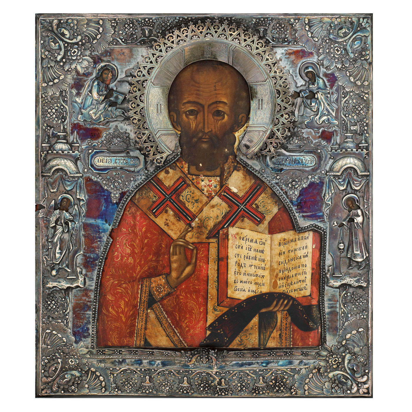 41. Icoană pe lemn, cu ferecătură din argint, "Sfântul Nicolae", școală rusească, cca. 1800