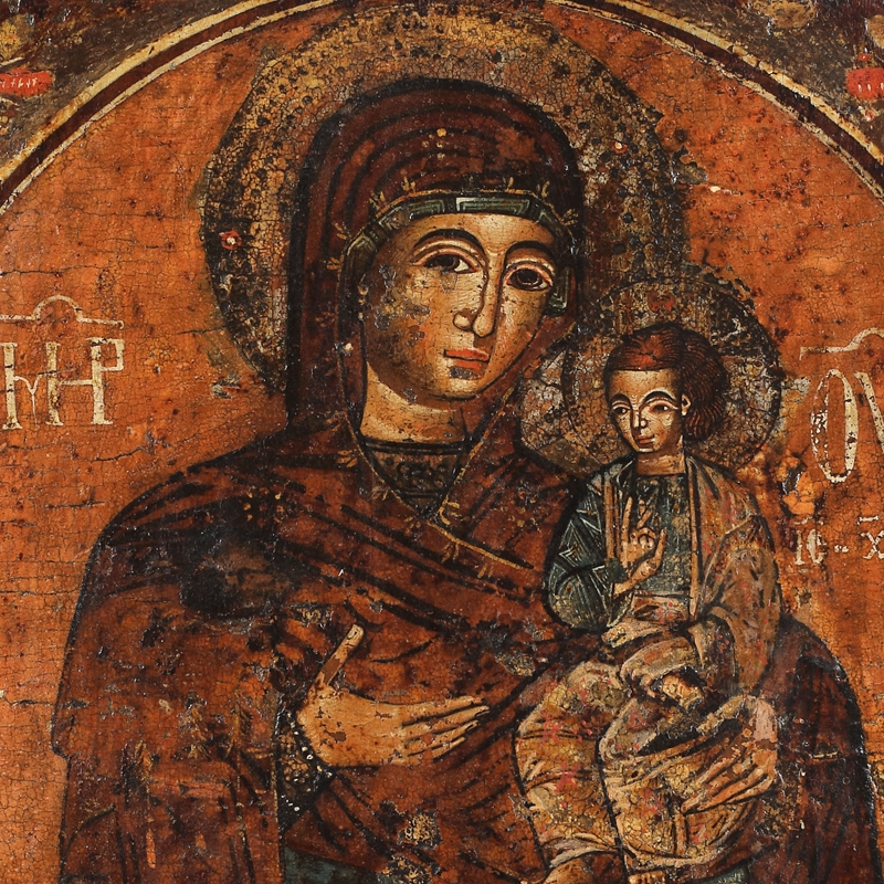 10. Icoană pe lemn, ”Maica Domnului cu Pruncul (Eleusa), Sfântul Ioan Teologul și Sfântul Mercurie”, Țara Românească, școală grecească, începutul sec. XVIII