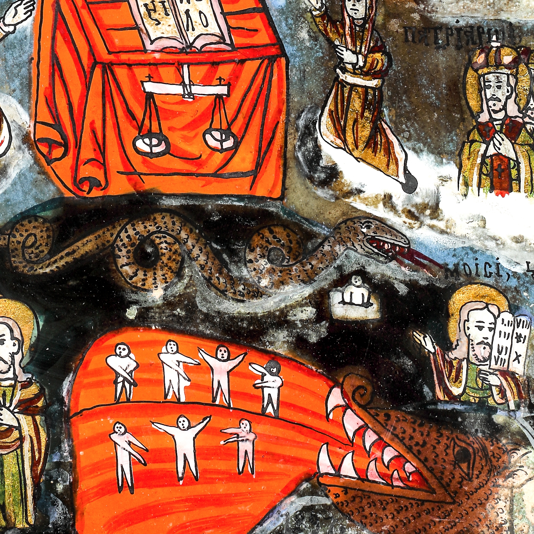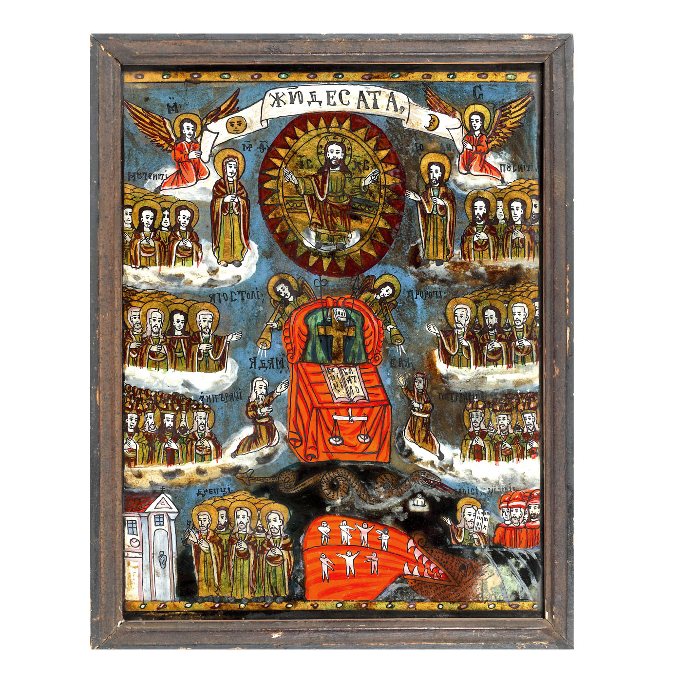 37. Icoană pe sticlă, ”Judecata de Apoi”, atelier transilvănean (Șcheii Brașovului), prima jumătate a sec. XIX, piesă foarte rară, de colecție, provine din colecția familiei ieșene Leon Sculy Logotheti