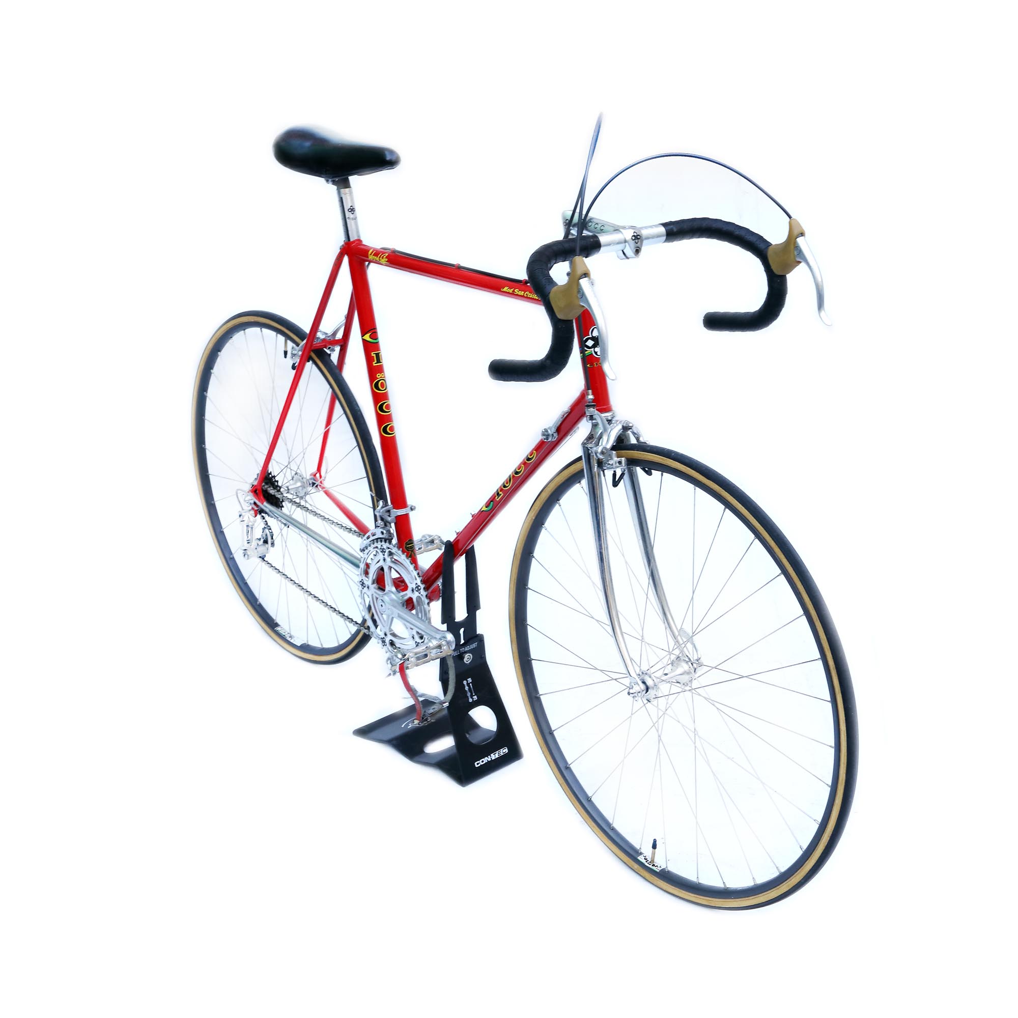 model: San Cristobal, cadrul: Columbus SL, mărime: 58, tija: S17 Nuovo Record pantografiată, ghidon: 3TTT (Tecno Tubi Torino), pedale, manete, frână: Nuovo Record, deraior față: Nuovo Record (a fost fabricat un singur an, 1978), angrenaj: Nuovo Record (pantografiat), deraior spat:-Nuovo Record, jante: Nisi Solidal, butuci/bucșe: Record, pipa/tija ghidon: 3TTT