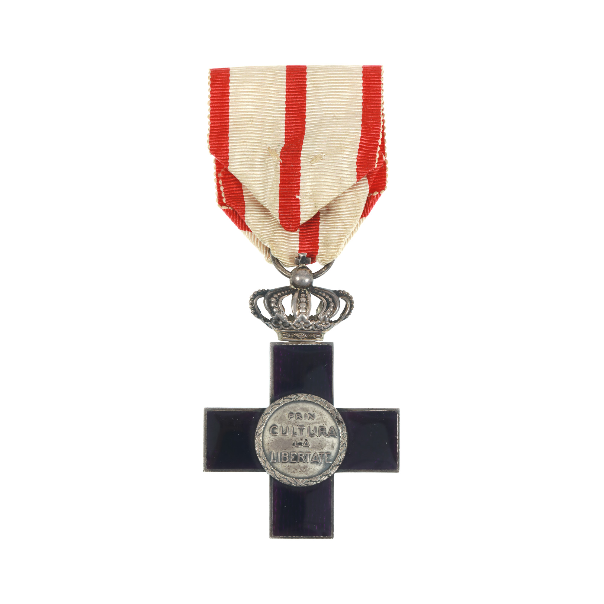 16. Ordinul "Meritul Cultural", model Carol II, cavaler 1, cu panglica pentru școală, manufactura Joseph Resch fiul, argint, perioada interbelică