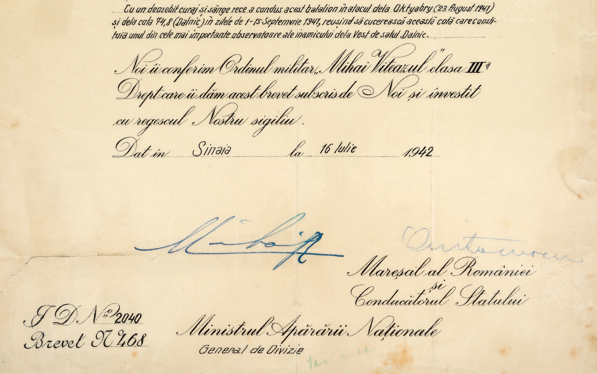 19. Ordinul ”Mihai Viteazul”, clasa III, model 1941, însoțit de brevetul semnat olograf de Regele Mihai I și Mareșalul Ion Antonescu
