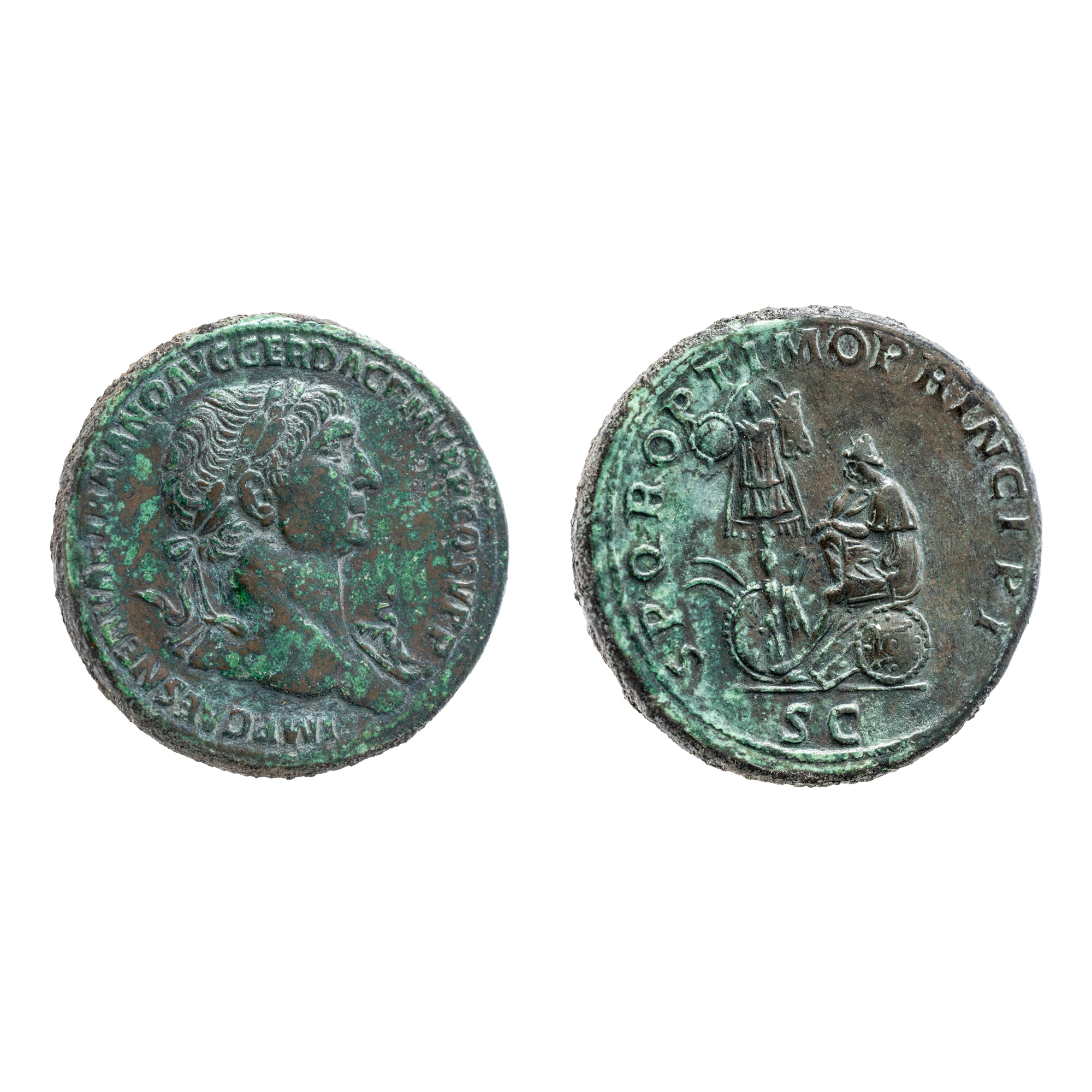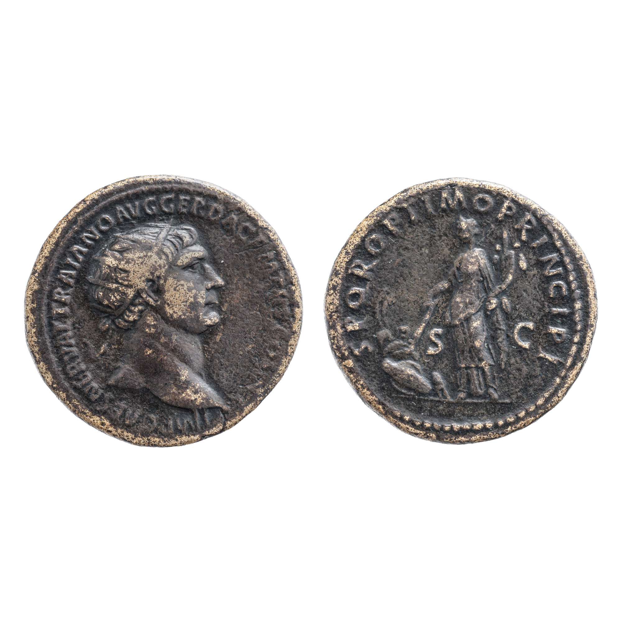 14C. Monedă Sestertius, Traian, tip Dac Capturat și Trofeul Armelor, cca. 109 e.n., piesă de excepție