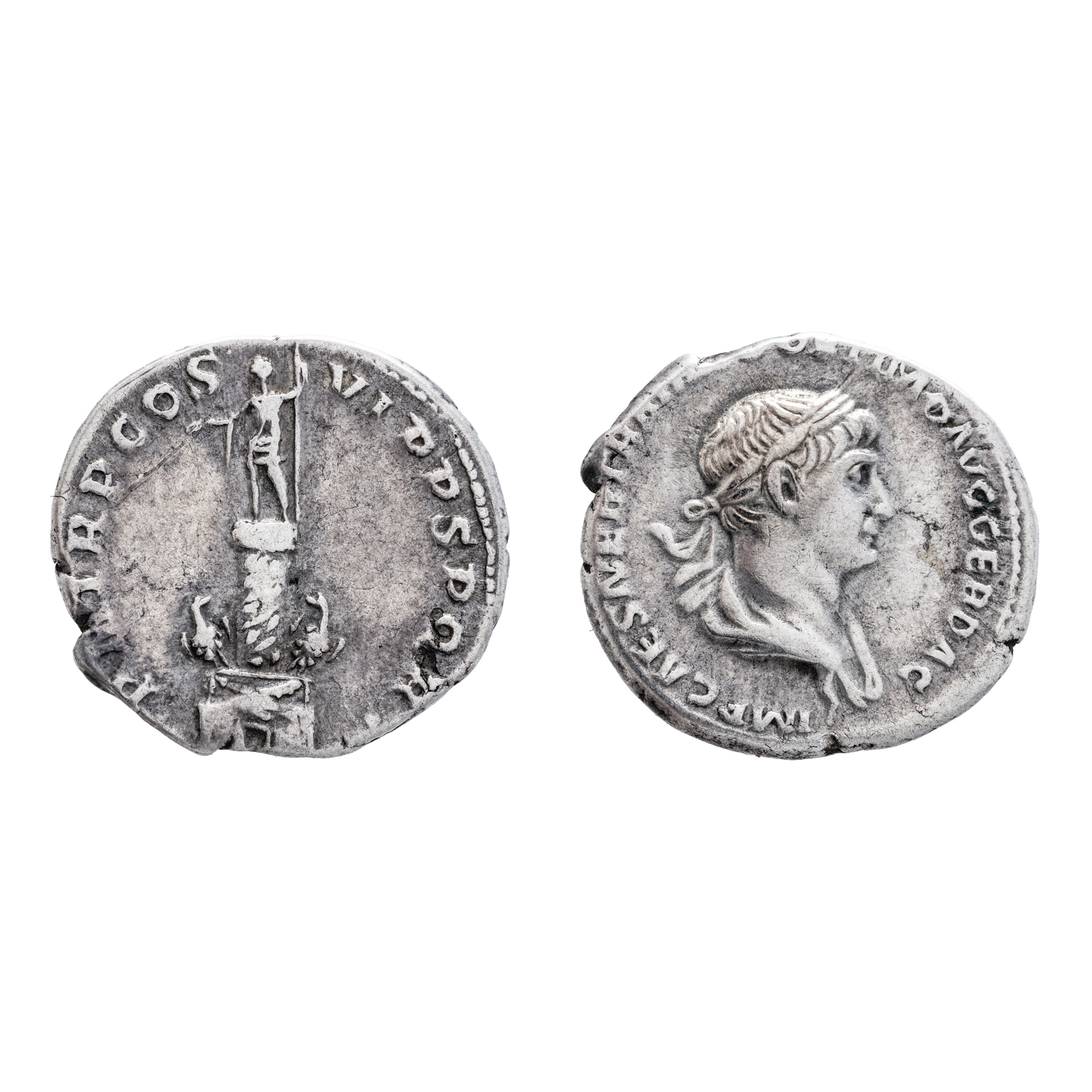 12C. Monedă Denarius, Traian, tip Columna, monumentul dedicat victoriei asupra Daciei, 114-115 e.n., argint