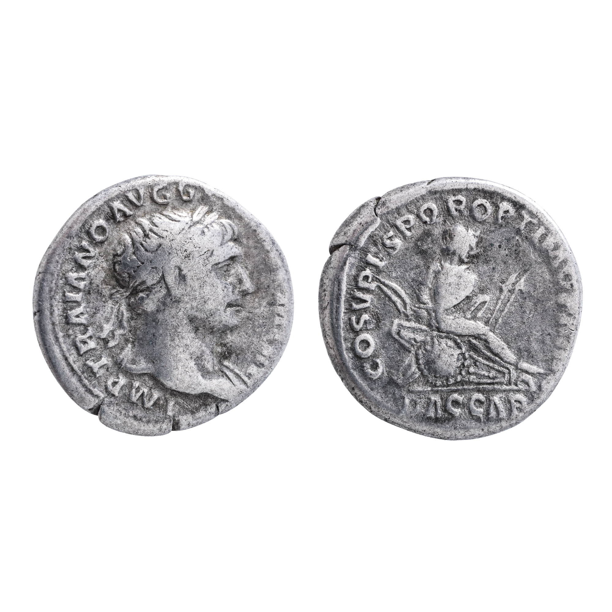 10C. Monedă Denarius, Traian, tip Dac Captiv, emisă în urma Războaielor Dacice, 108-109 e.n., argint