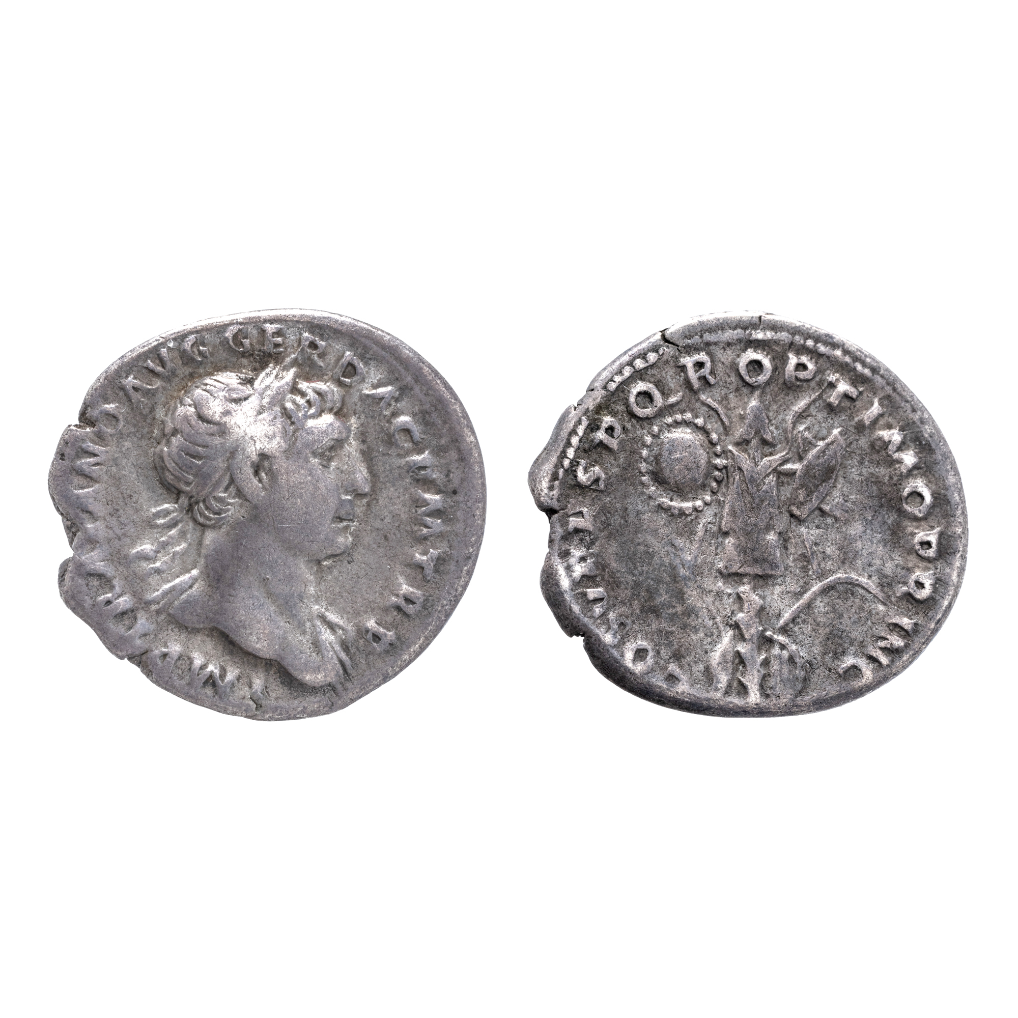 9C. Monedă Denarius, Traian, tip Trofeul Armelor, imortalizat prin monumentul de la Adamclisi, 107 e.n., argint