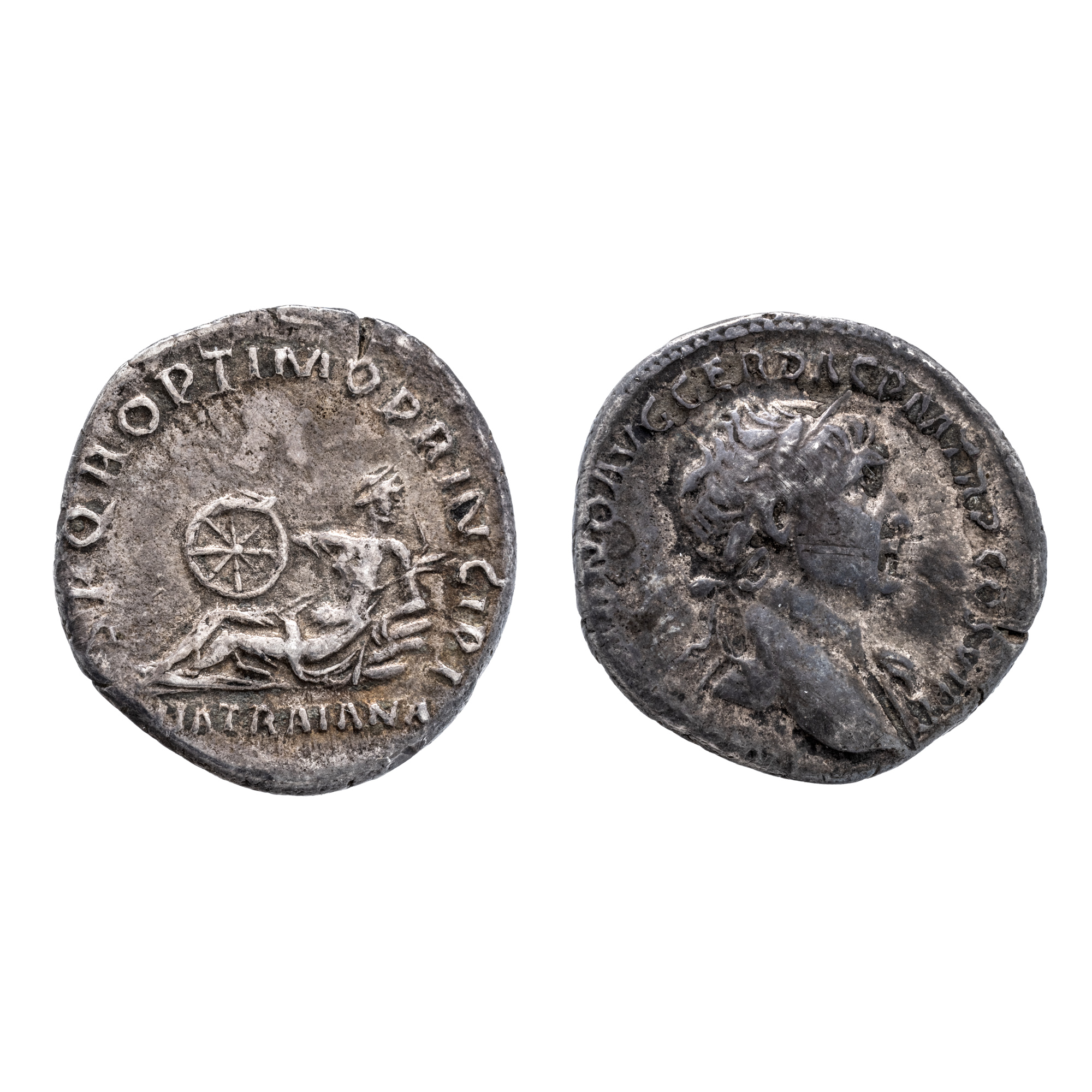 11C. Monedă Denarius, Traian, tip Via Traiana, 112-114 e.n., argint